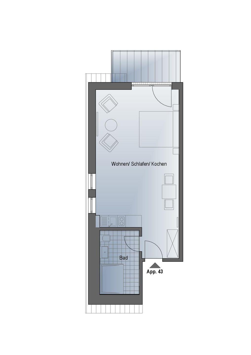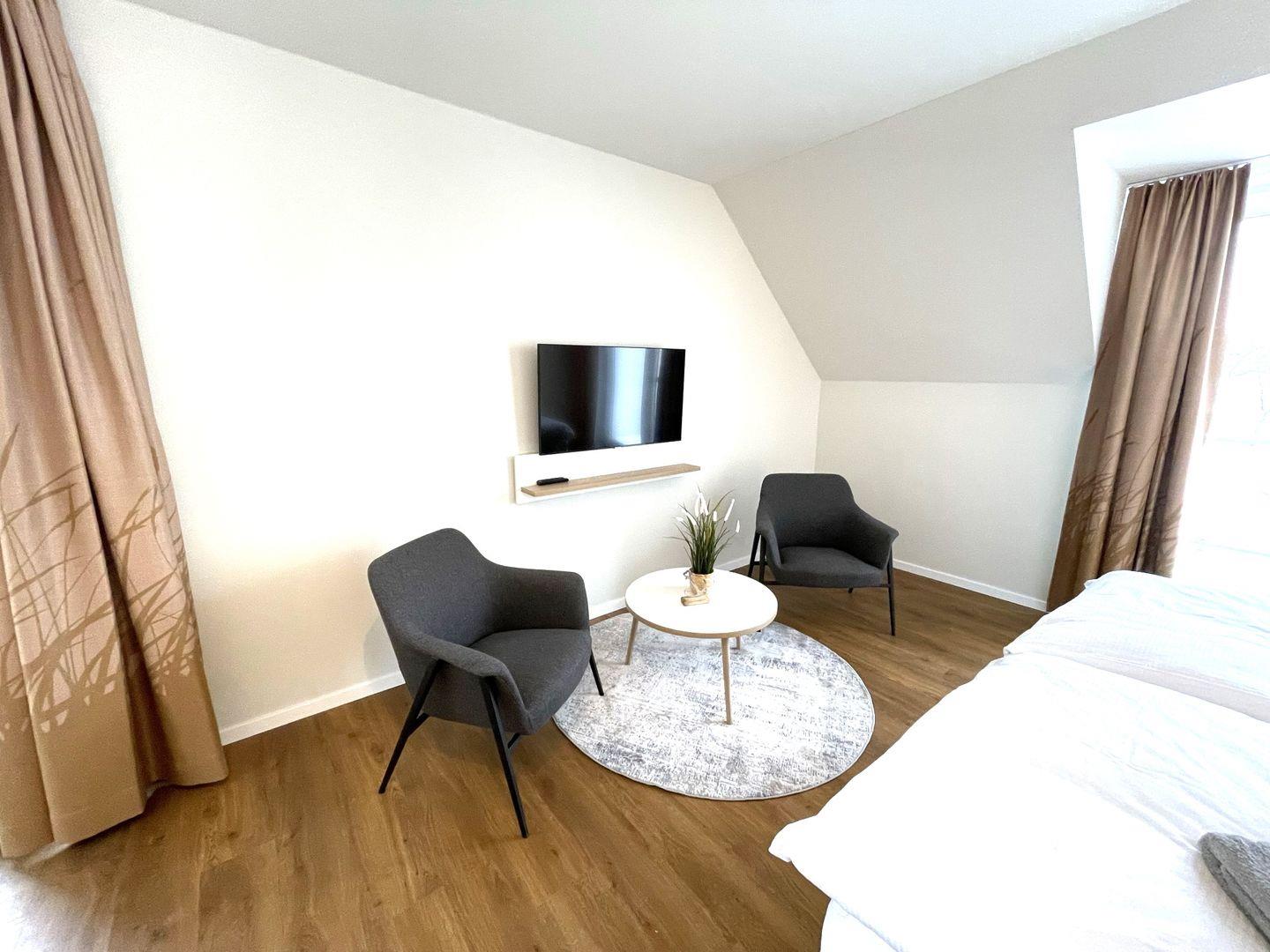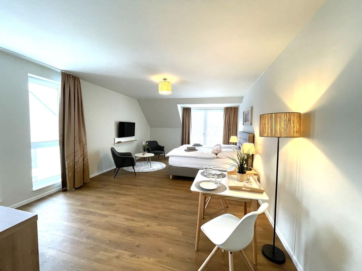 Das komfortable Appartement bietet auf 40 qm Platz für bis zu 2 Personen. Der gemütliche Wohn- und Schlafbereich besitzt ein modernes Doppelbett (1,80m x 2,00m), auf welchem Sie Ihre Erholung finden werden. Zu Ihrem Entertainment dient ein moderner Flatscreen-TV. Ein Kinderbett sowie ein Hochstuhl können auf Anfrage hinzugebucht werden.