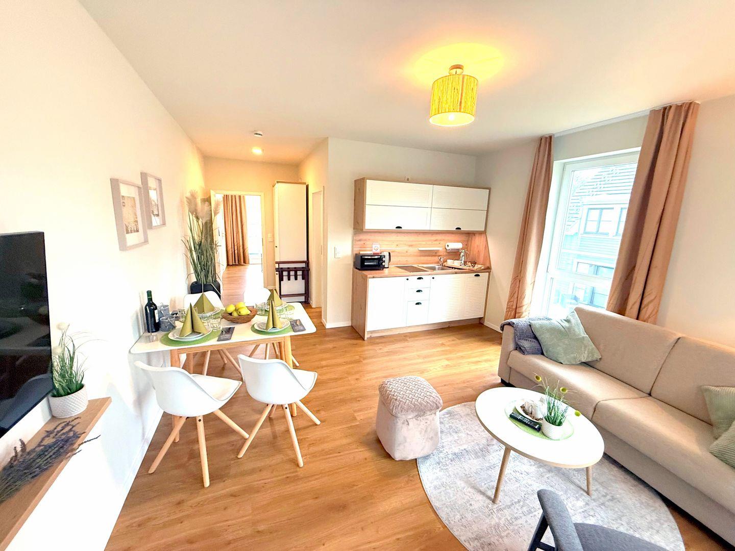 Das komfortable Appartement bietet auf 43 qm viel Platz für bis zu 4 Personen. Der gemütliche Wohnbereich besitzt ein bequemes Sofa, welches sich mit wenigen Handgriffen zu einer Doppelschlafcouch (1,40m x 2,00m) umfunktionieren lässt, und sorgt mit einem Flat Screen-TV für reichlich Entertainment.