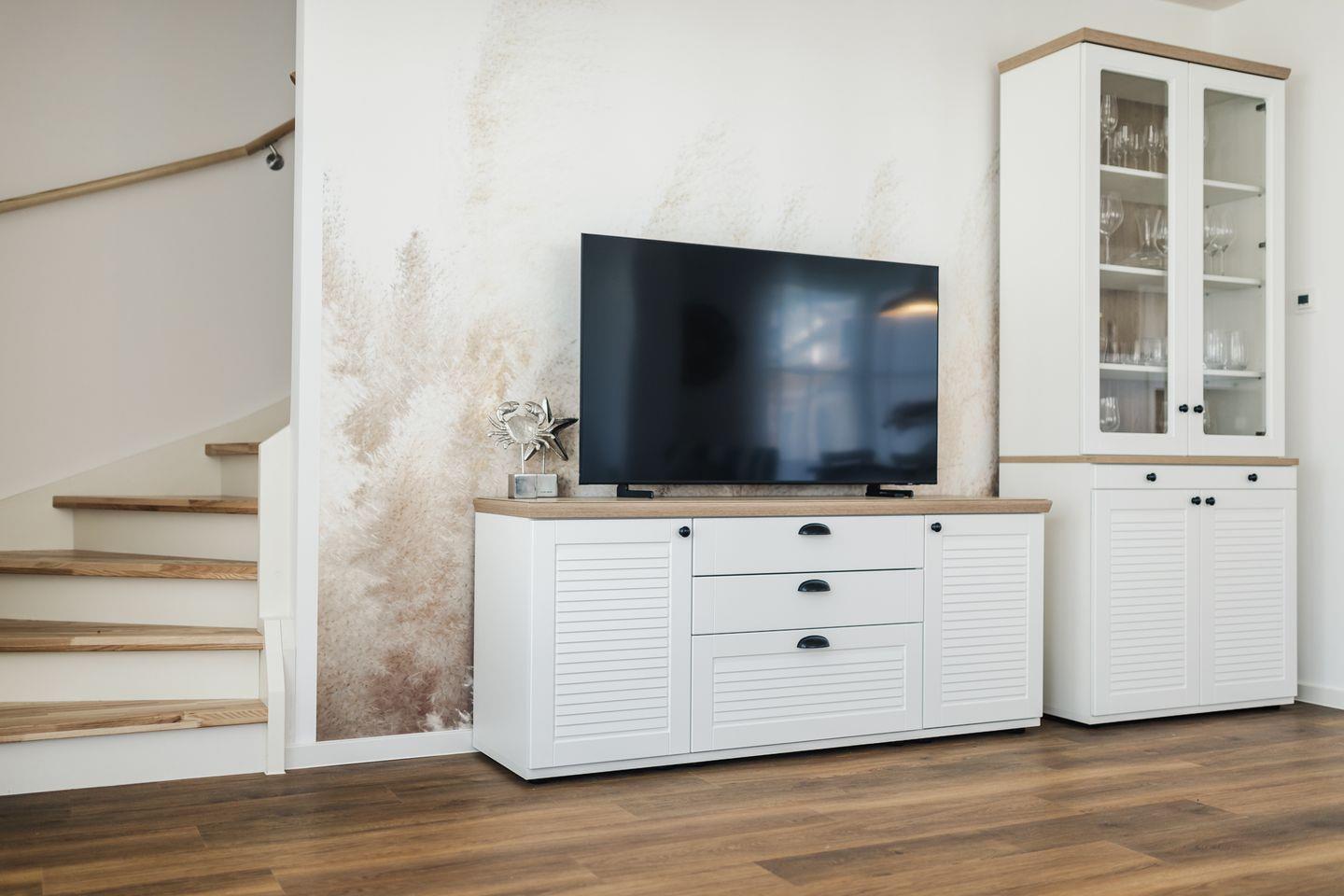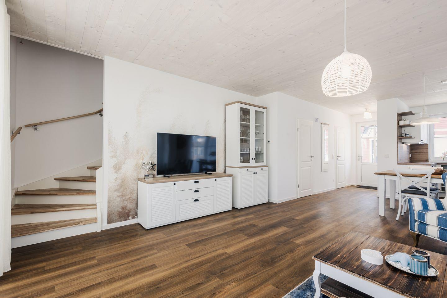 Das gemütliche Ferienhaus bietet auf ca. 100 qm viel Platz für bis zu 4 Personen. Der komfortable Wohnbereich besitzt ein bequemes Sofa und sorgt mit einem Flat Screen-TV für Entertainment.