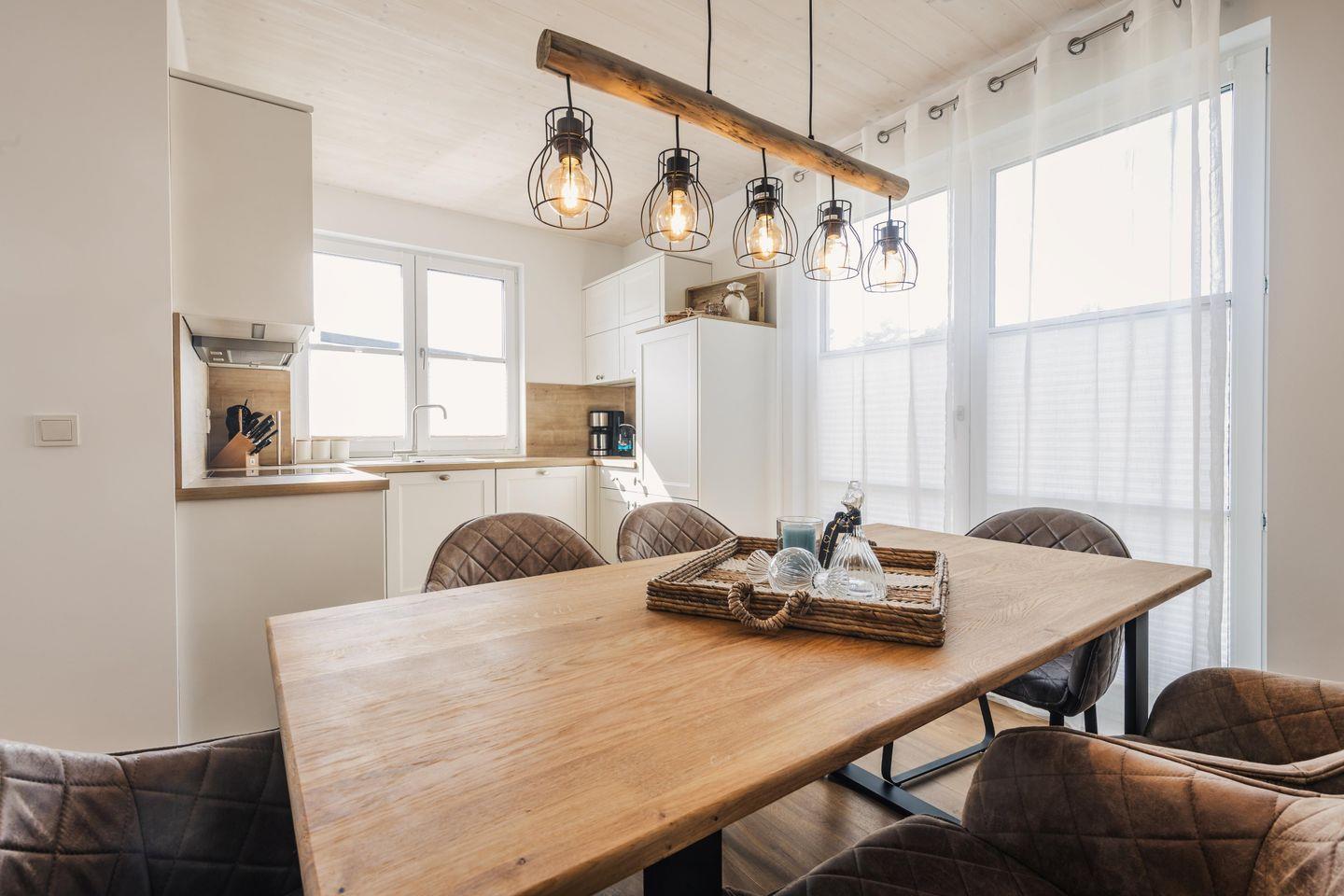 Die offene Küchenzeile mit anliegendem Essbereich ist mit einen Geschirrspüler, Kühlschrank mit Gefrierfach, Kaffeemaschine, 4-Platten-Ceranfeld und Wasserkocher ausgestattet. Natürlich finden Sie hier auch Geschirr und Besteck sowie weitere Küchengeräte und Utensilien.