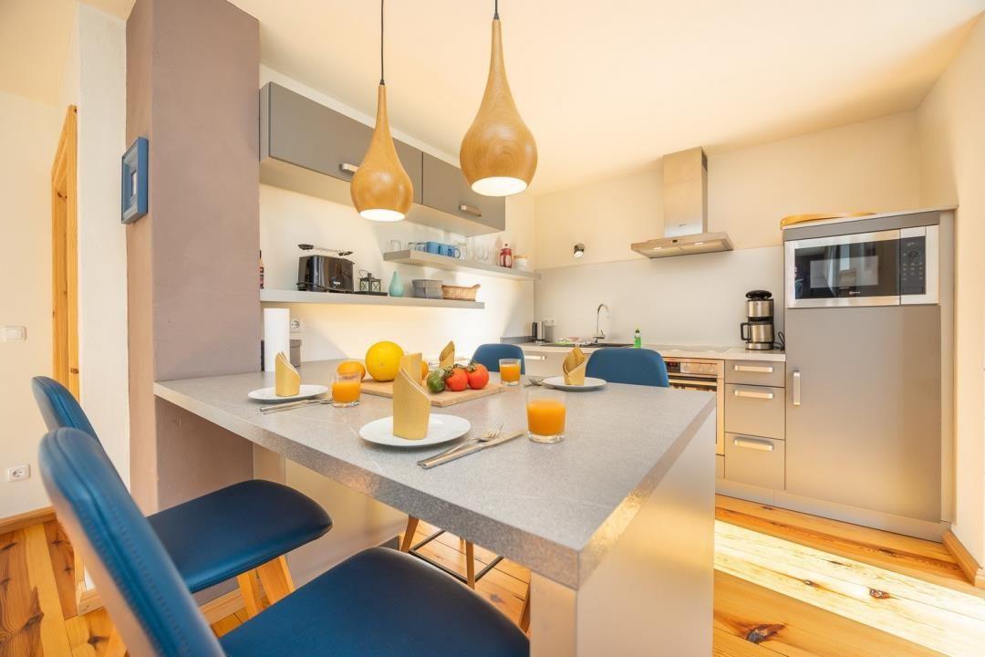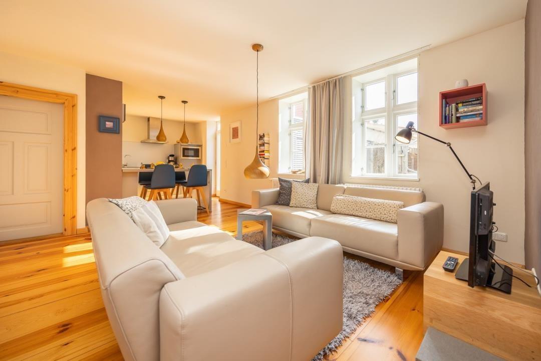 Die Ferienwohnung "HAFEN EINS" befindet sich im Erdgeschoss eines unter Denkmalschutz stehenden Hauses, in dem ehemals Boote u.a. für den Fischfang gebaut wurden. Damit erklären sich die etwas niedrigeren Türrahmen und auch der reizvolle Blick