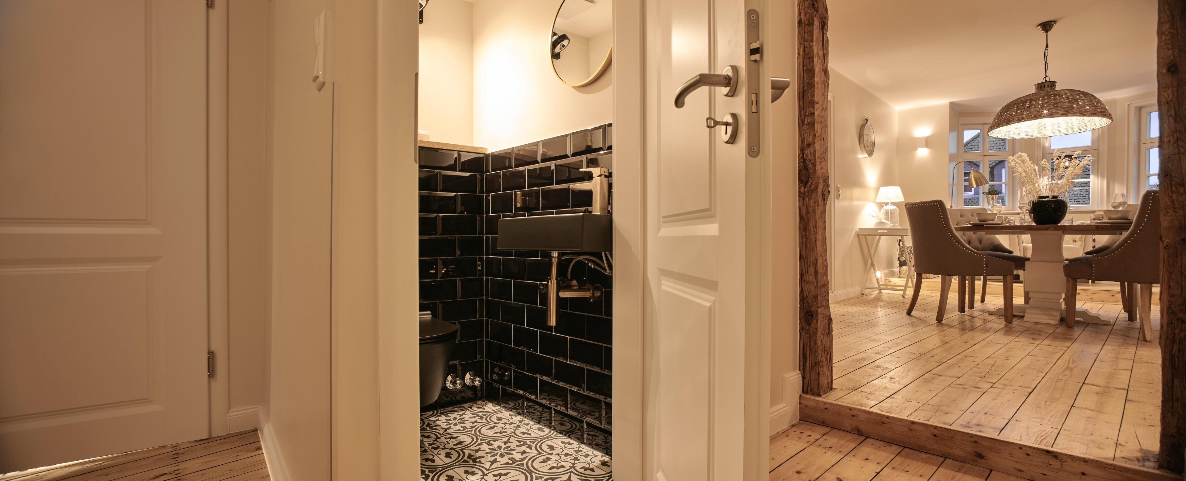 Aus dem Eingangs-/Flurbereich gelangen Sie in das Bad mit großzügiger begehbarer Rain-Shower-Dusche, Designfliesen und hochwertigsten Armaturen. Ihnen als Gast stehen sowohl flauschige Handtücher (im Wäschepakt enthalten) sowie wohlduftende Pflegeprodukte der nachhaltigen Kosmetiklinie Stop Water while using me kostenfrei zur Verfügung.