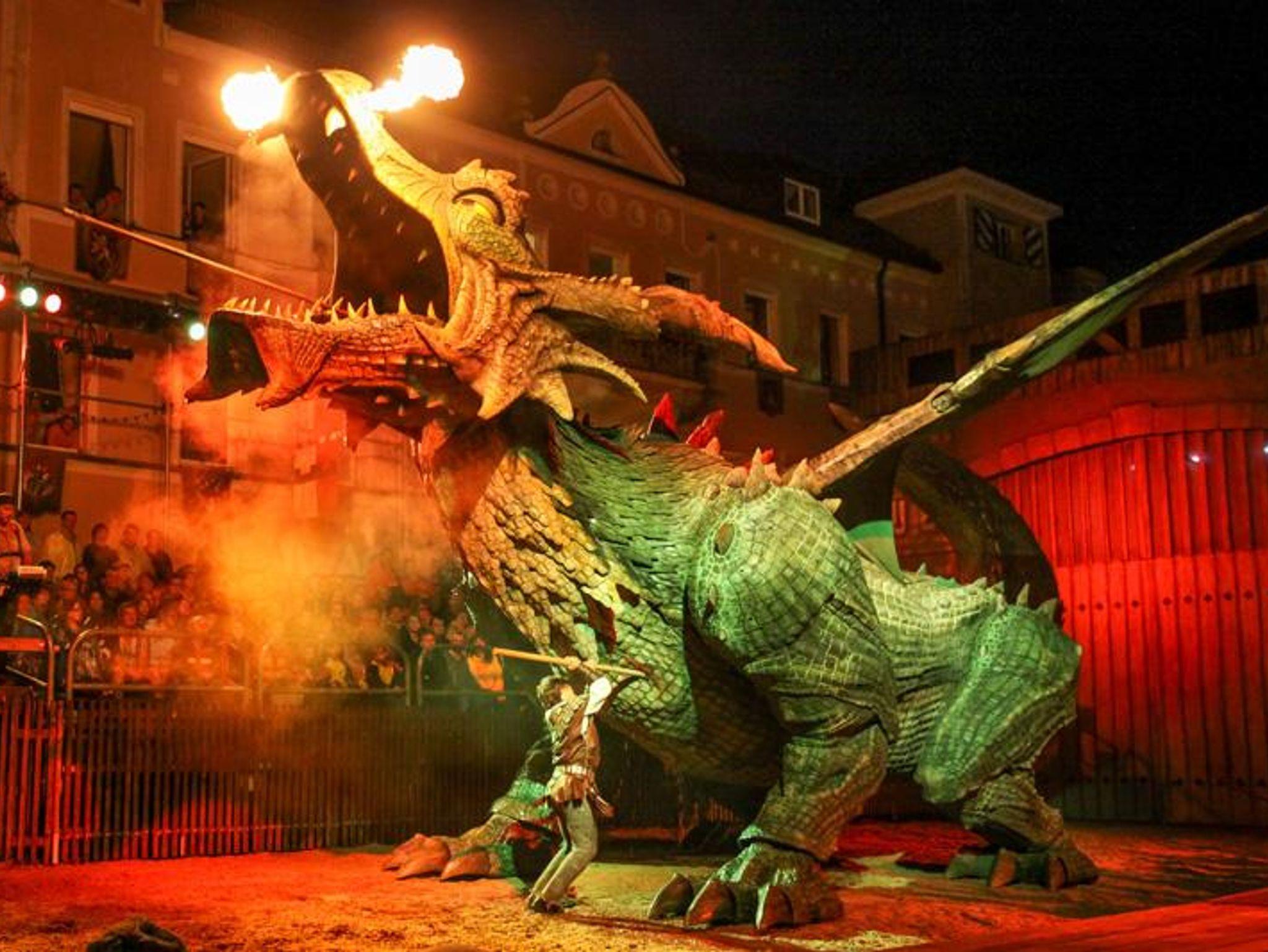 Erleben Sie in den Sommermonaten Juli und August das älteste deutsche Festspiel Den Drachenstich in der Stadt Furth im Wald mit dem größten Schreitroboter der Welt.