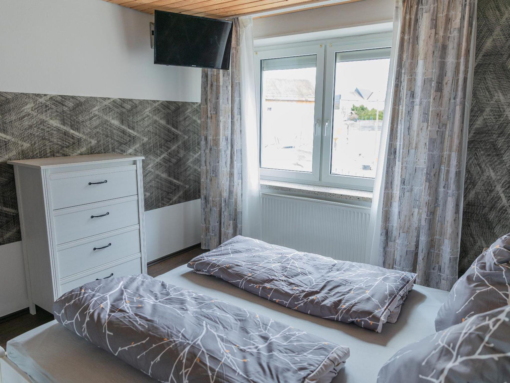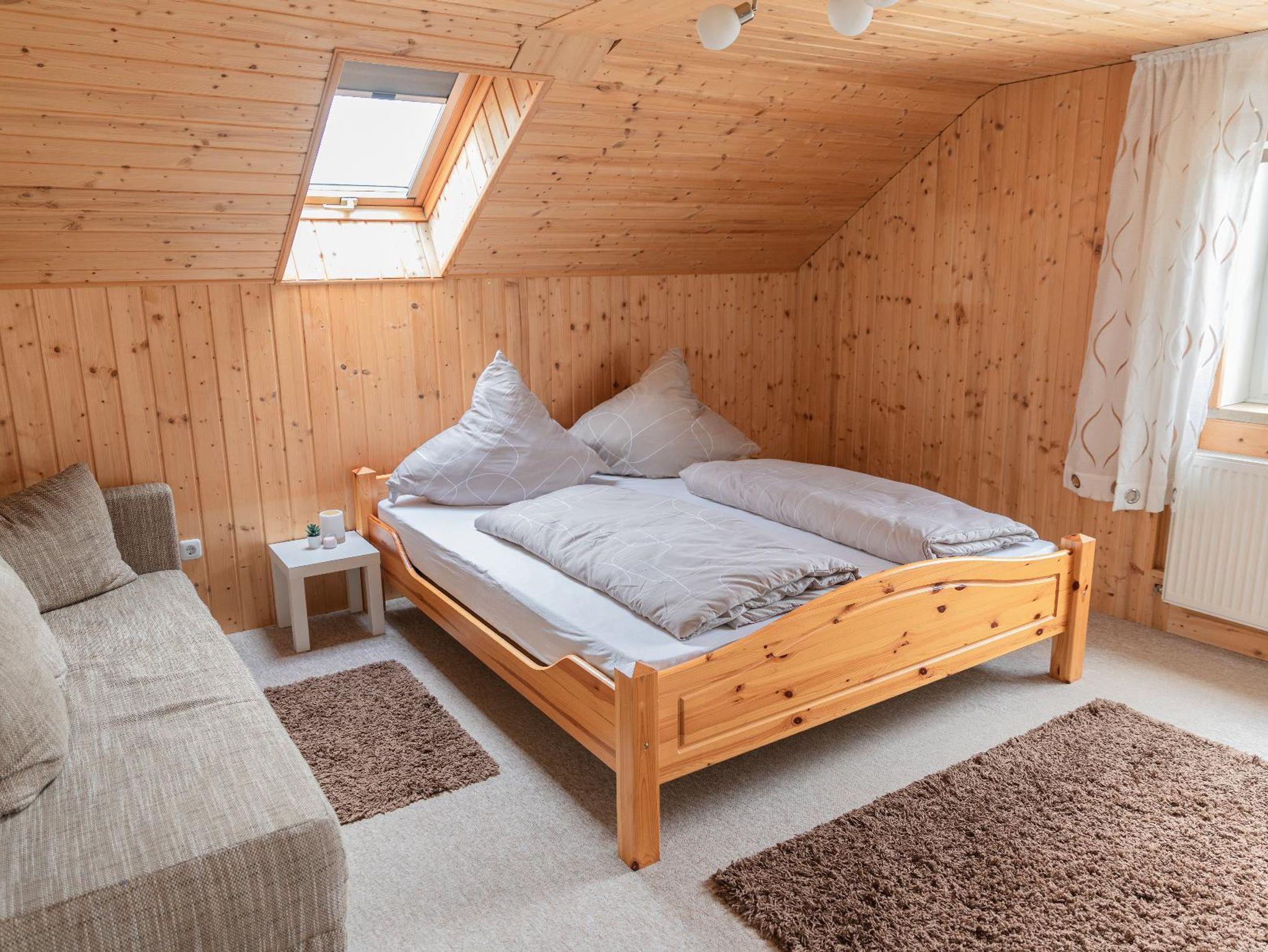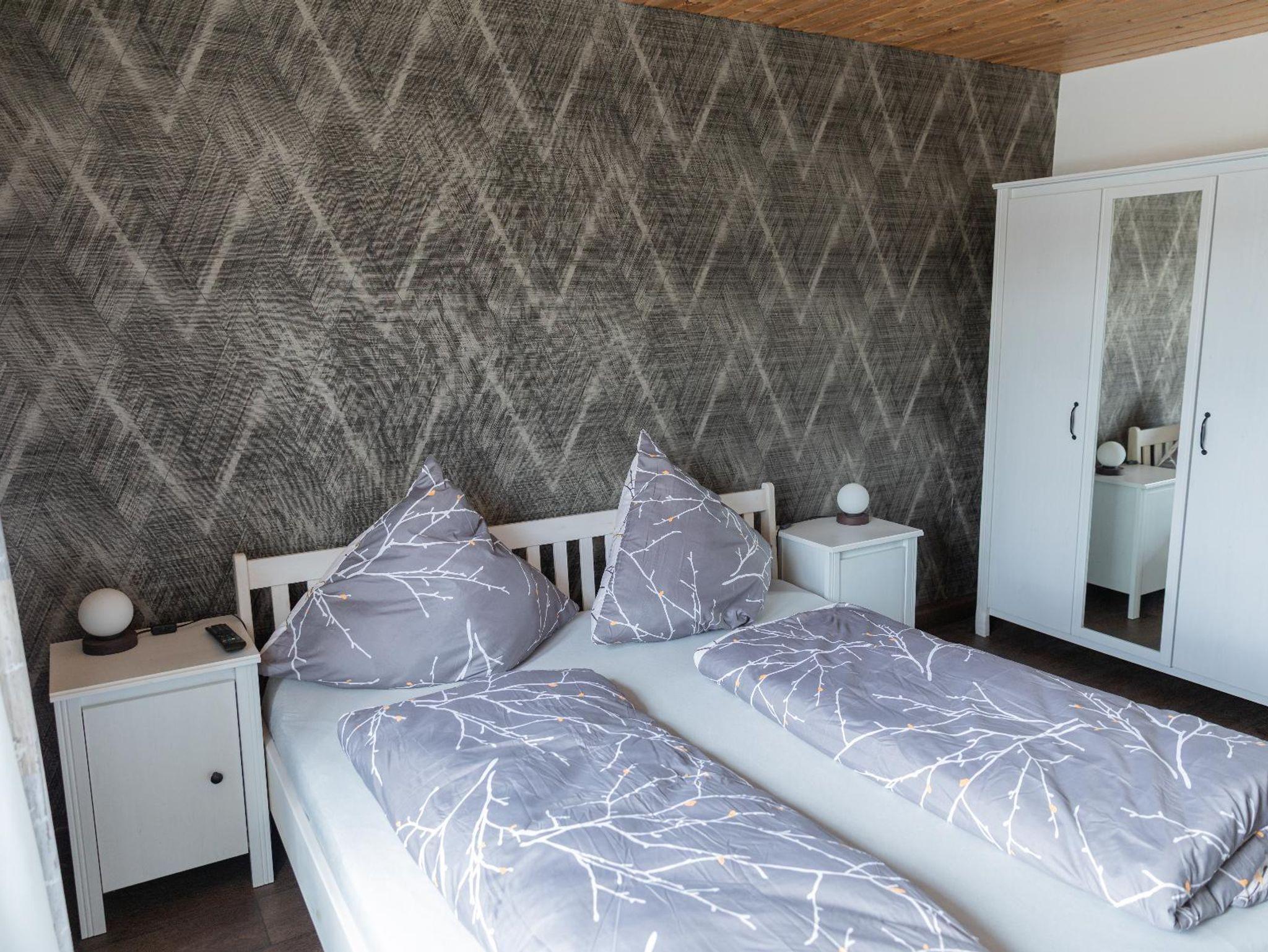 Im erstem Stock befinden sich zwei weitere Schlafzimmer auf 45 qm mit einem Doppelbett und einem einfachem Bett als Schlafmöglichkeit. Für zusätzlichem Stauraum gibt es einen Kleiderschrank und Nachttische mit Leselampen. Ebenfalls in der oberen Etage befindet sich ein Badezimmer mit Waschtisch, WC und einer Dusche.