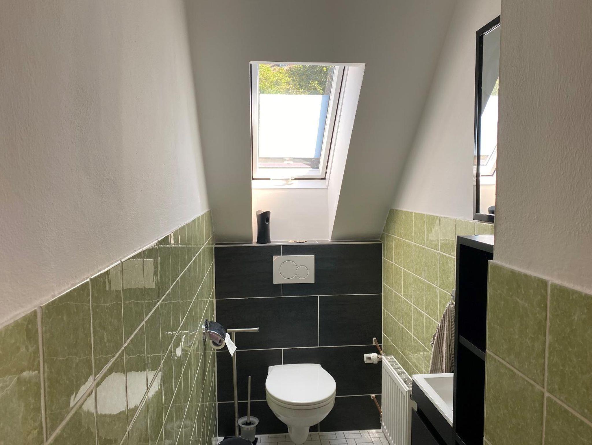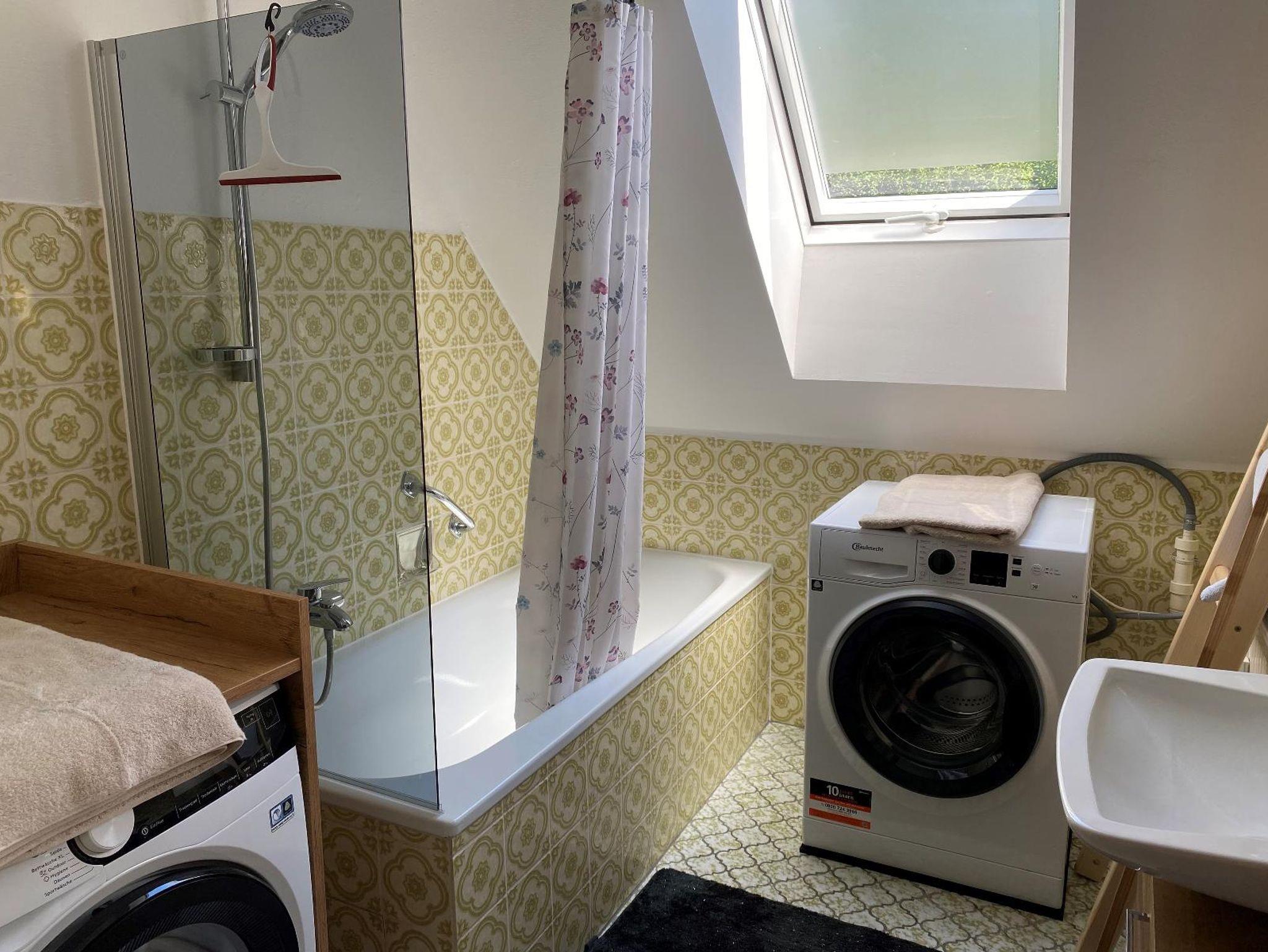 Das Badezimmer ist mit einer Waschmaschine sowie einem Trockner ausgestattet, sodass auch längere Aufenthalte unkompliziert gestaltet werden können. Für zusätzlichen Komfort befindet sich die Toilette in einem separaten Raum.