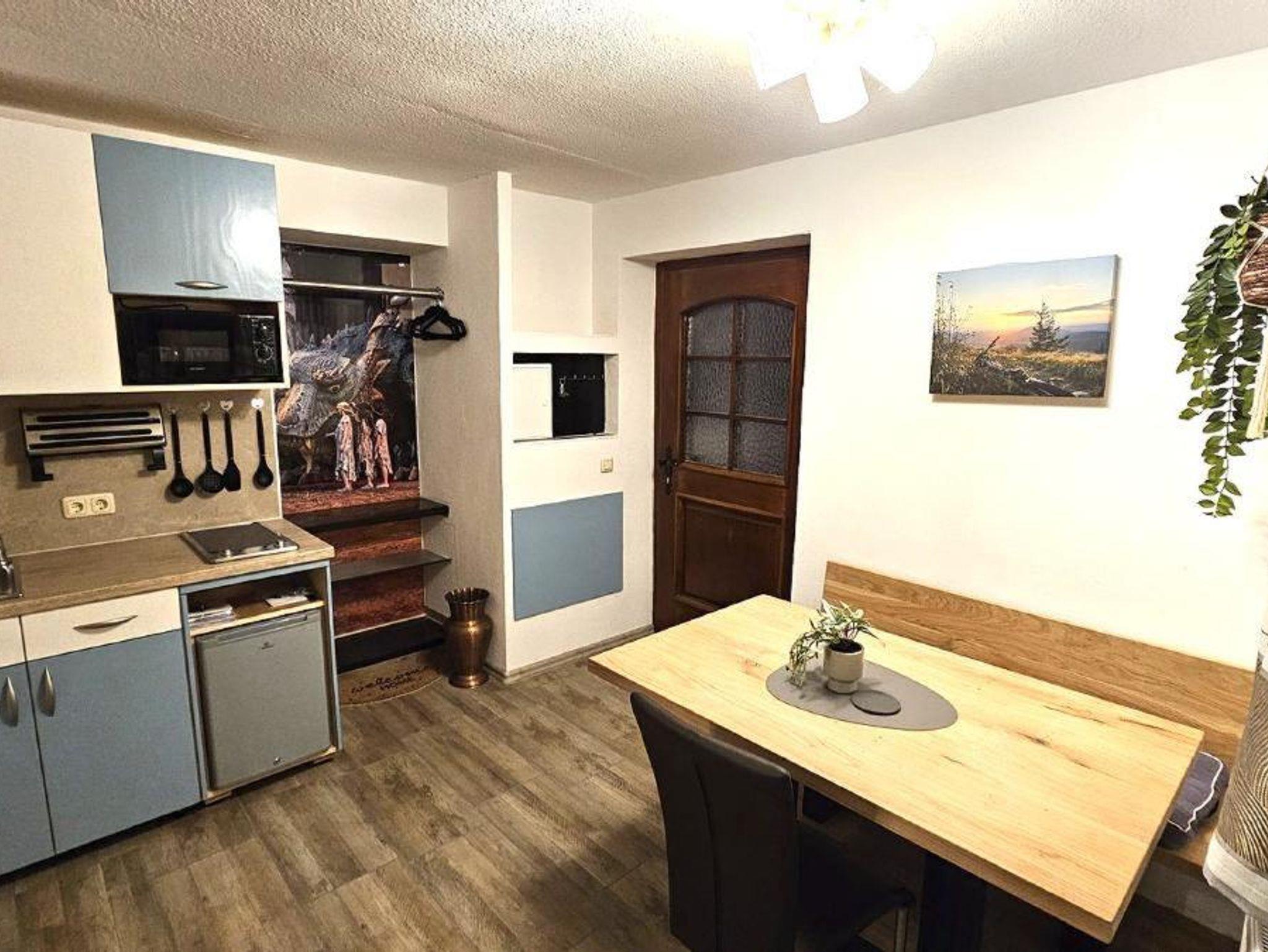 Unsere kleine gemütliche Ferienwohnung liegt im Erdgeschoss und bietet auf 25 Quadratmetern Platz für 2 Personen. Sie verfügt über einen separaten Eingang. Die erst kürzlich kernsanierte Wohnung besteht aus einem Schlafbereich, einem Wohnbereich sowie einem Badezimmer. Das Schlafzimmer ist mit Doppelbett und SAT-TV ausgestattet. Im Wohnbereich befindet sich eine kleine Küche, die mit einem Kühlschrank, Herdplatte mit zwei Kochfeldern, Wasserkocher, Toaster, Eierkocher, Mikrowelle und einer Tassimo vivy 2 Kaffeemaschine von Bosch ausgestattet ist. Das Badezimmer ist mit Dusche und WC ausgestattet. Haustiere sind generell kein Problem. Berücksichtigen Sie dabei aber bitte die Größe der Ferienwohnung. Das WLAN kann kostenfrei genutzt werden. Bettwäsche und Handtücher sind ebenfalls im Preis inbegriffen.