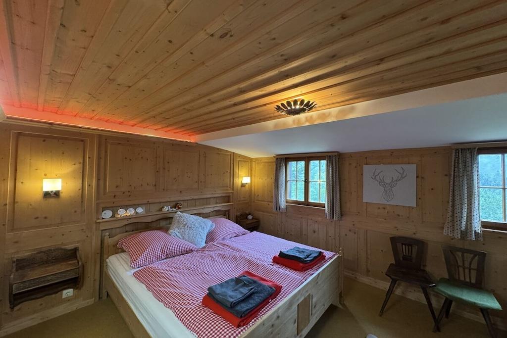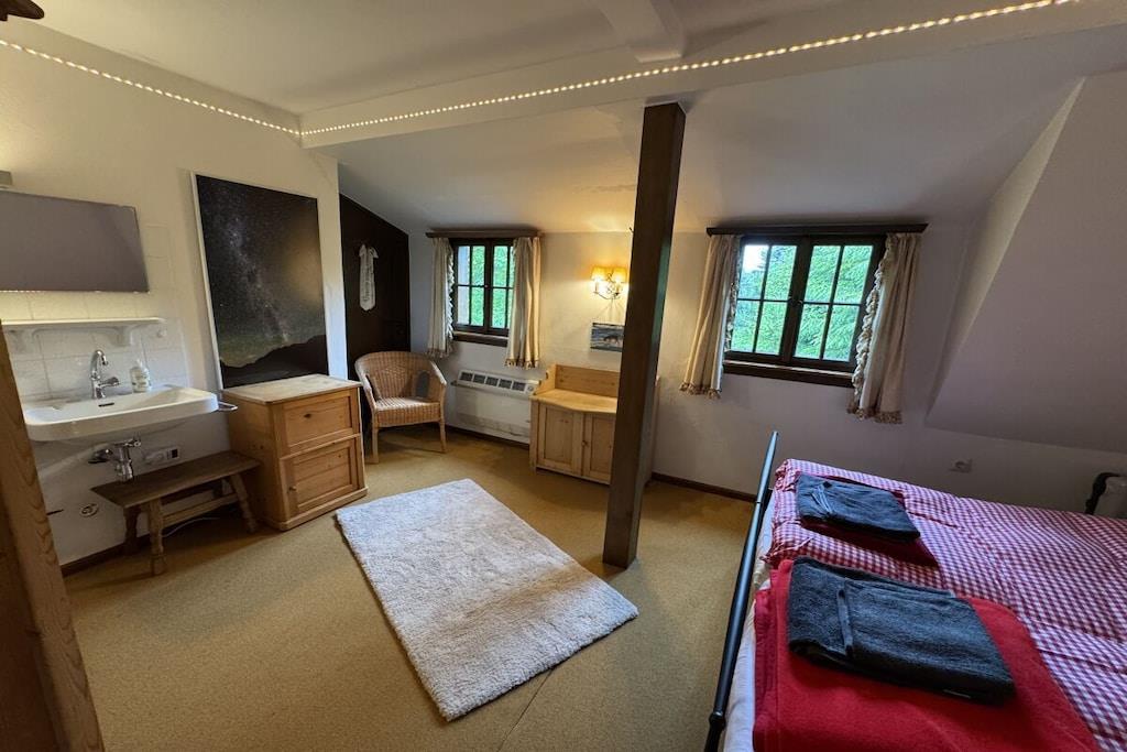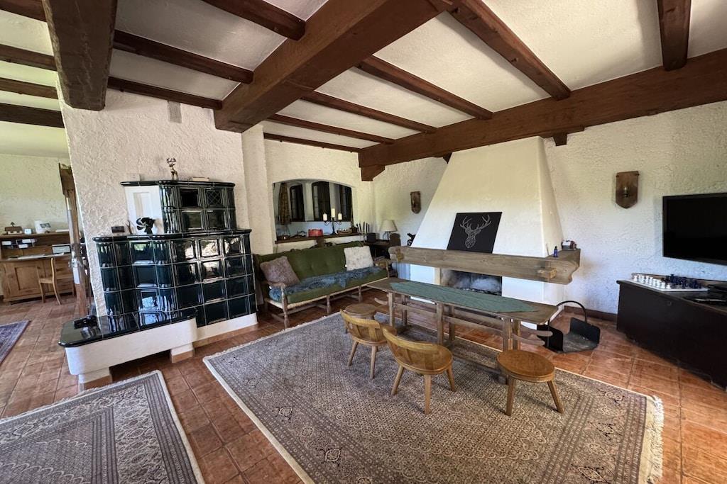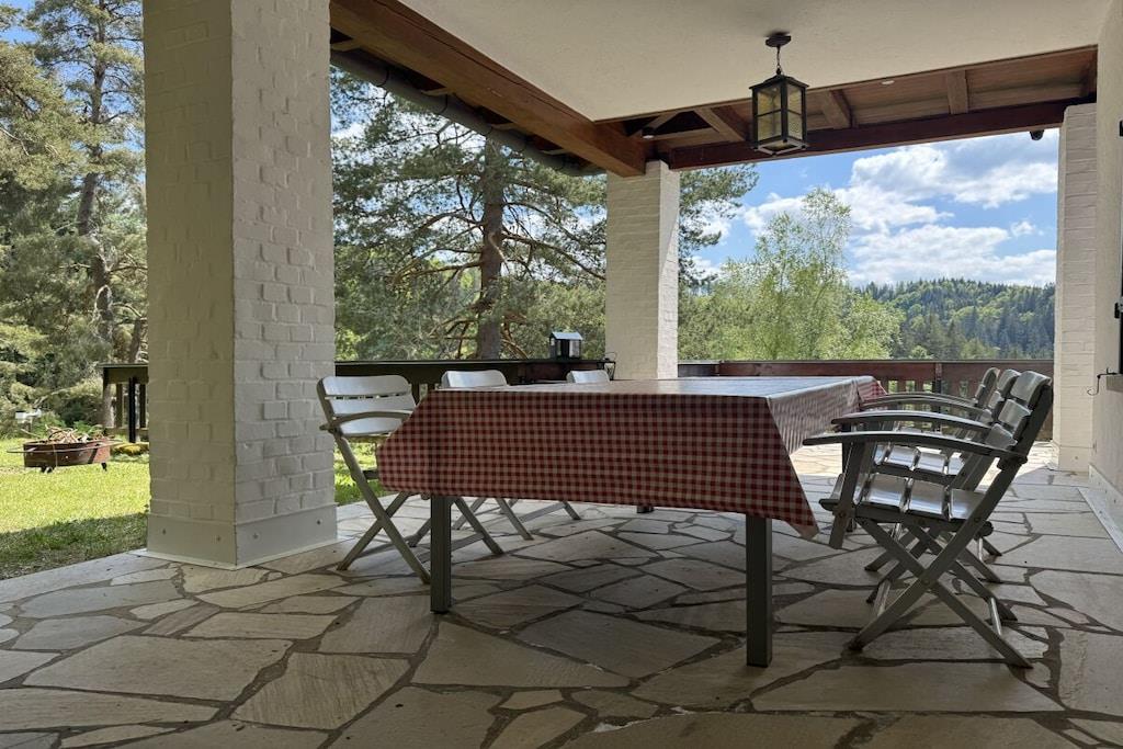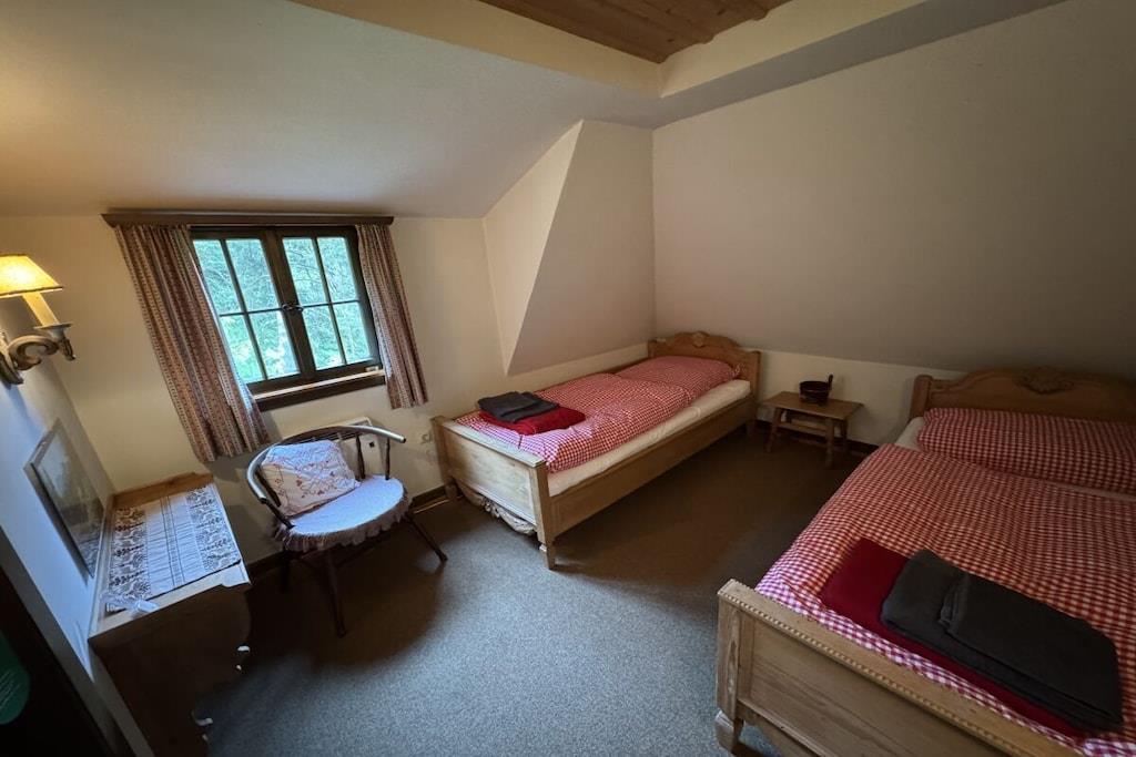 Absolute Alleinlage mitten im Wald mit Platz für bis zu 10 Personen, mit eingezäuntem Garten und frischem Quellwasser, Offenem Kamin und Kachelofen, WLAN und E-Ladestation. Riesige, zur Hälfte überdachte Süd-Terrasse mit Ausblick ins sagenumwobene Wagnerstal und die Kajetankapelle. Voll ausgestattete Küche mit Herd, Backofen, Geschirrspüler, Thermomix, Airfryer, Toaster. 5 Schlafzimmer mit bequemen Betten jeweils mit Waschbecken. Bettwäsche, Dusch- und Handtücher inbegriffen. Badezimmerausstattung: 1 Badezimmer mit Dusche 1 Bad mit Dusche und WC separat am "Patrone"-Zimmer - NEU 2026 1 Gäste WC im Obergeschoss 1 Gäste WC im Untergeschoss
