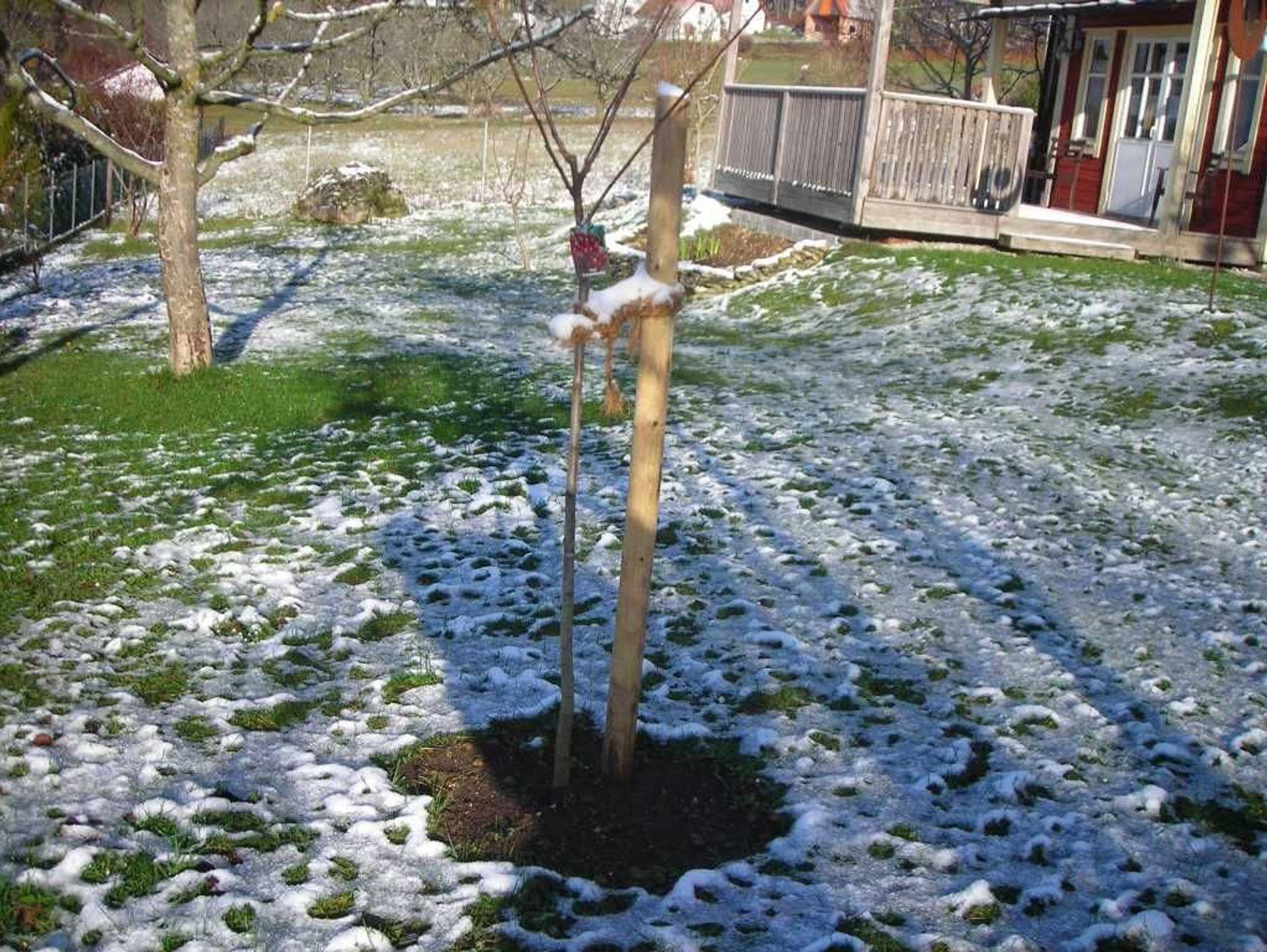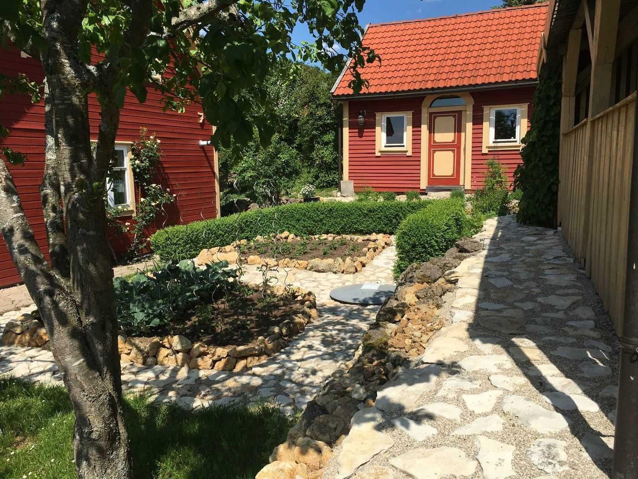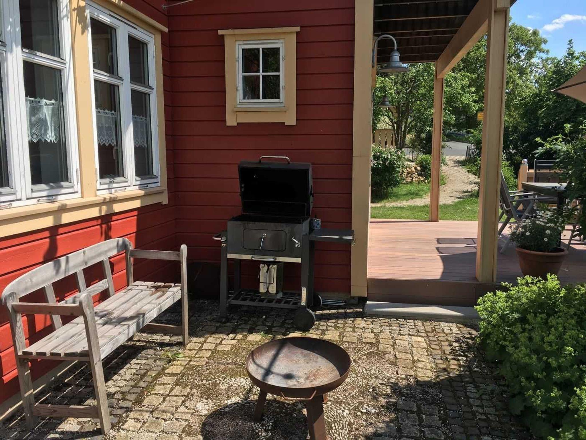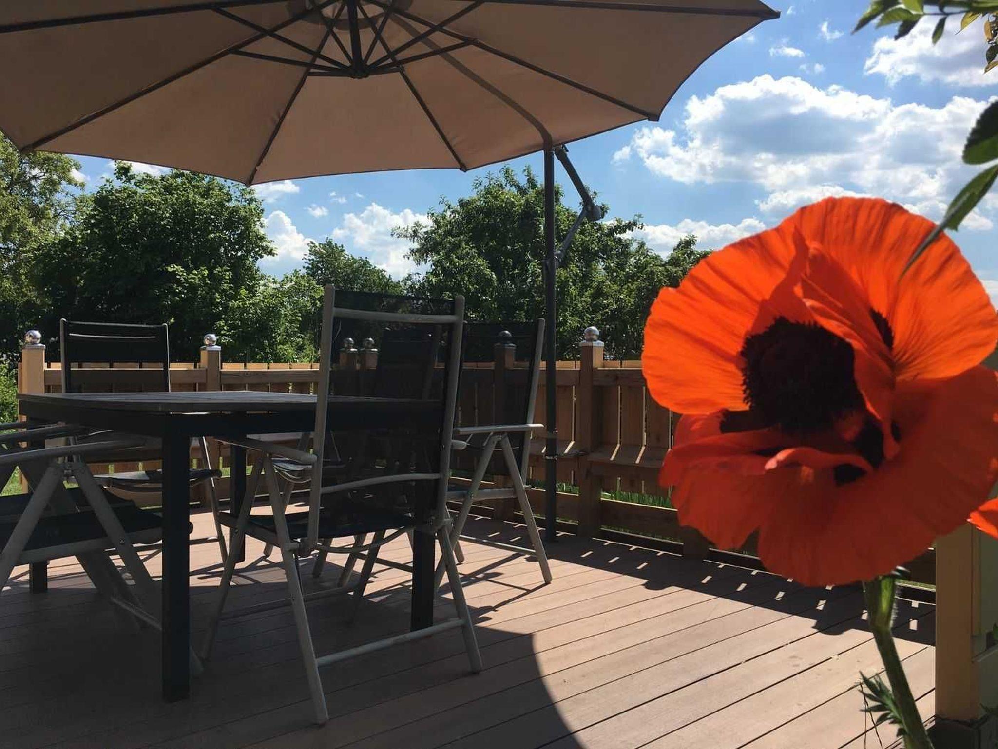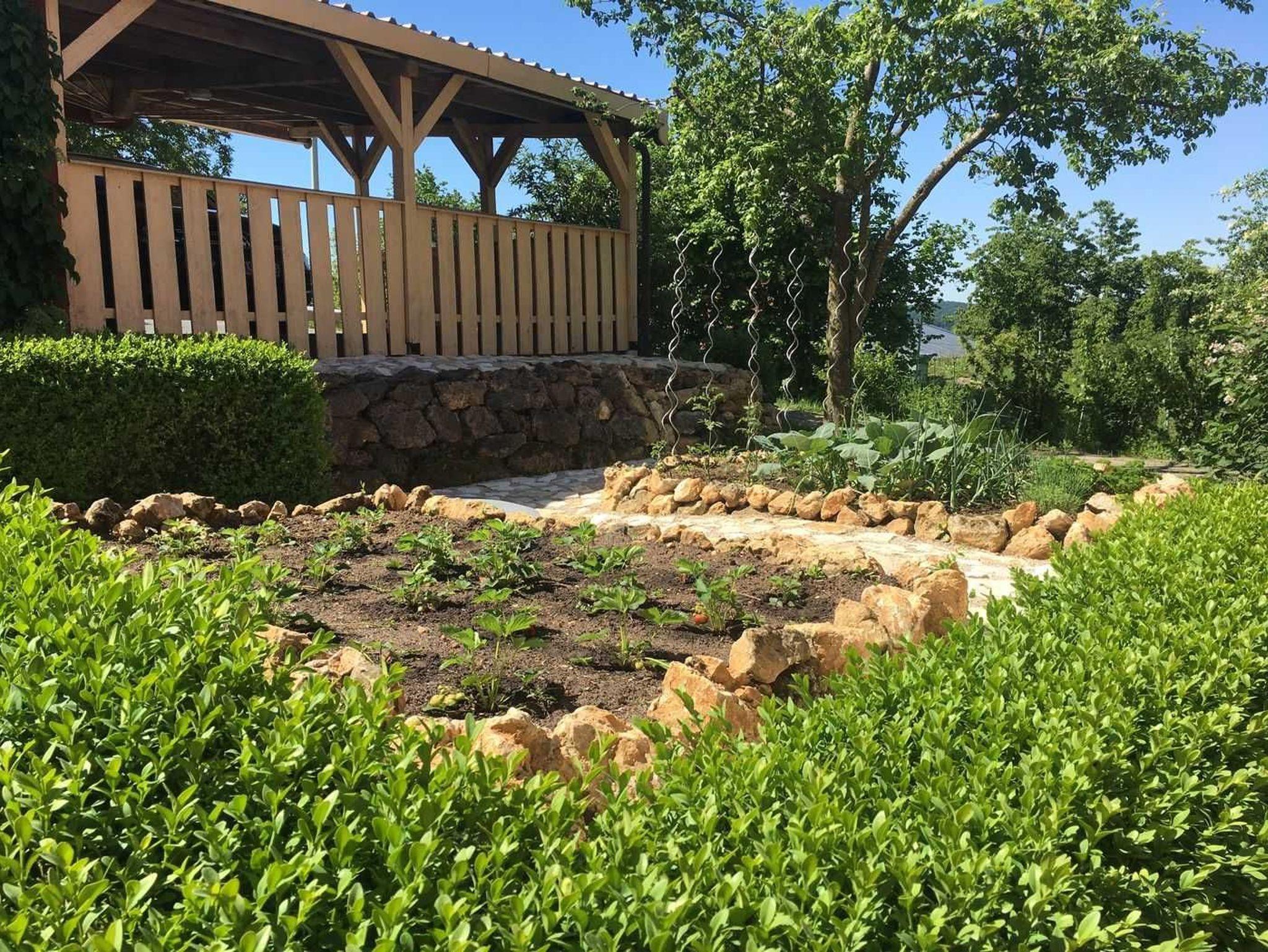 Der Garten bietet ein großes Wiesengrundstück mit Gartengrill, ein Gemüsebeet und Obstbäume, Je nach Jahreszeit können dort auch die Früchte geerntet werden.
