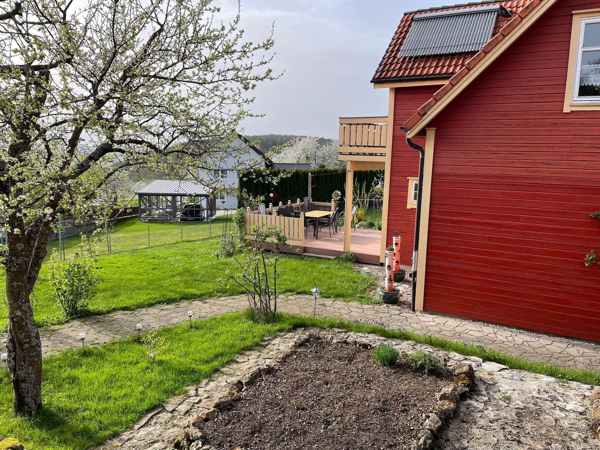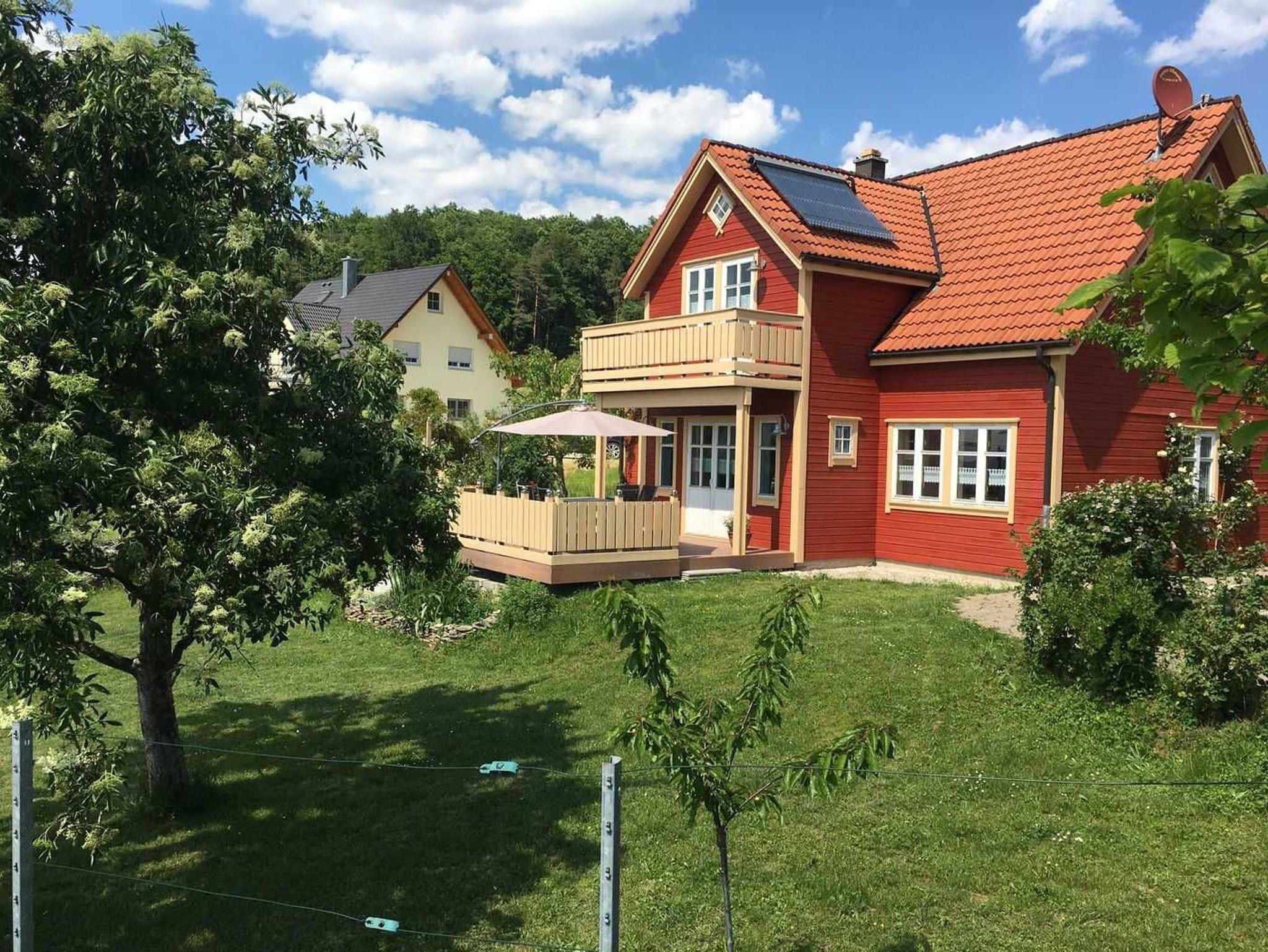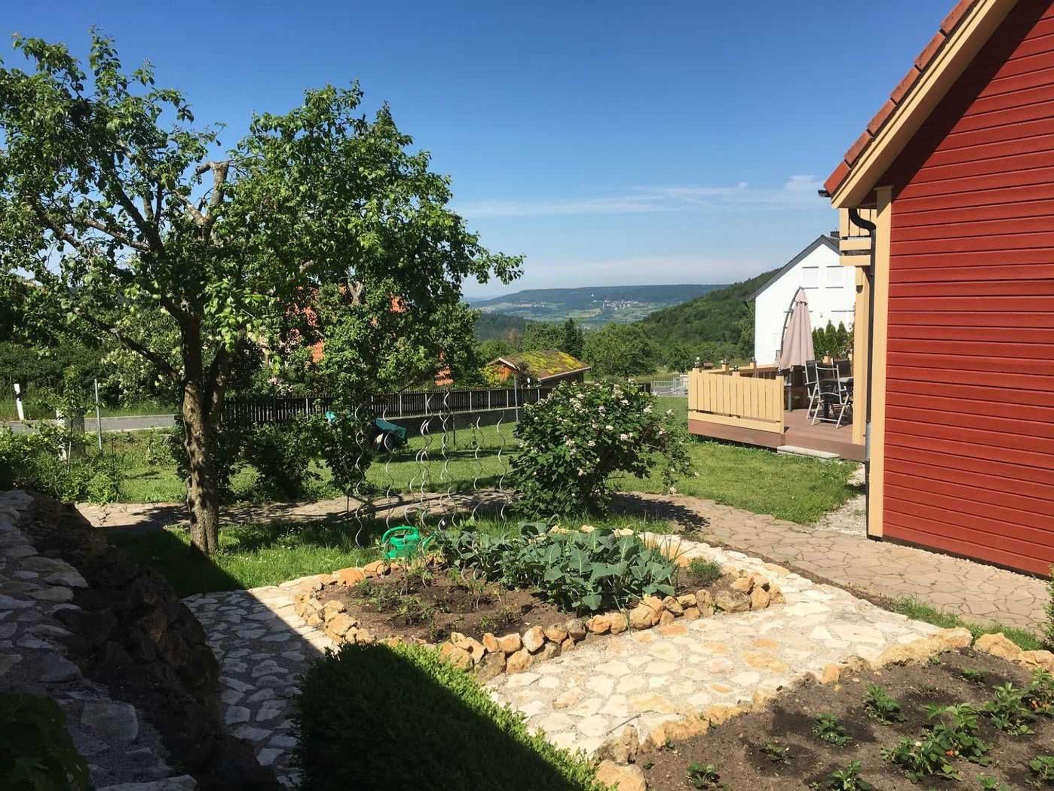 Sie können ihre Ferien in einem freistehenden Holzhaus verbringen. Das Ihnen zur Verfügung gestellt Grundstück beträgt 1000 Quadratmeter. Der Garten bietet eine Liegewiese, Platz für Spiele und zum Grillen. Die Terasse ist nach Süden ausgerichtet und ermöglicht einen weiten Blick ins untere Wiesenttal in Richtung Forchheim. Das Haus bietet Platz für sechs Personen zu jeder Jahreszeit.