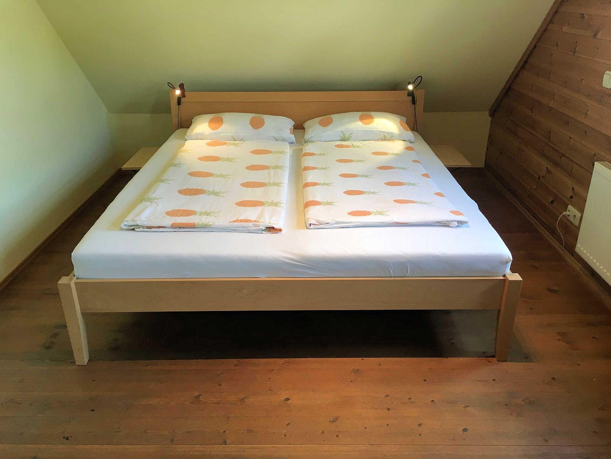 Im oberen Stock liegt das Badezimmer mit Duschkabine, Badewanne, WC und Waschbecken und drei Schlafräume. Ein Zimmer mit einem Einzelbett, ein Zimmer mit Doppelbett und ein Zimmer mit Doppelbett und einem Einzelbett.