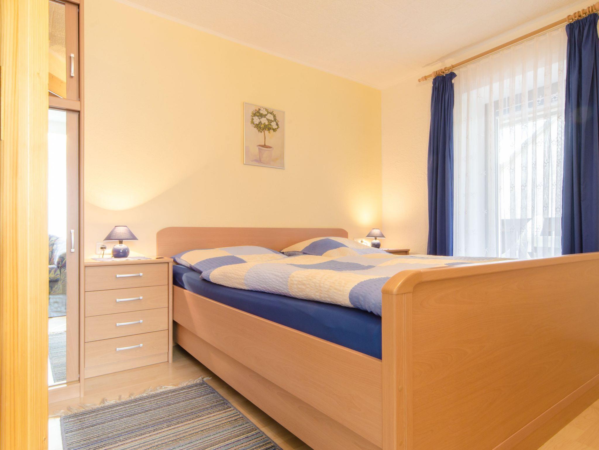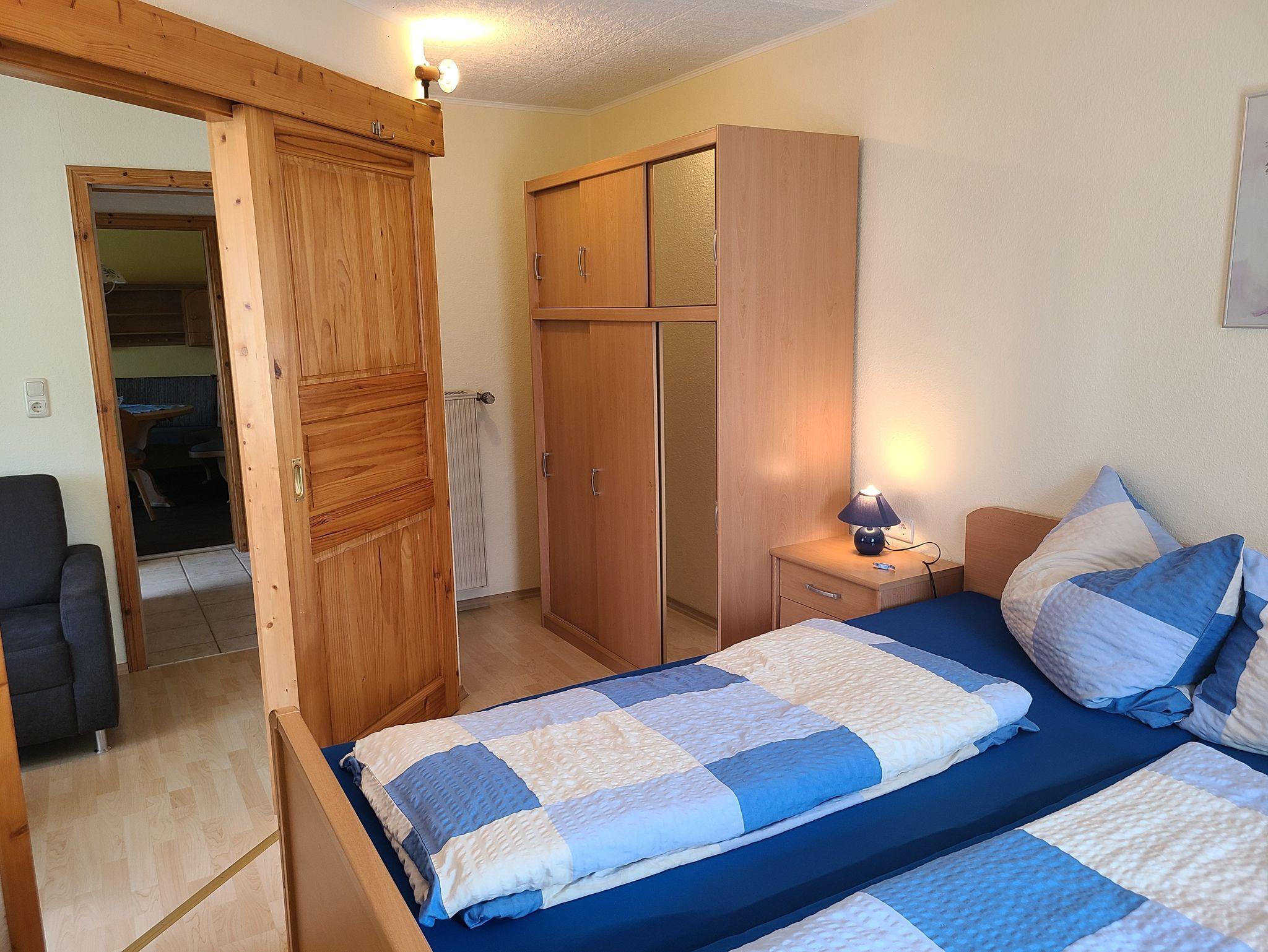 Unsere geräumige Ferienwohnung II ist 60 m² groß und befindet sich im 1. Stock. Sie verfügt über 2 getrennte Schlafzimmer mit Doppelbetten, einer voll ausgestatteten Küche (inkl. Spülmaschine) mit Sitzecke, Wohnzimmer mit Sat/TV und einem Bad mit Dusche/WC. Von der Küche und einem Schlafzimmer aus kann man auf die jeweiligen Balkone gelangen (Schlafzimmer mit Südbalkon und Küche mit Westbalkon).