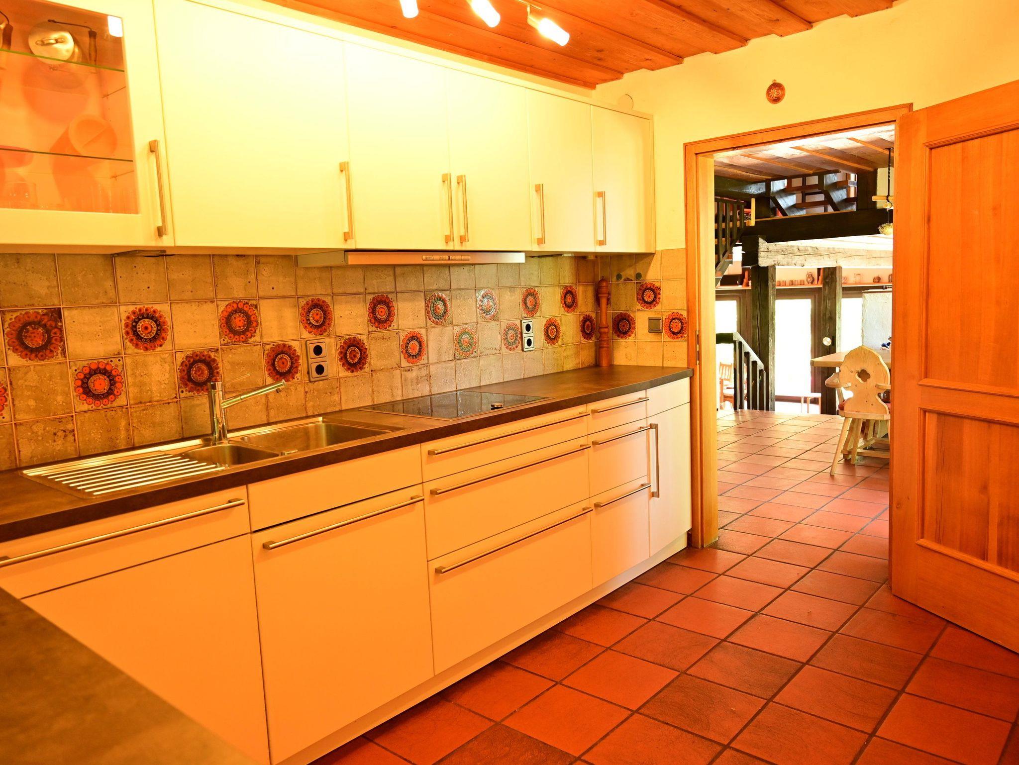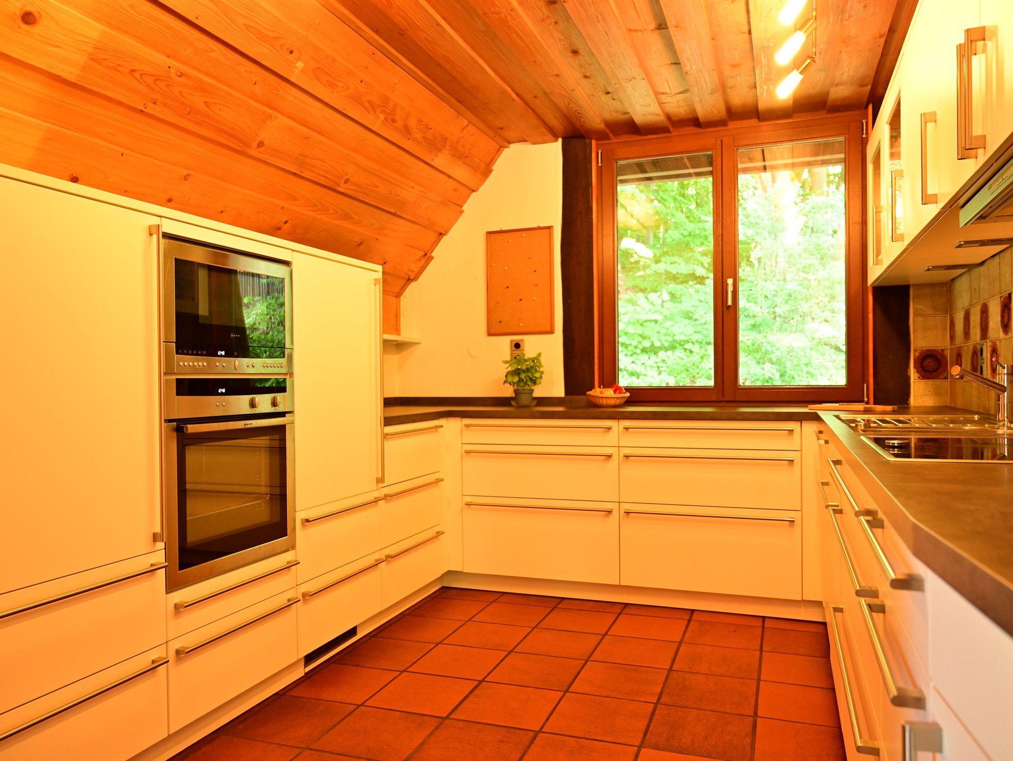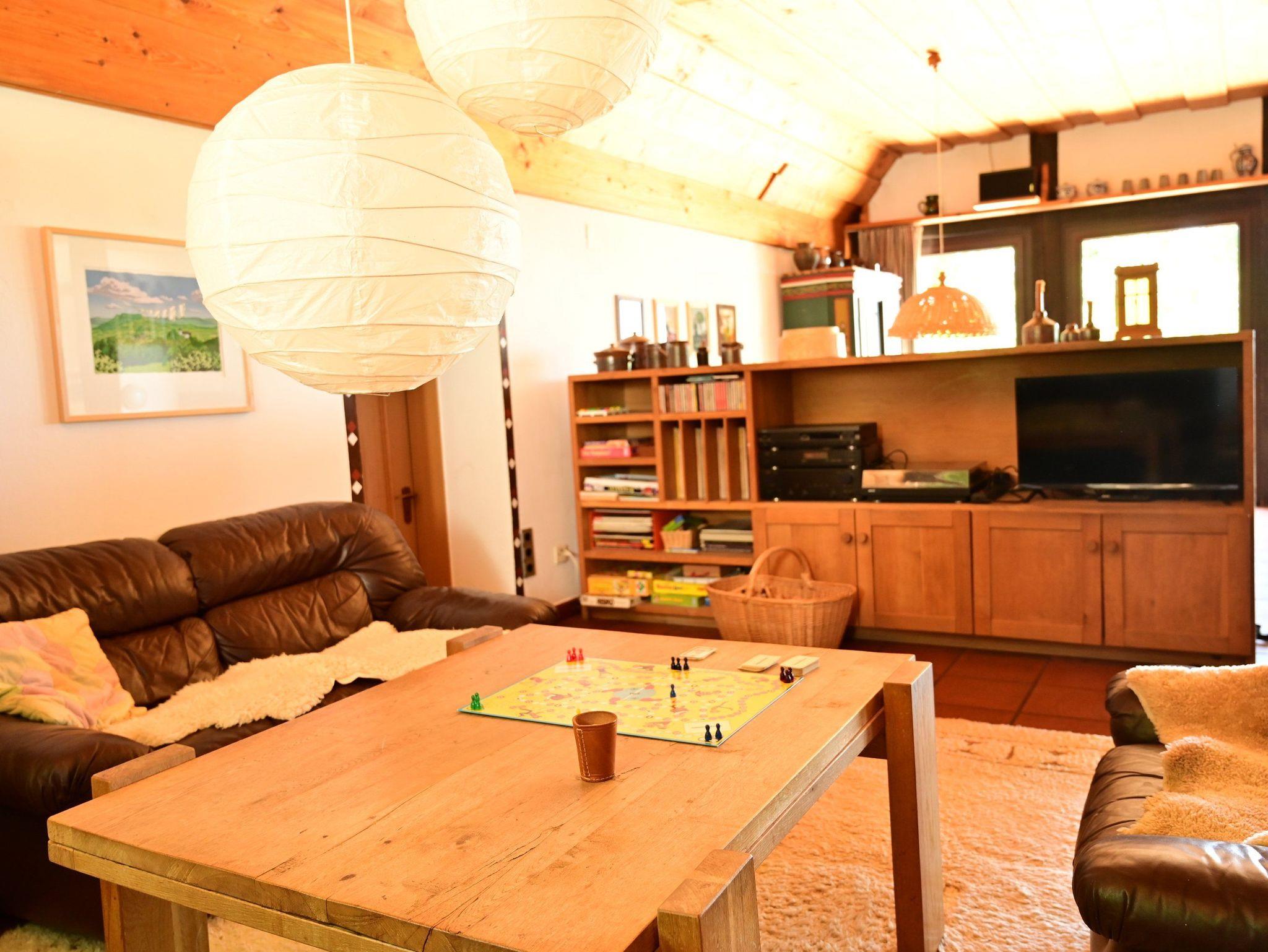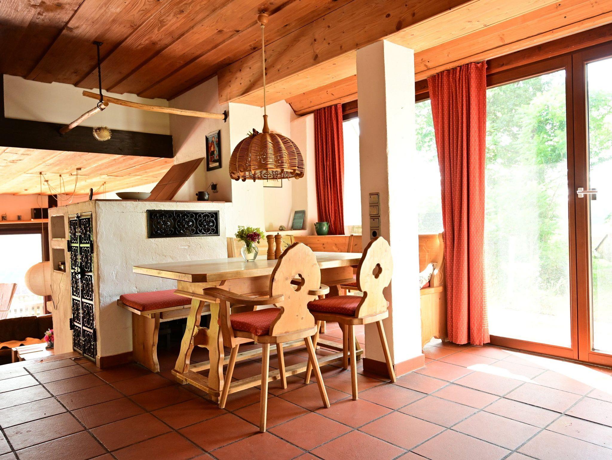 Im Erdgeschoss befindet sich ein großer, offener Wohn-Ess-Bereich auf zwei Ebenen mit Panoramafenstern, zwei Sitzecken, zwei Esstischen, zwei Kachelöfen und einem Kamin (hier muss im Winter selbst mit Holz geheizt werden) und Zugang zur sonnigen Terrasse, eine vollausgestattete Küche mit Spülmaschine, ein WC und ein Schlafzimmer mit 2 Doppelbetten und eigenem Bad mit WC und Dusche.