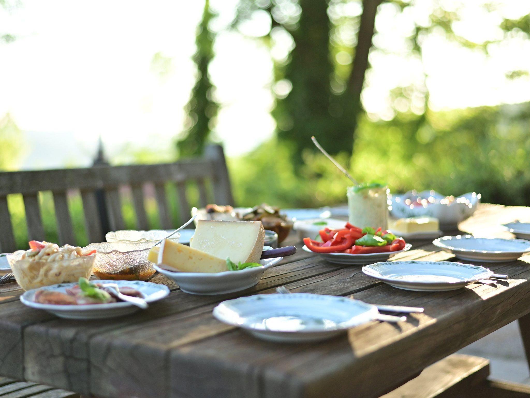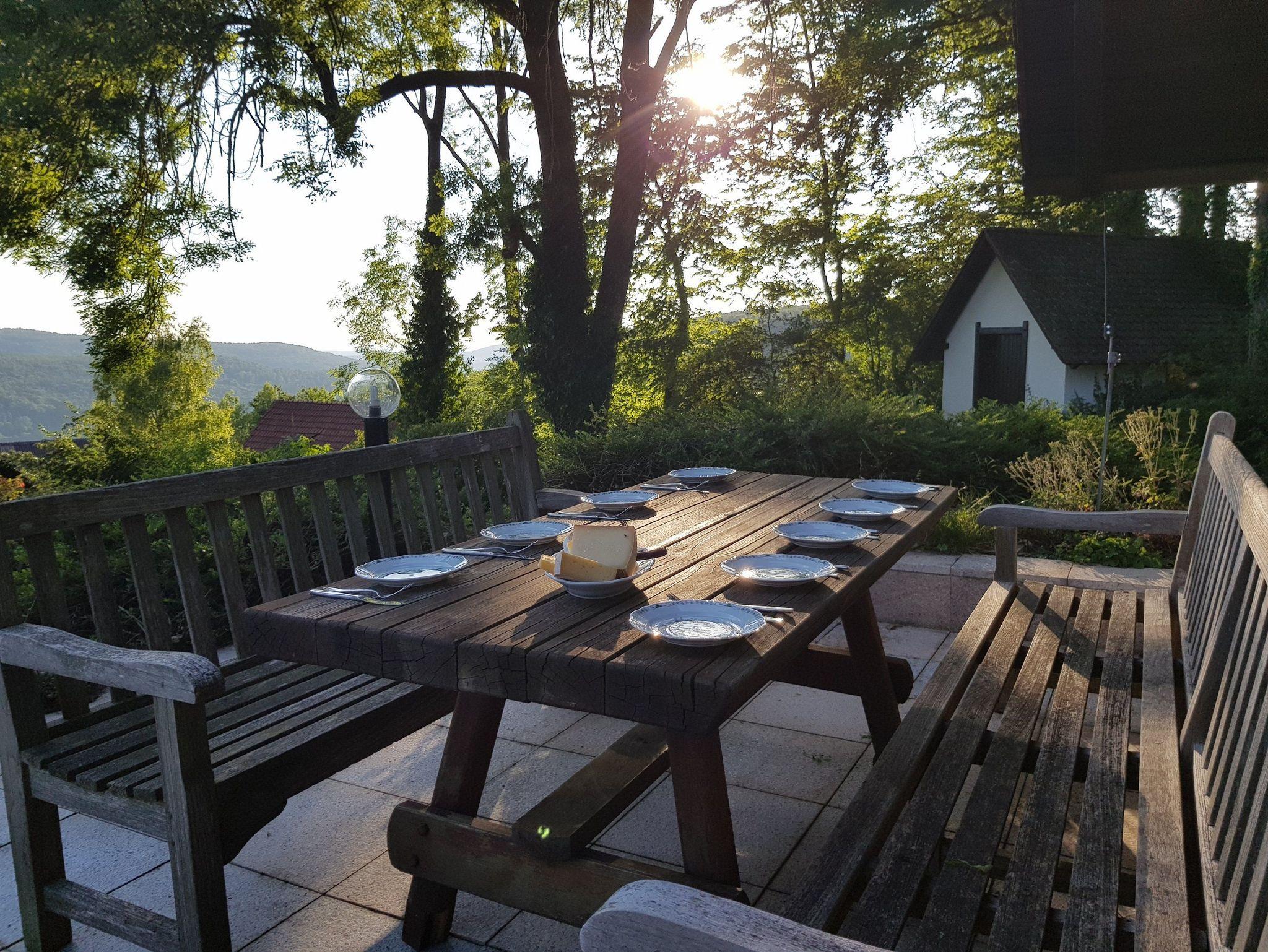 Eine Feuerschale lädt auch am Abend zum Zusammensitzen unter freiem Himmel ein. Auch ein großer Kugelgrill kann gerne genutzt werden. Zwei Schaukeln mit Fernblick sind nicht nur für Kinder ein großes Vergnügen. Äpfel- und Zwetschgenbäume bieten Schatten und können je nach Jahreszeit geerntet werden.