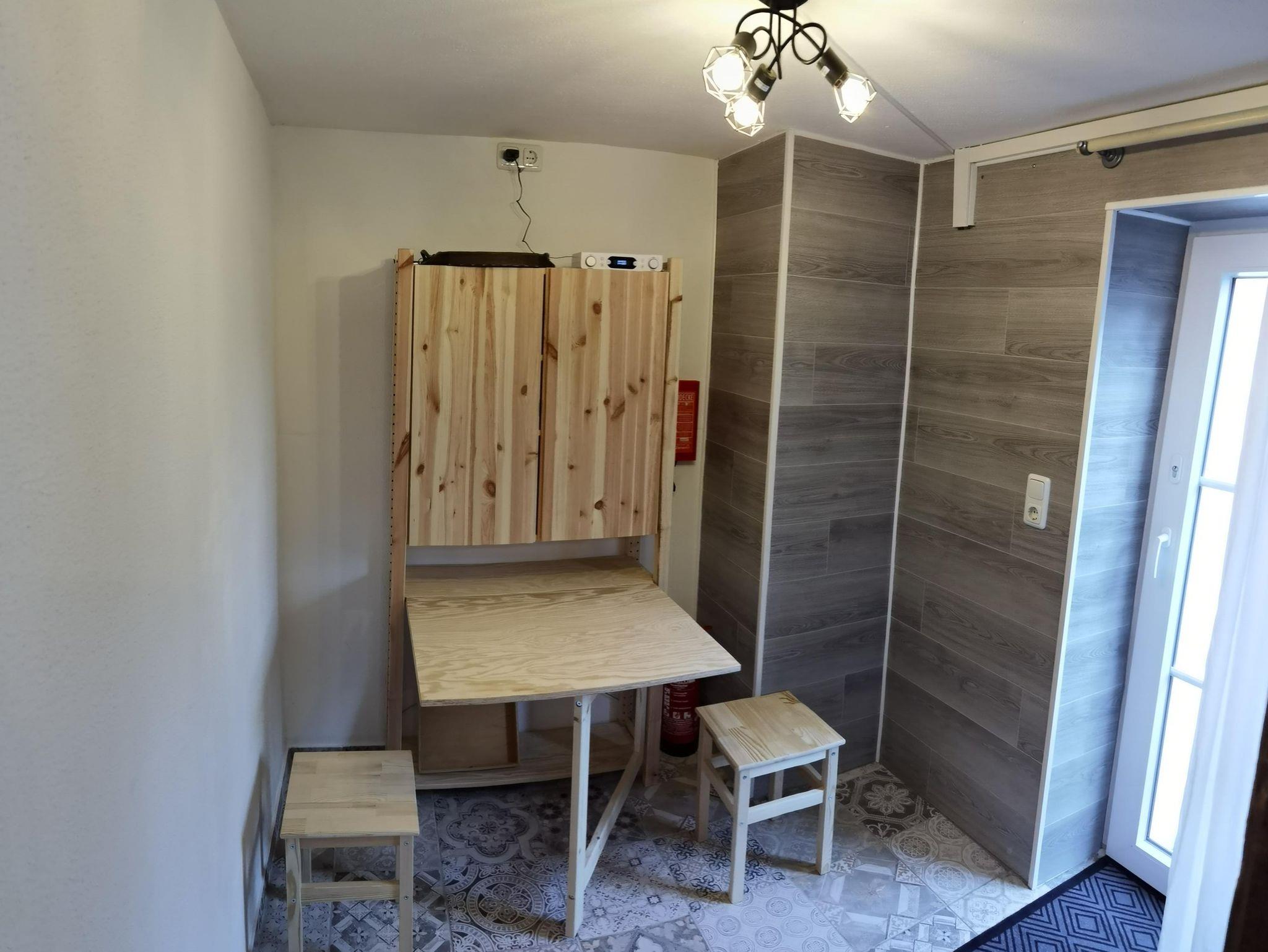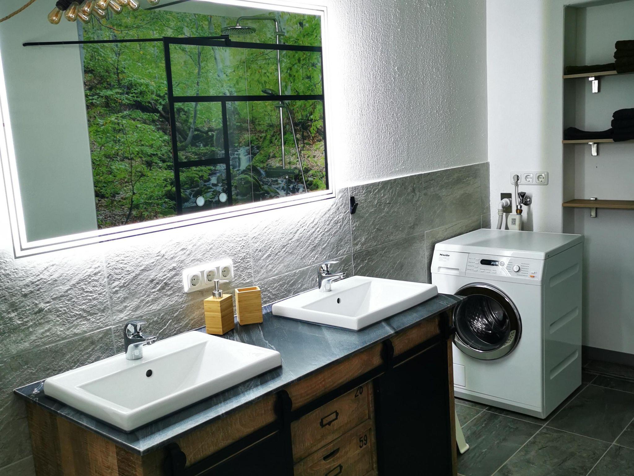 Ein Duschbad mit Waschmaschine und eine Küche sind vorhanden.