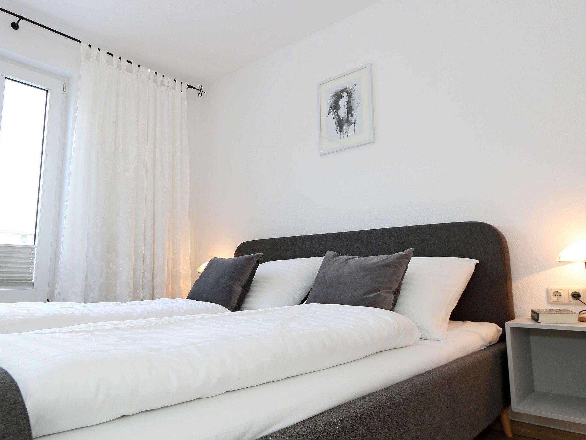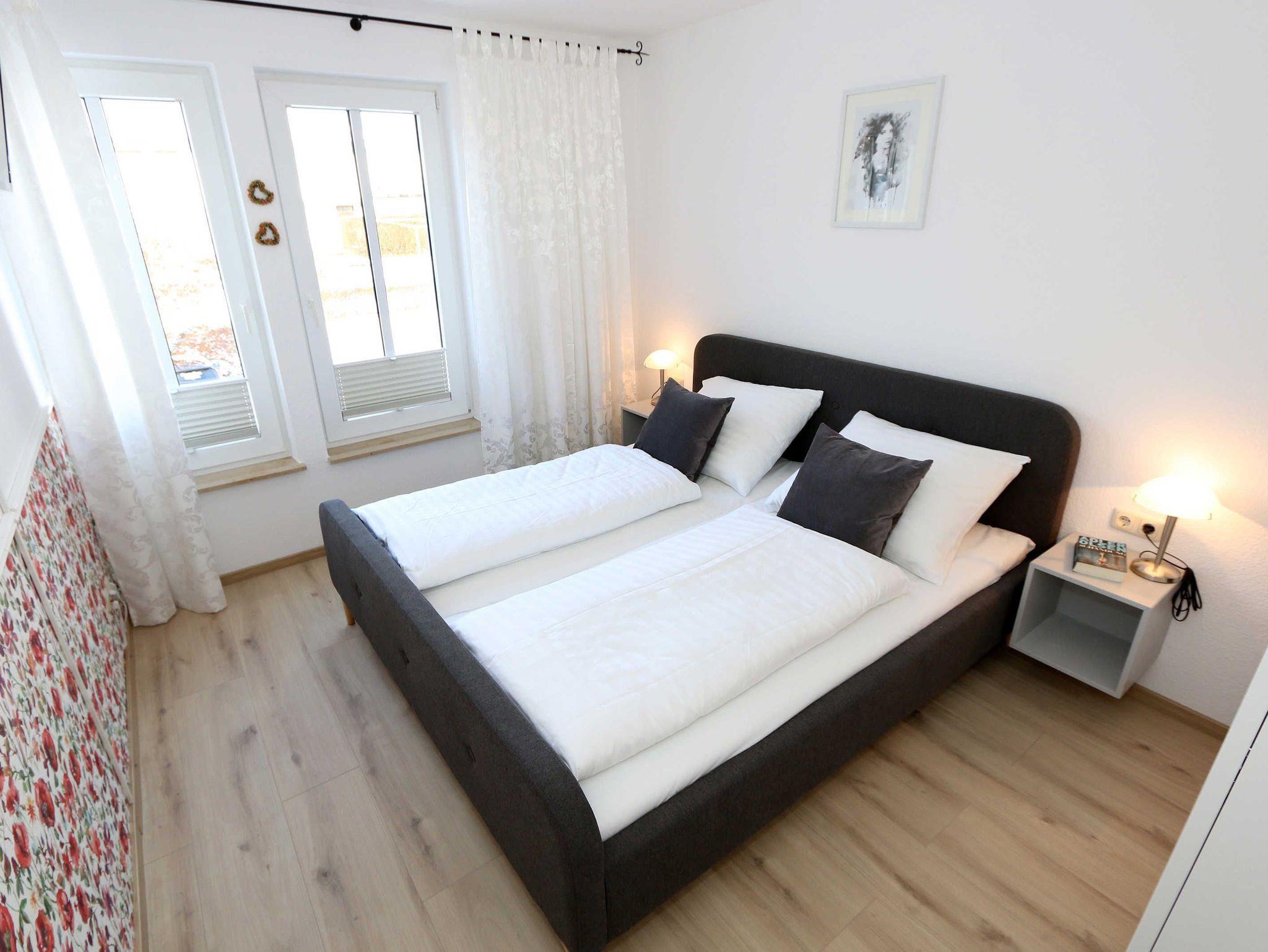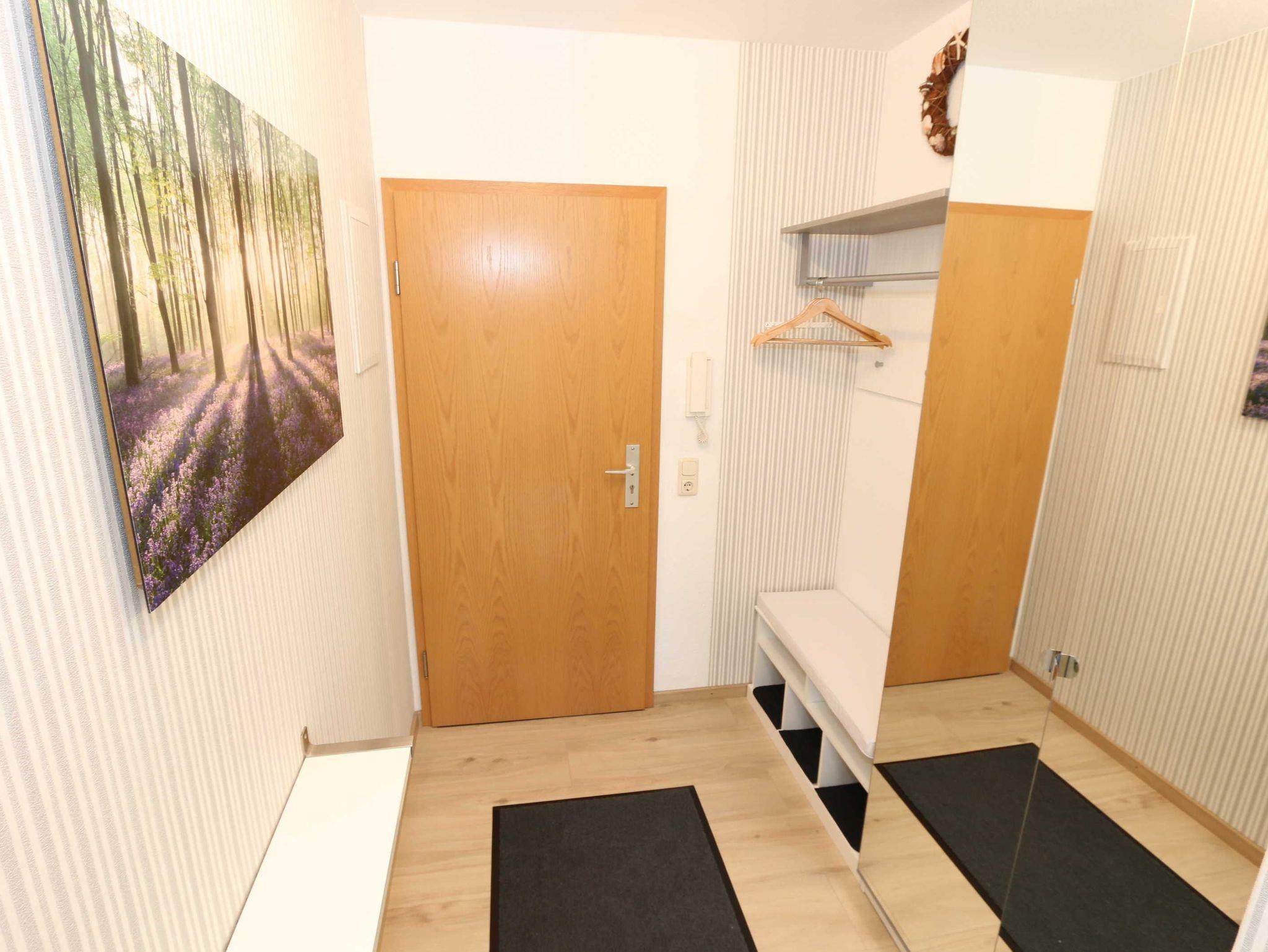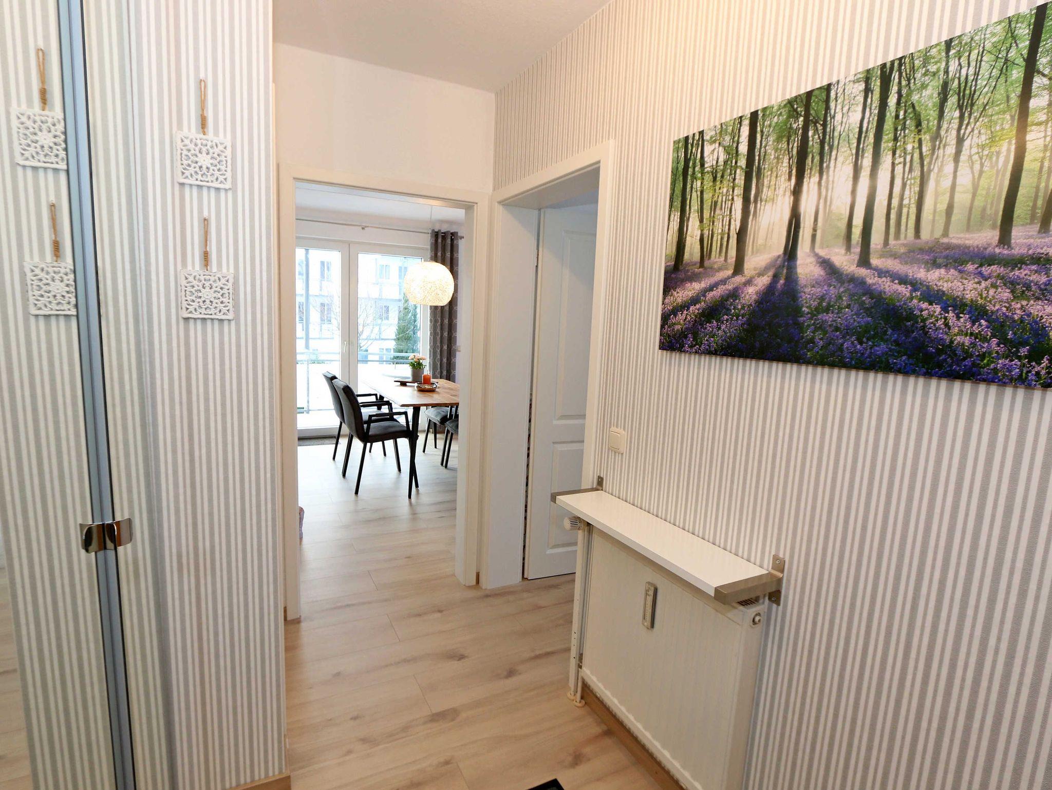 Die Nichtraucherferienwohnung des Hauses Eintracht ist eine komfortable 2-Raumwohnung in der 1. Etage und umfasst etwa 56m², somit bietet sie Platz für bis zu 4 Personen. Sie setzt sich zusammen aus einem Wohnzimmer mit Zugang zum Balkon, einem Schlafzimmer, einer Küchenzeile, einem Flur und einem Badezimmer. Der Wohnbereich ist liebevoll und detailreich eingerichtet. In dem lichtdurchfluteten Raum finden sie, neben zwei Sessel, einen Couchtisch, eine Schlafcouch (1,60m x 2,00m), welches als Schlafmöglichkeit für 2 Personen geeignet ist. Ein Smart-TV sowie ein DVD-Player ermöglichen es ihnen, nach einem eindrucksvollen Tag einen gemütlichen Filmabend mit den Liebsten zu verbringen. Auch ein Radio mit CD-Player und verschiedene Lektüren für die Bücherwürmer unter Ihnen sind vorzufinden. Auf einen Internetzugang (WLAN) brauchen Sie nicht zu verzichten. Des Weiteren befindet sich hier auch ein schöner Esstisch mit vier bequemen Stühlen, die sich direkt am Balkon Fenster befinden. Auf diesem zu Süd gerichteten Balkon befindet sich ein Tisch mit vier Stühlen, einen Sonnenschirm sowie einer Gartenbank. Die neu moderne Küchenzeile ist ausgestattet mit einem Ceranfeld, Backofen und einem Kühlschrank mit Eisfach, Geschirrspüler, Mikrowelle, Wasserkocher, Toaster, Kaffeemaschine und diverse Kochutensilien. Das Schlafzimmer ist mit einem Doppelbett (1,80m x 2,00m), verstellbare Lattenroste, Nachttischablagen und einem geräumigen Kleiderschrank ausgestattet. Wie im Wohnzimmer ist das Schlafzimmer angenehm hell, auch hier befindet sich ein TV-Gerät. Bei Bedarf können sie jedoch einfach die Raffrollos zuziehen und dunkeln den Raum somit komplett ab. Sollten sie feststellen, dass ihre Kleidung im Koffer zerknittert ist, so finden sie im Schlafzimmer sowohl ein kleines Bügelbrett als auch ein Bügeleisen vor. Das Badezimmer setzt sich zusammen aus einer modernen Regendusche, einem großen Waschtisch mit einem geräumigen Unterschrank, einem WC, einem großen beleuchteten Spiegel sowie einem Handtuchheizkörper. Auch ein Fön steht Ihnen zur Verfügung. Natürlich ist auch an die kleinen Gäste gedacht, so dass Sie sich an verschiedenen Spielzeuge, Gesellschaftsspielen und Kinderbüchern erfreuen können. Ihr PKW-Stellplatz (Nr.16) befindet sich direkt am Haus. Zu der Villa ?Eintracht? gehört auch ein kleiner Kinderspielplatz. Leider sind bei uns keine Haustiere erlaubt. Die Erstausstattung eines Wäschepaketes (komplette Bettwäsche, 1 Duschhandtuch, 2 kleine Handtücher, 2 Geschirrhandtücher) können Sie bis 14 Tage vor Anreise gegen einen Aufpreis dazu buchen oder durch eigene ergänzen.