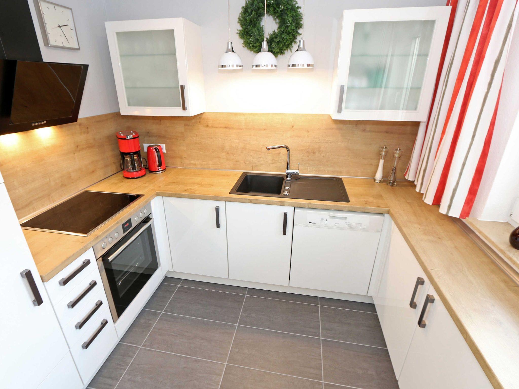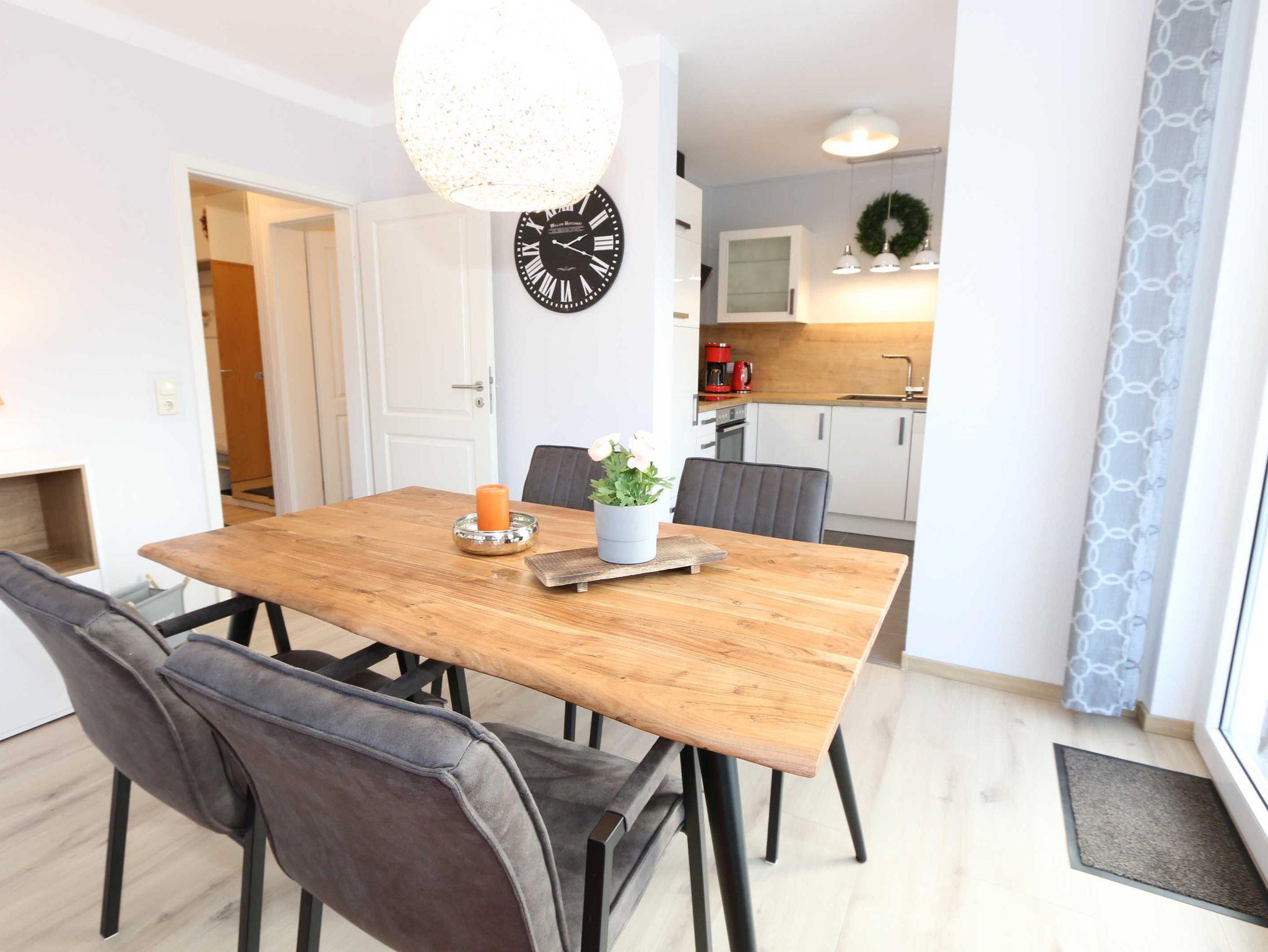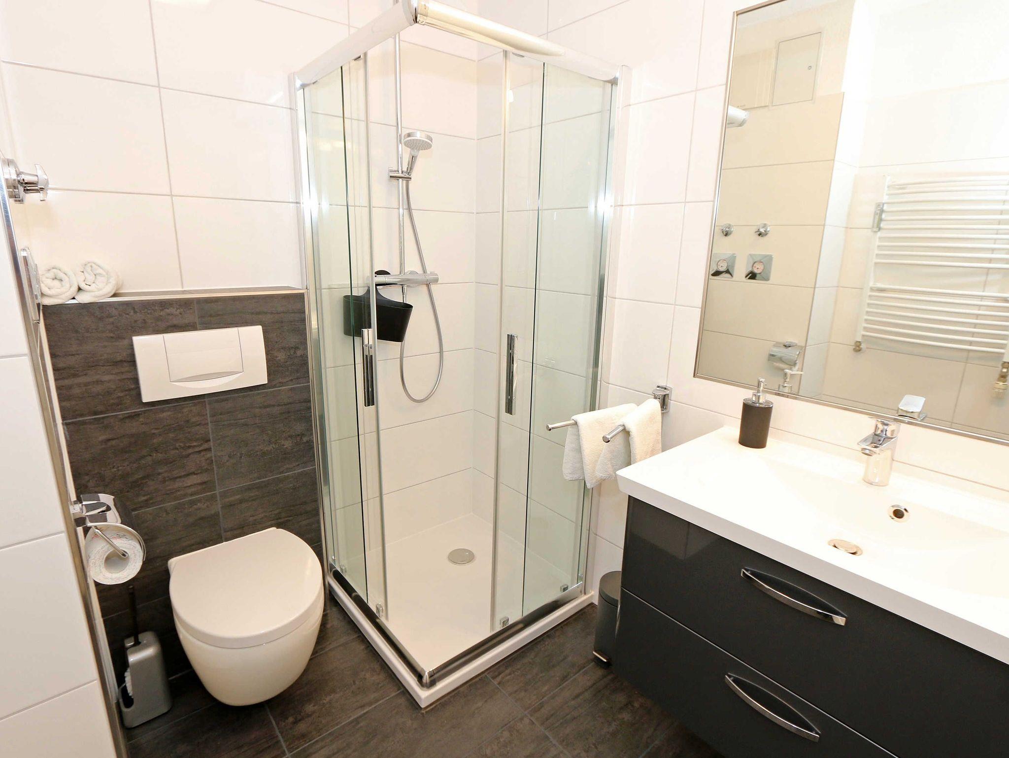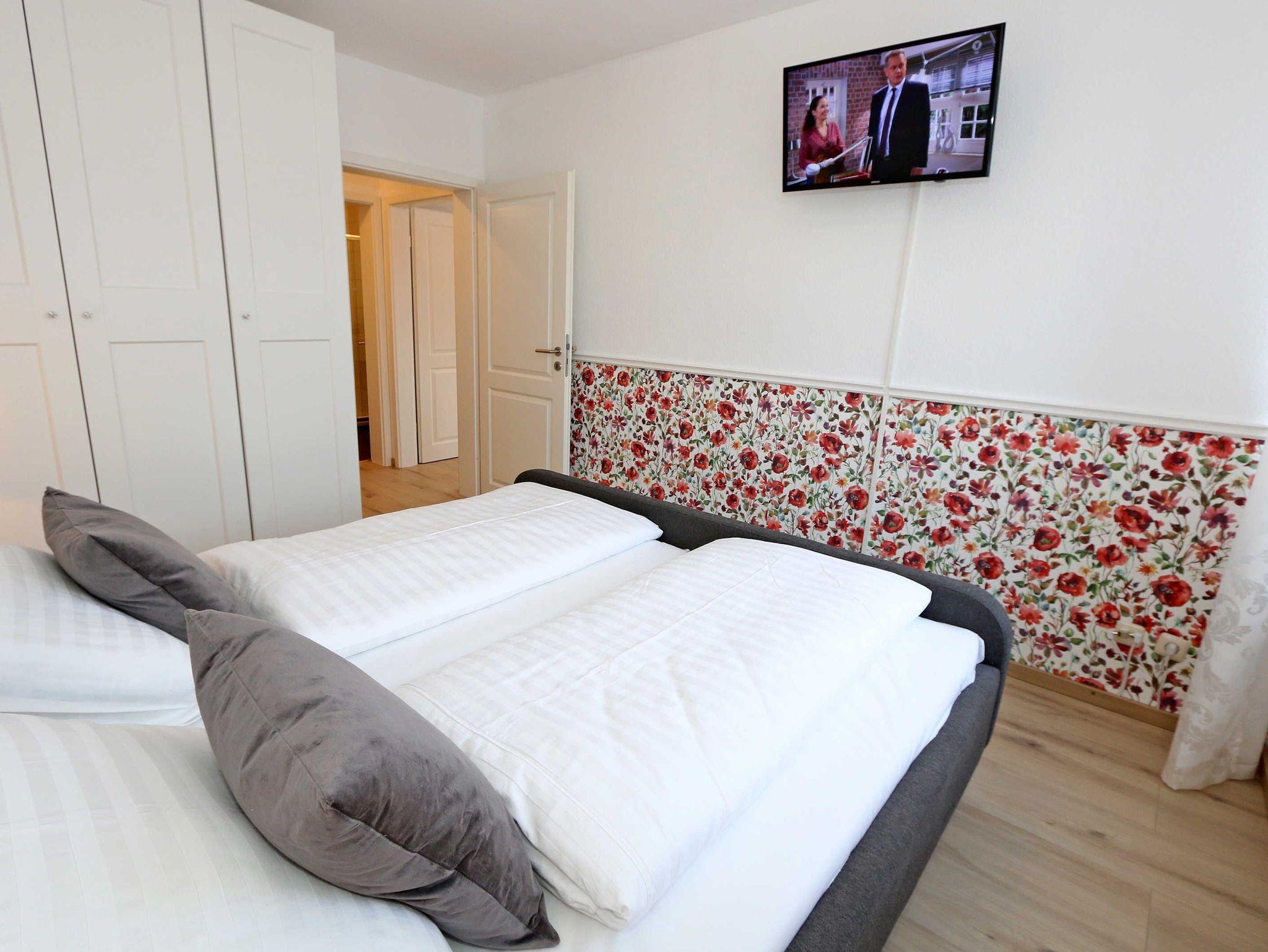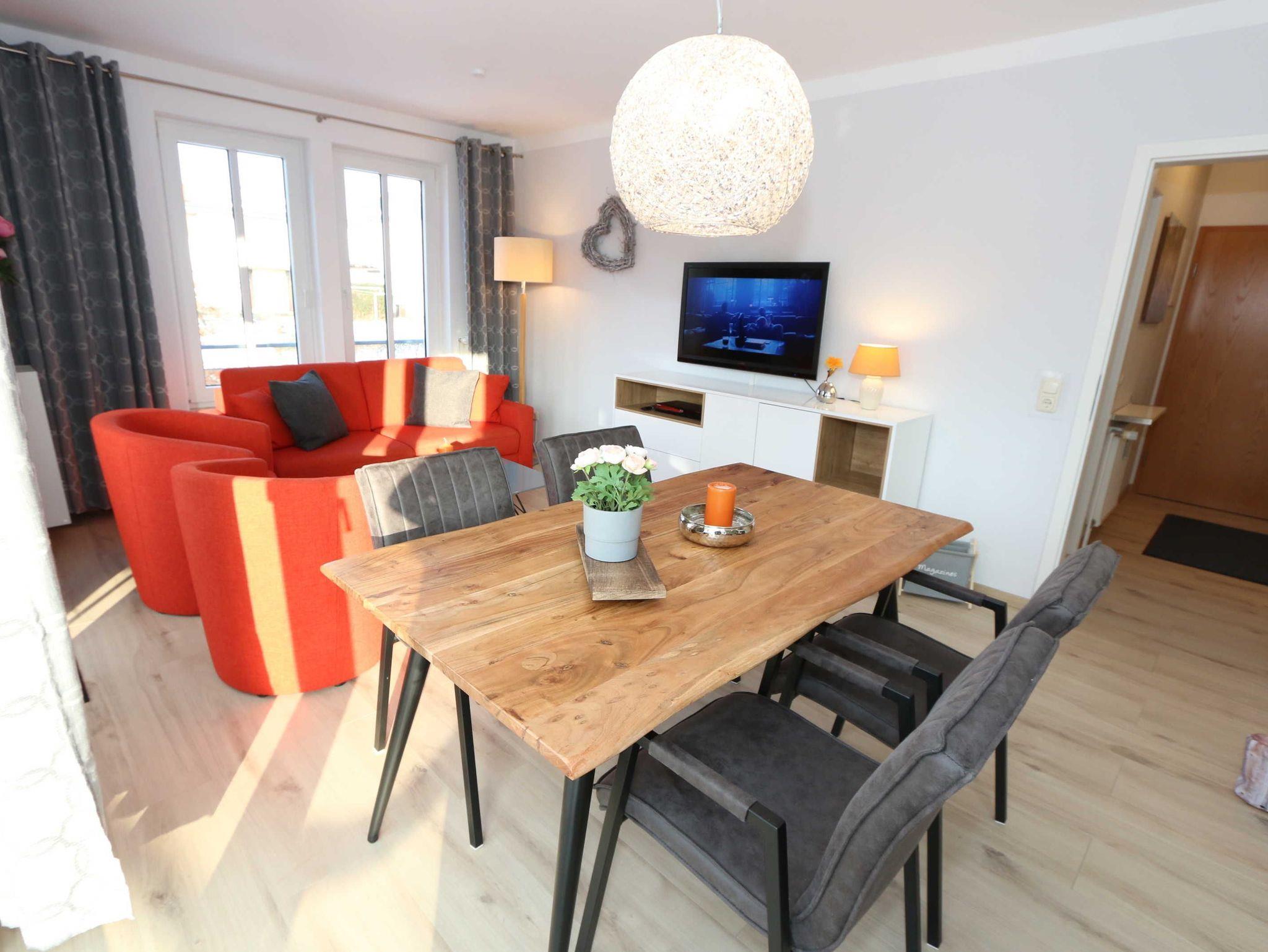 Die Nichtraucherferienwohnung des Hauses Eintracht ist eine komfortable 2-Raumwohnung in der 1. Etage und umfasst etwa 56m², somit bietet sie Platz für bis zu 4 Personen. Sie setzt sich zusammen aus einem Wohnzimmer mit Zugang zum Balkon, einem Schlafzimmer, einer Küchenzeile, einem Flur und einem Badezimmer. Der Wohnbereich ist liebevoll und detailreich eingerichtet. In dem lichtdurchfluteten Raum finden sie, neben zwei Sessel, einen Couchtisch, eine Schlafcouch (1,60m x 2,00m), welches als Schlafmöglichkeit für 2 Personen geeignet ist. Ein Smart-TV sowie ein DVD-Player ermöglichen es ihnen, nach einem eindrucksvollen Tag einen gemütlichen Filmabend mit den Liebsten zu verbringen. Auch ein Radio mit CD-Player und verschiedene Lektüren für die Bücherwürmer unter Ihnen sind vorzufinden. Auf einen Internetzugang (WLAN) brauchen Sie nicht zu verzichten. Des Weiteren befindet sich hier auch ein schöner Esstisch mit vier bequemen Stühlen, die sich direkt am Balkon Fenster befinden. Auf diesem zu Süd gerichteten Balkon befindet sich ein Tisch mit vier Stühlen, einen Sonnenschirm sowie einer Gartenbank. Die neu moderne Küchenzeile ist ausgestattet mit einem Ceranfeld, Backofen und einem Kühlschrank mit Eisfach, Geschirrspüler, Mikrowelle, Wasserkocher, Toaster, Kaffeemaschine und diverse Kochutensilien. Das Schlafzimmer ist mit einem Doppelbett (1,80m x 2,00m), verstellbare Lattenroste, Nachttischablagen und einem geräumigen Kleiderschrank ausgestattet. Wie im Wohnzimmer ist das Schlafzimmer angenehm hell, auch hier befindet sich ein TV-Gerät. Bei Bedarf können sie jedoch einfach die Raffrollos zuziehen und dunkeln den Raum somit komplett ab. Sollten sie feststellen, dass ihre Kleidung im Koffer zerknittert ist, so finden sie im Schlafzimmer sowohl ein kleines Bügelbrett als auch ein Bügeleisen vor. Das Badezimmer setzt sich zusammen aus einer modernen Regendusche, einem großen Waschtisch mit einem geräumigen Unterschrank, einem WC, einem großen beleuchteten Spiegel sowie einem Handtuchheizkörper. Auch ein Fön steht Ihnen zur Verfügung. Natürlich ist auch an die kleinen Gäste gedacht, so dass Sie sich an verschiedenen Spielzeuge, Gesellschaftsspielen und Kinderbüchern erfreuen können. Ihr PKW-Stellplatz (Nr.16) befindet sich direkt am Haus. Zu der Villa ?Eintracht? gehört auch ein kleiner Kinderspielplatz. Leider sind bei uns keine Haustiere erlaubt. Die Erstausstattung eines Wäschepaketes (komplette Bettwäsche, 1 Duschhandtuch, 2 kleine Handtücher, 2 Geschirrhandtücher) können Sie bis 14 Tage vor Anreise gegen einen Aufpreis dazu buchen oder durch eigene ergänzen.