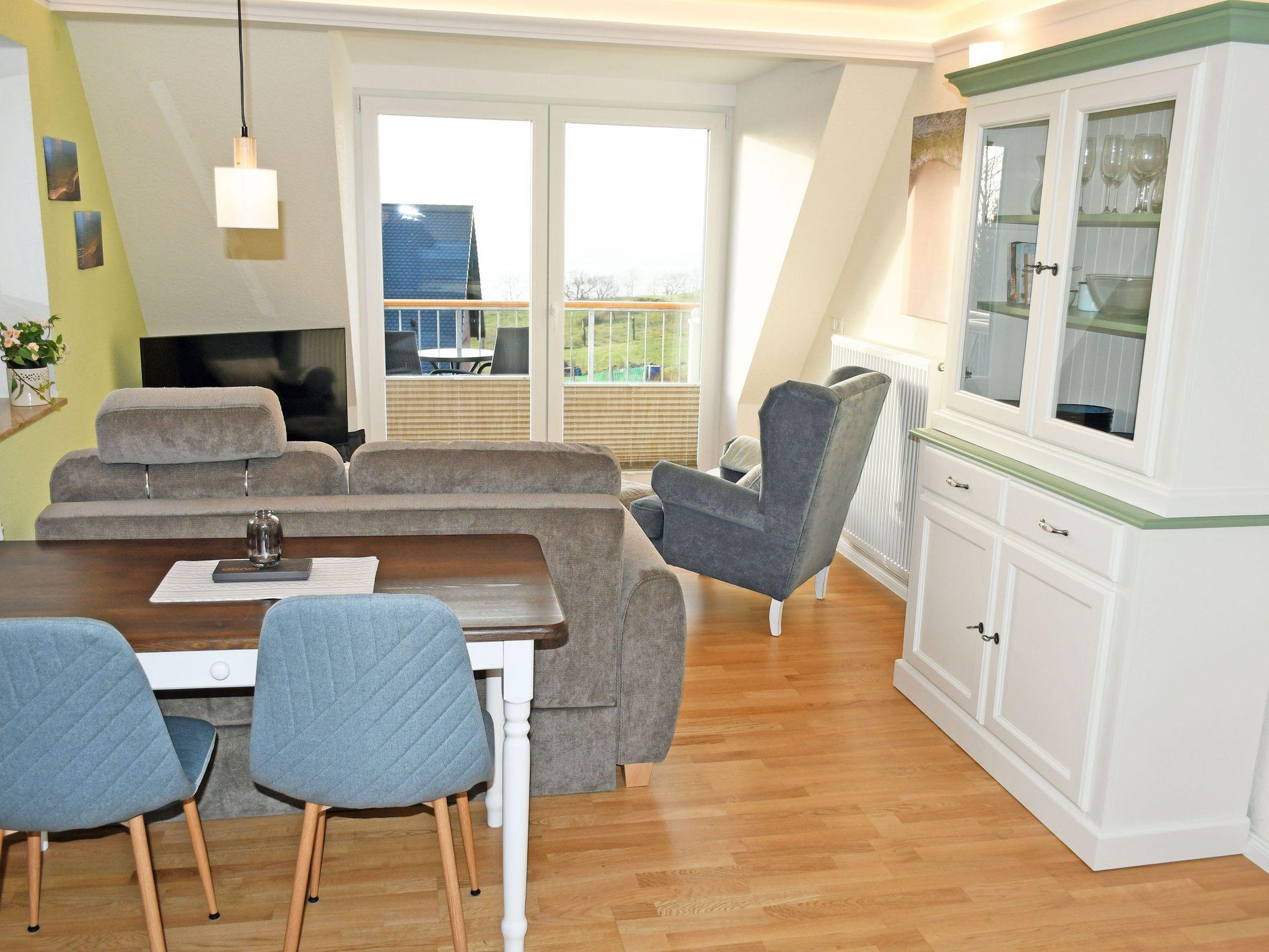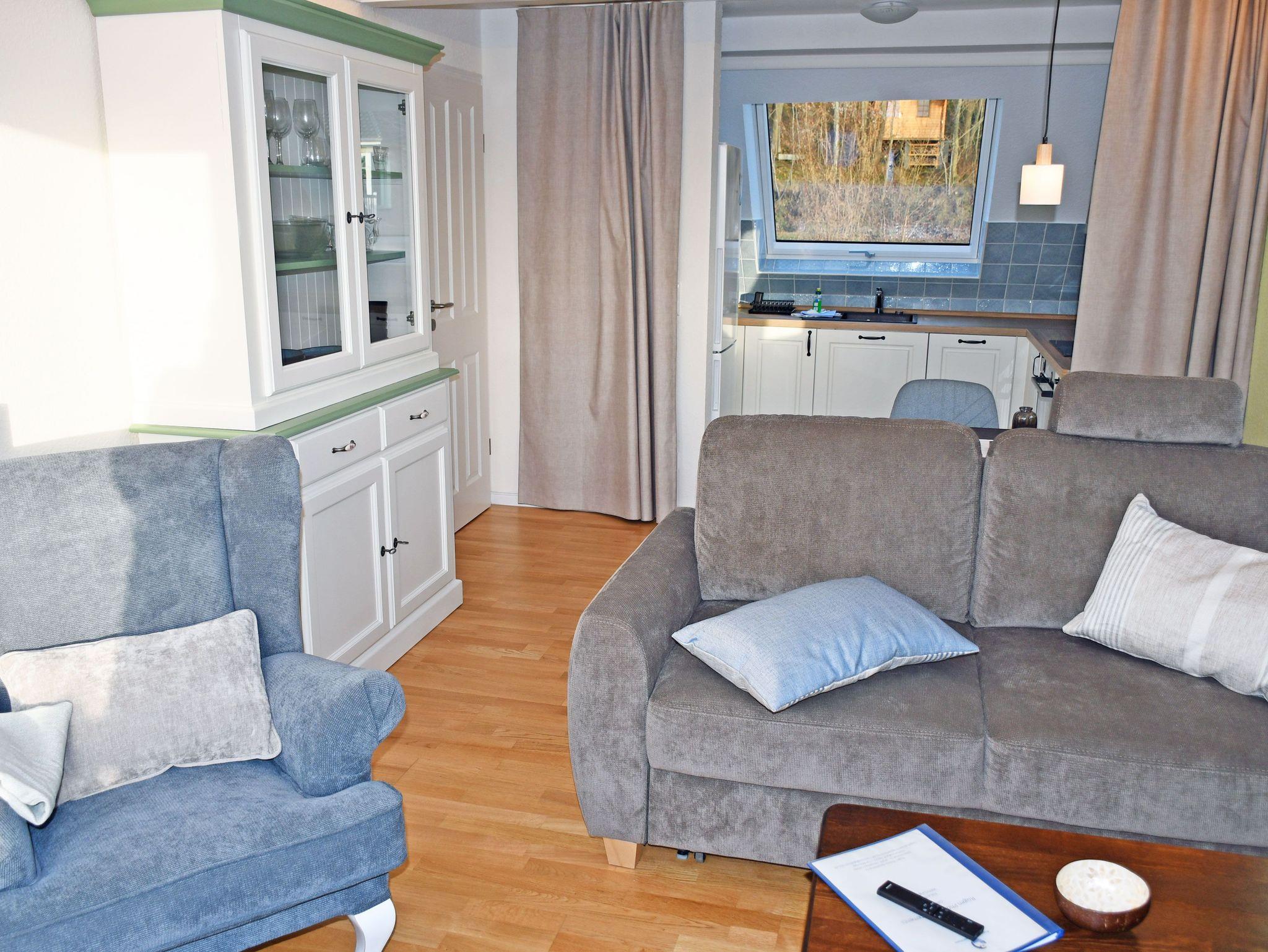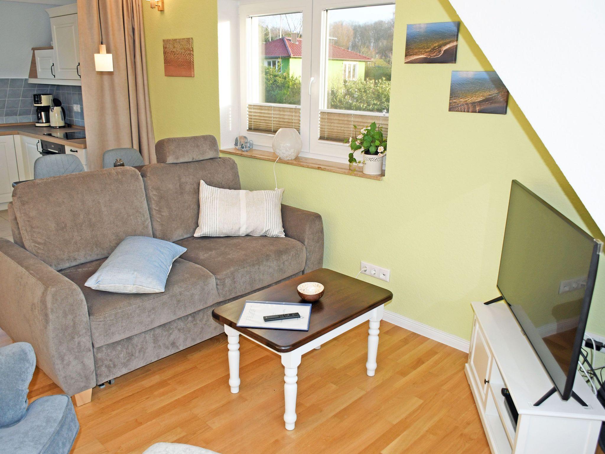 - Wohnbereich mit Schlafsofa, Sessel und Couchtisch, 43- UHD-Smart-TV mit Netflix und Blu-ray-Player, Esstisch mit 3 Stühlen