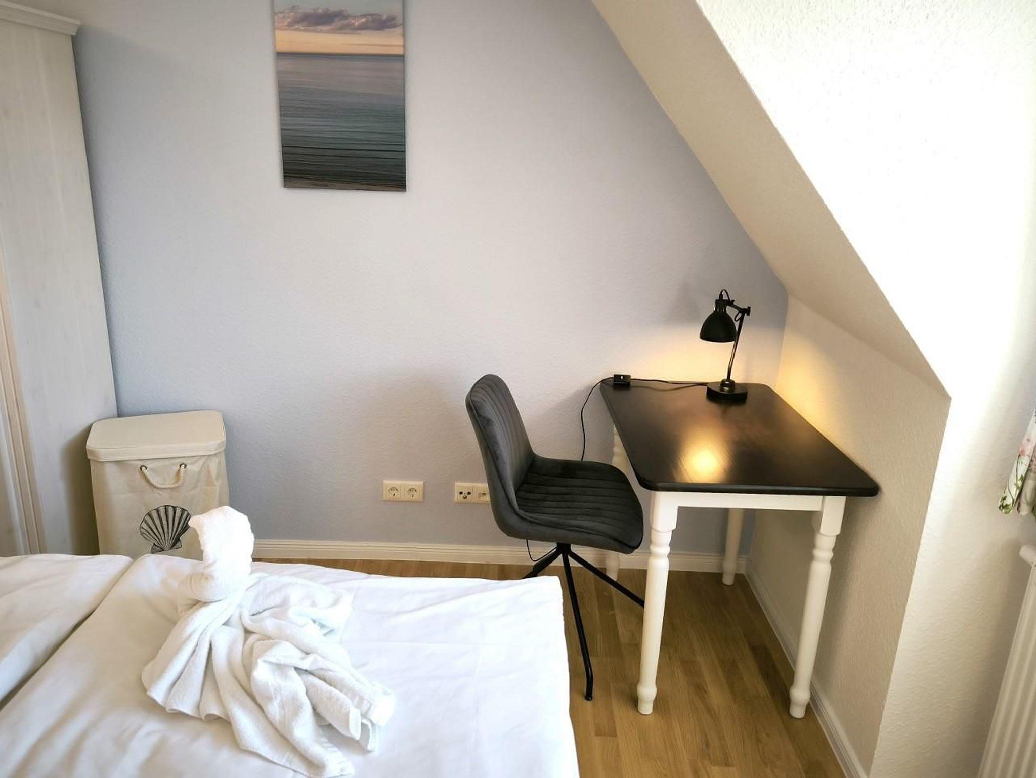 - Schlafzimmer mit einem Boxspringbett (180 x 200 cm), Kleiderschrank und Arbeitsplatz mit LAN-Dose