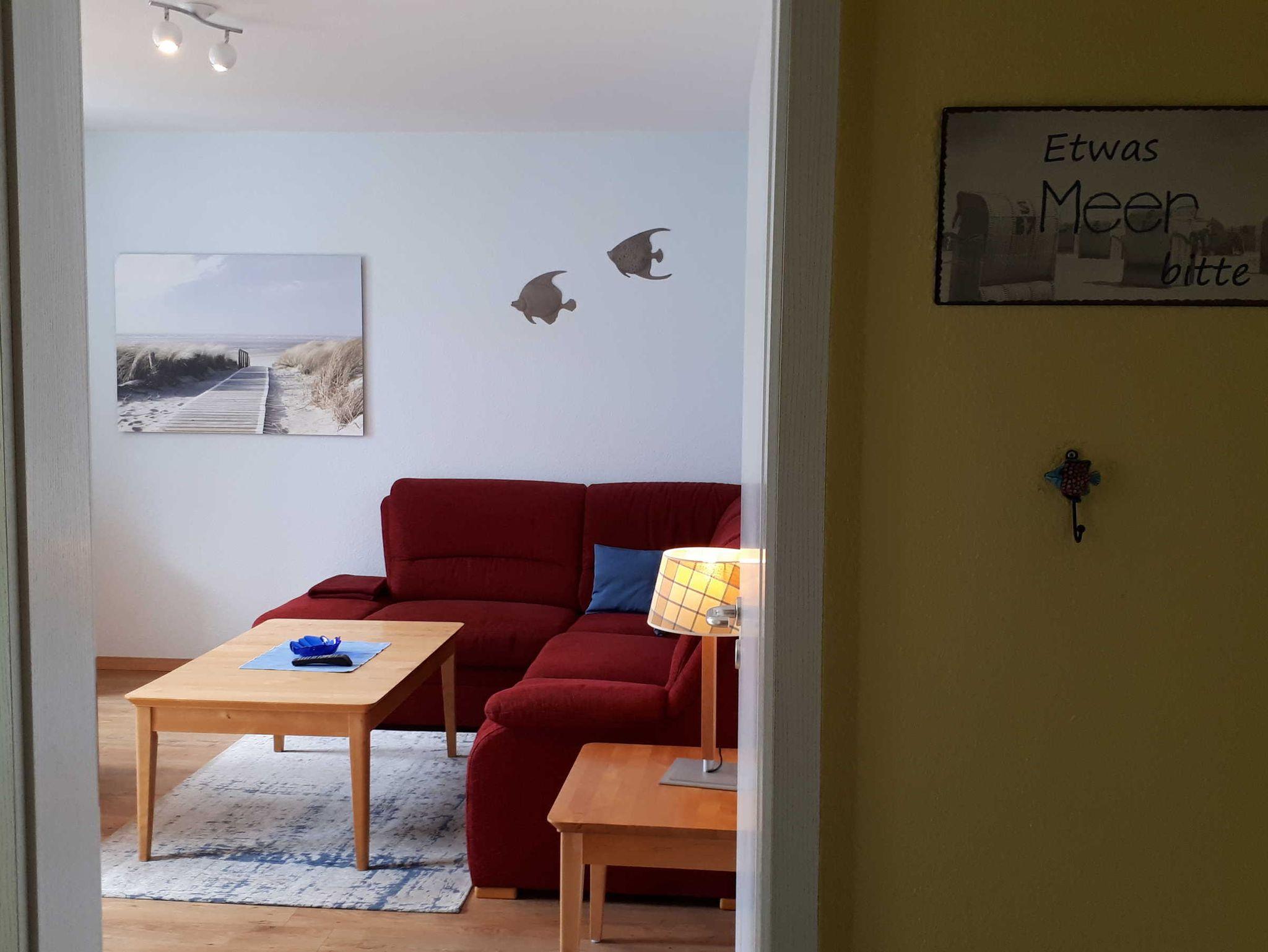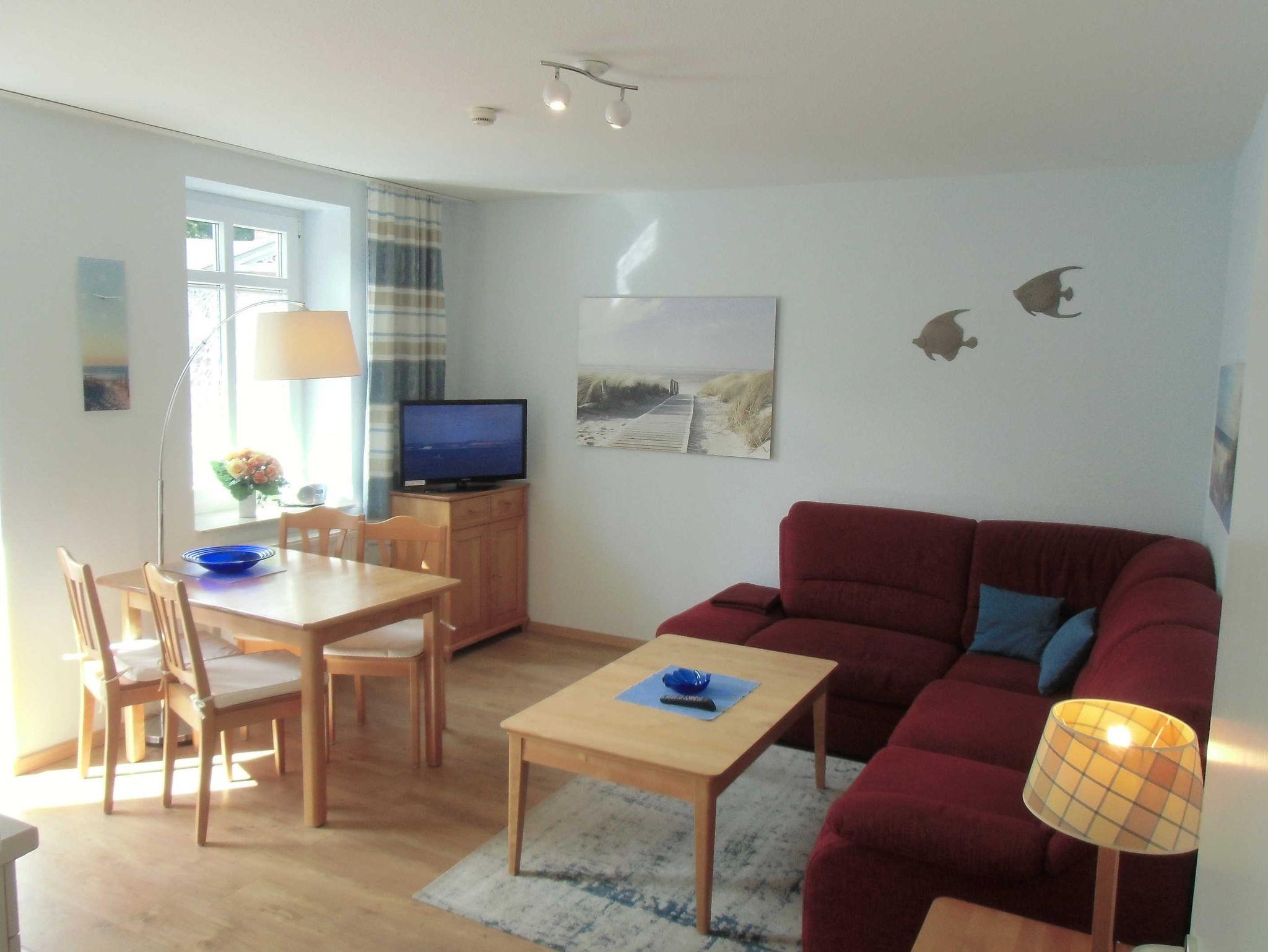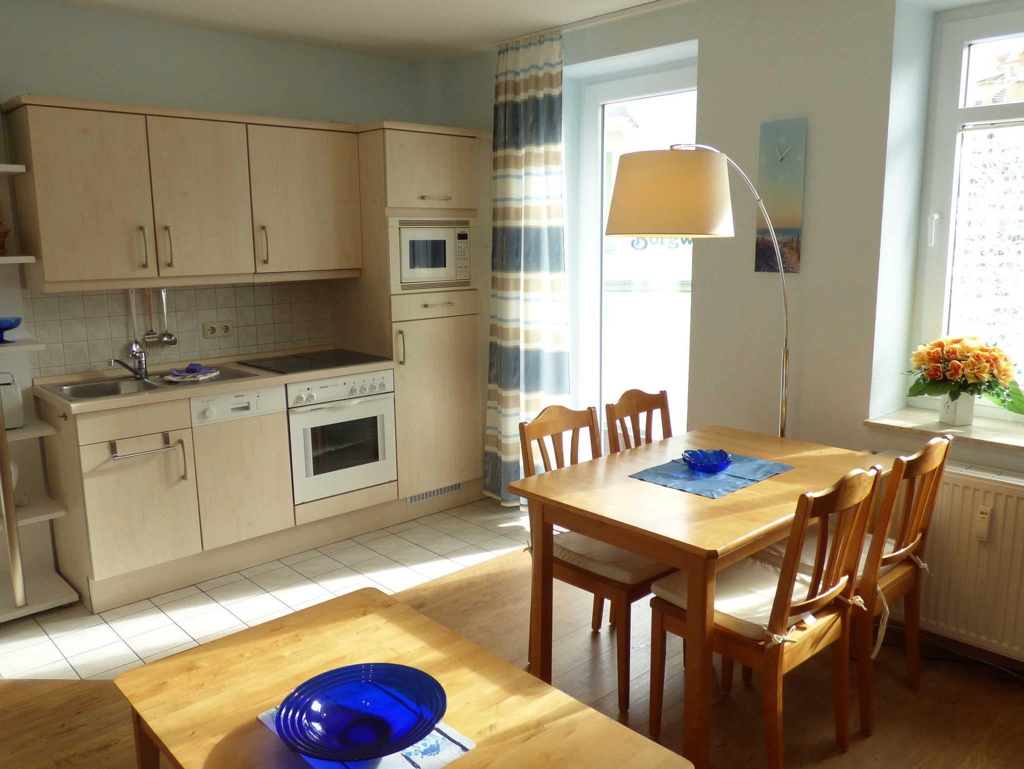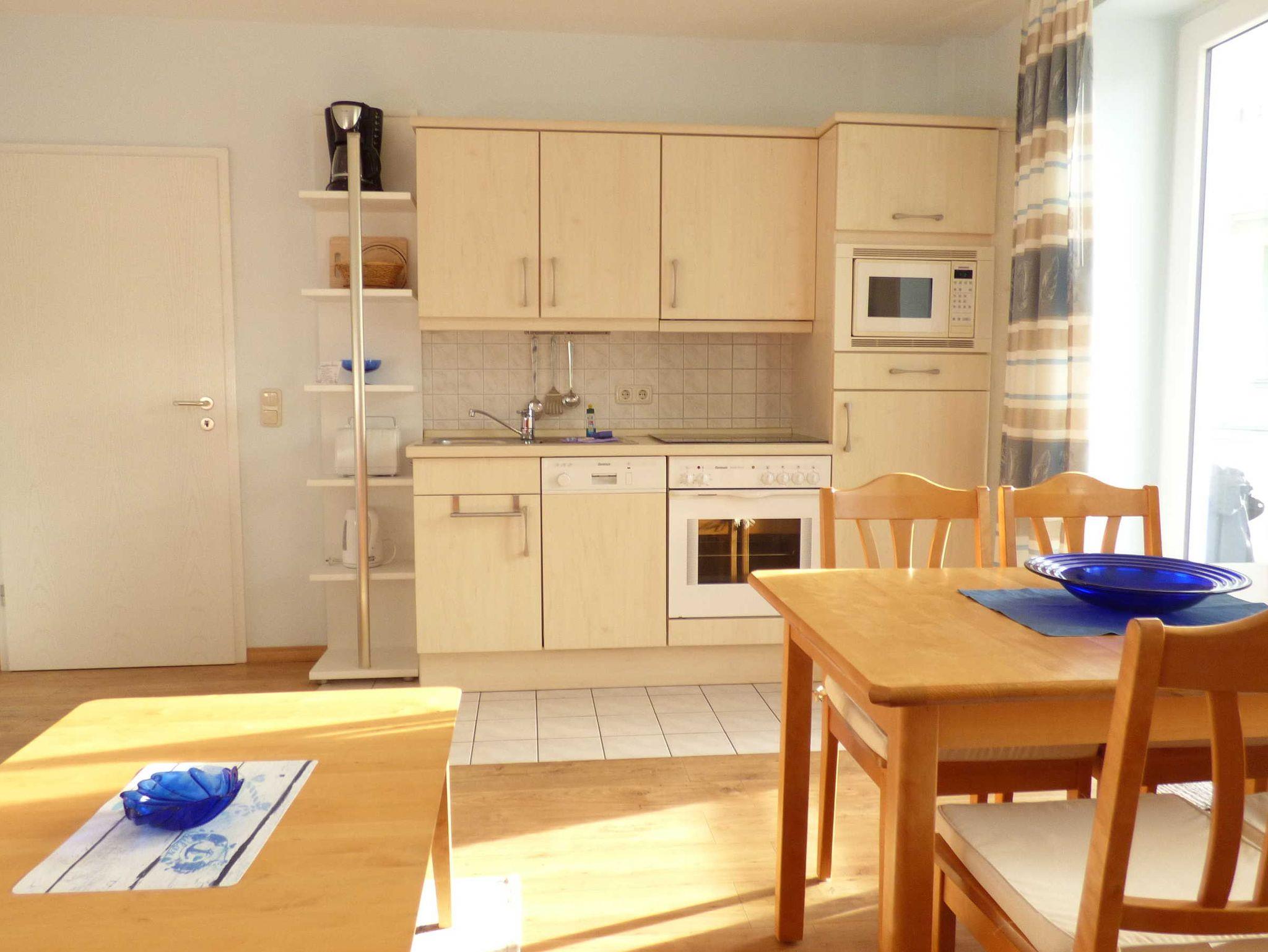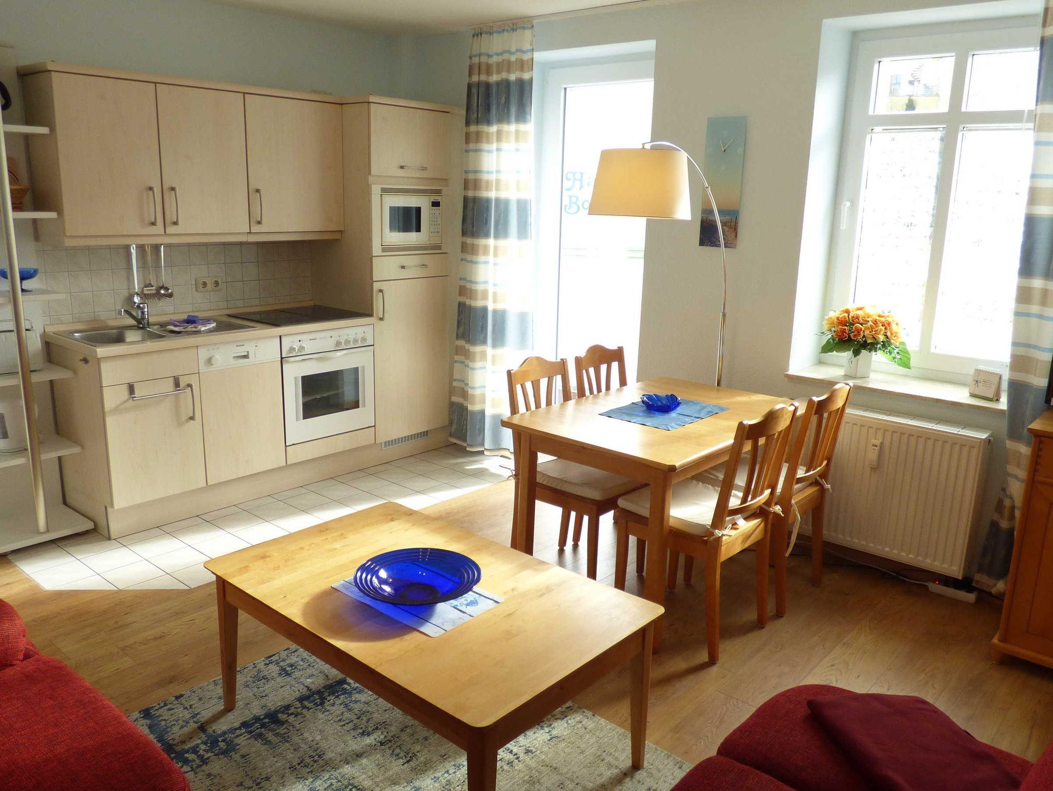 Die 40 qm große 2- Raumwohnung befindet sich in der 1. Etage. Der große Wohnraum beinhaltet eine vollausgestatte Küchenzeile mit Geschirrspüler, Backofen, Kühlschrank, Microwelle, Toaster, Kaffeemaschine, kompletten Geschirr und diversen Küchenutensilien. Ein bequemes Sofa (mit Schlaffunktion 1,20 m x 2,00 m), eine Essecke für 4 Personen und ein Flachbild-TV, kostenfreies WLAN, Bücher und Gesellschaftsspiele bieten alles,was einen gemütlichen Aufenthalt garaniert. Vom Wohnraum gelangt man auf den großzügigen separaten Südost-Balkon, wo kein Nachbar stört. Nach dem Blätterfall, im Winter ist ein seitlicher Meerblick möglich.