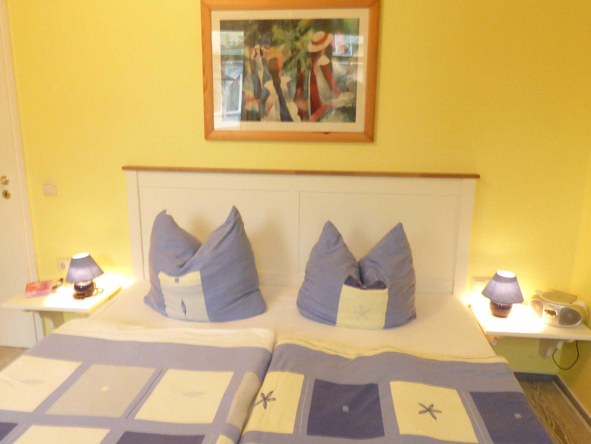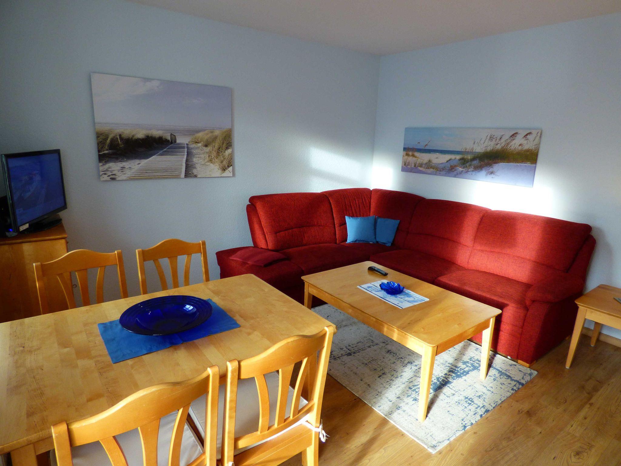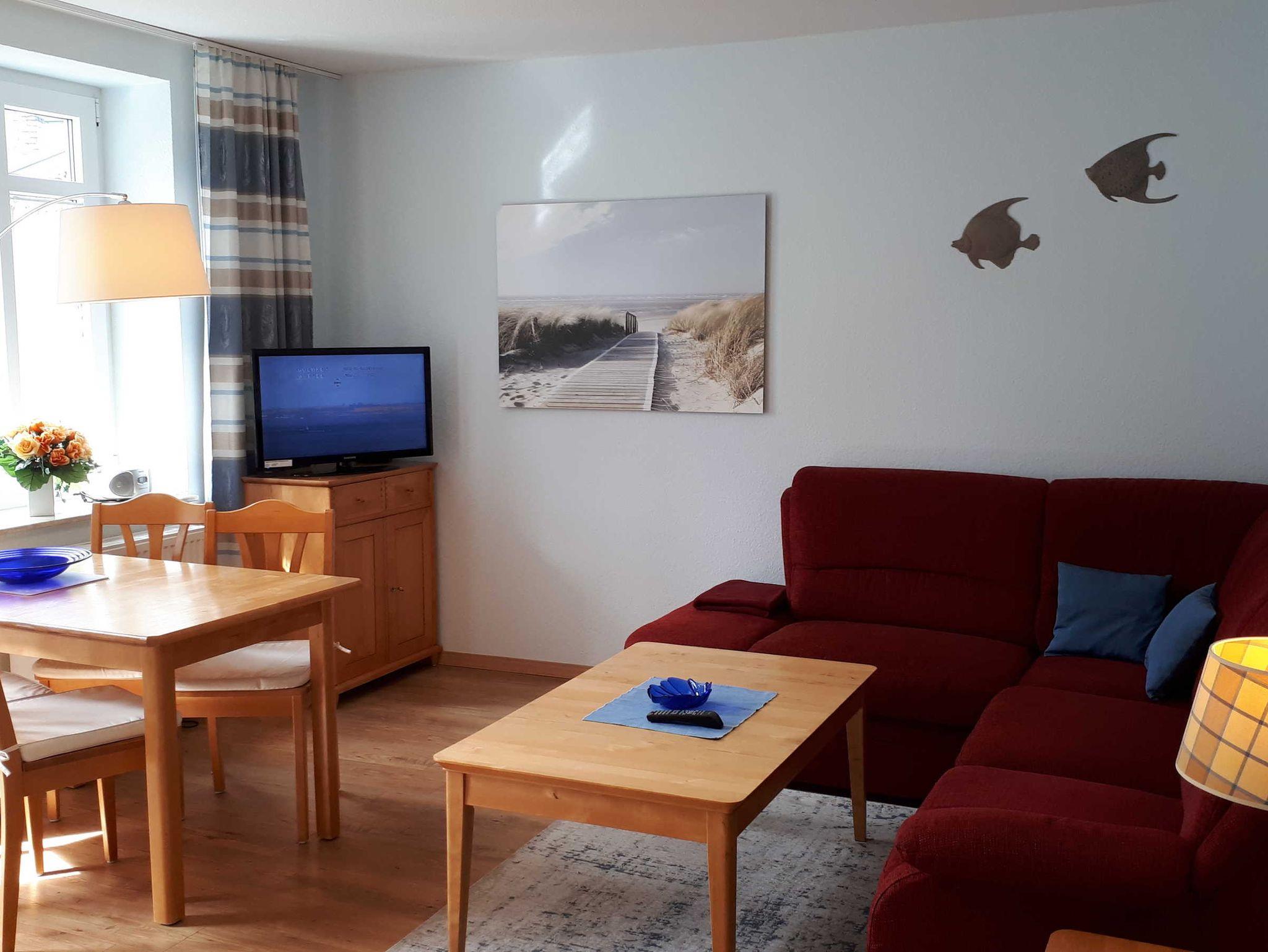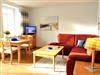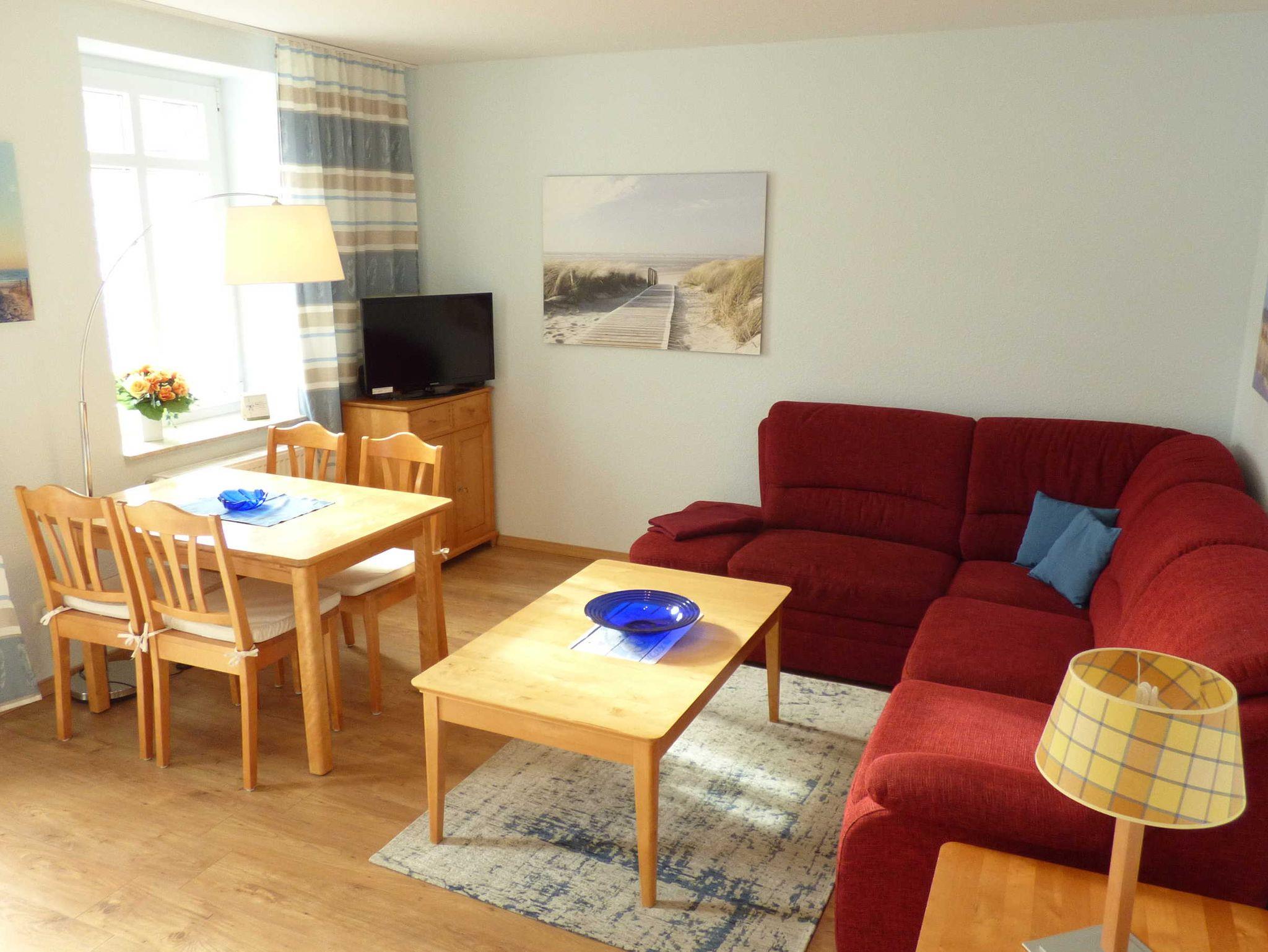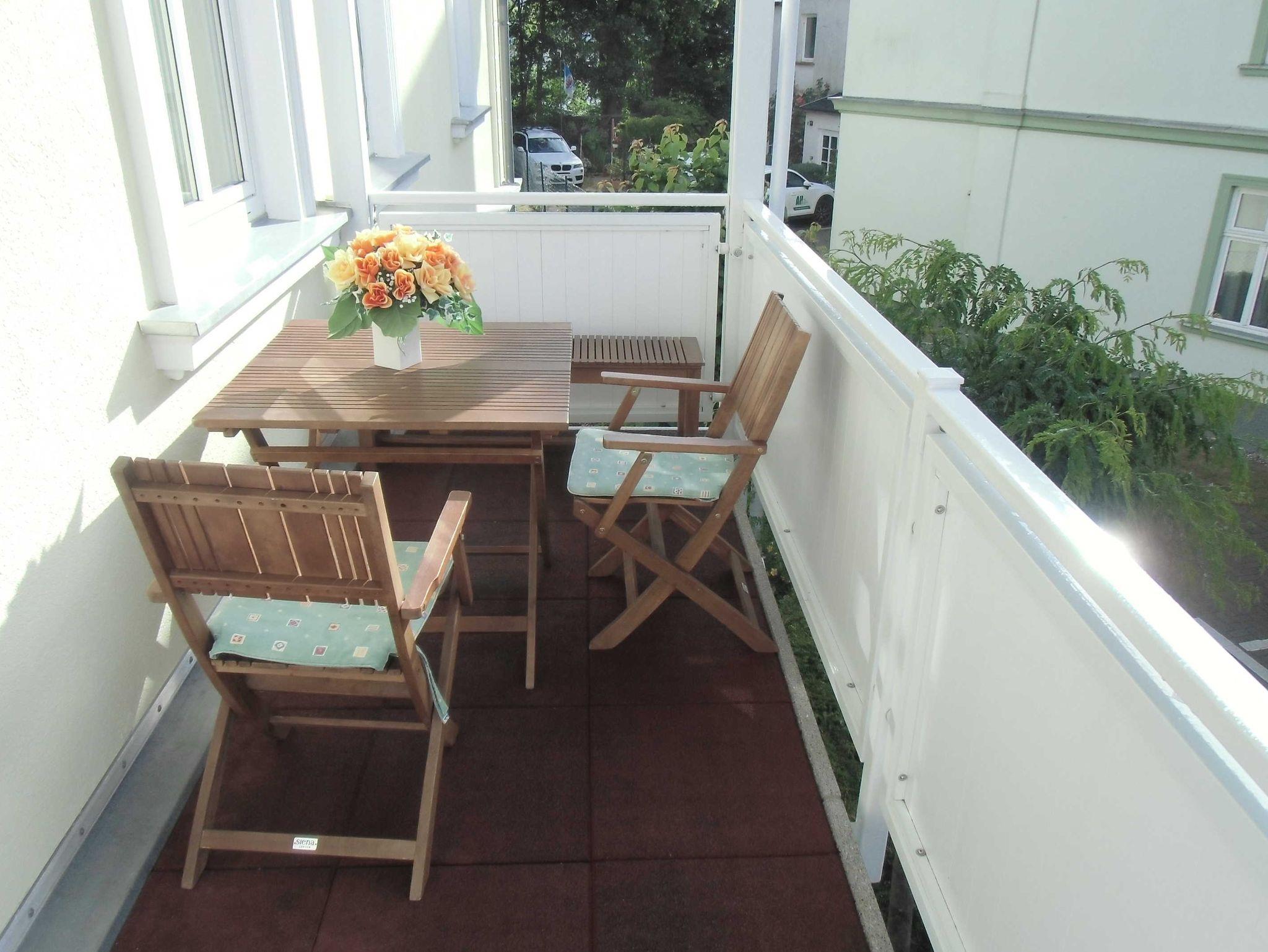 Die 40 qm große 2- Raumwohnung befindet sich in der 1. Etage. Der große Wohnraum beinhaltet eine vollausgestatte Küchenzeile mit Geschirrspüler, Backofen, Kühlschrank, Microwelle, Toaster, Kaffeemaschine, kompletten Geschirr und diversen Küchenutensilien. Ein bequemes Sofa (mit Schlaffunktion 1,20 m x 2,00 m), eine Essecke für 4 Personen und ein Flachbild-TV, kostenfreies WLAN, Bücher und Gesellschaftsspiele bieten alles,was einen gemütlichen Aufenthalt garaniert. Vom Wohnraum gelangt man auf den großzügigen separaten Südost-Balkon, wo kein Nachbar stört. Nach dem Blätterfall, im Winter ist ein seitlicher Meerblick möglich.