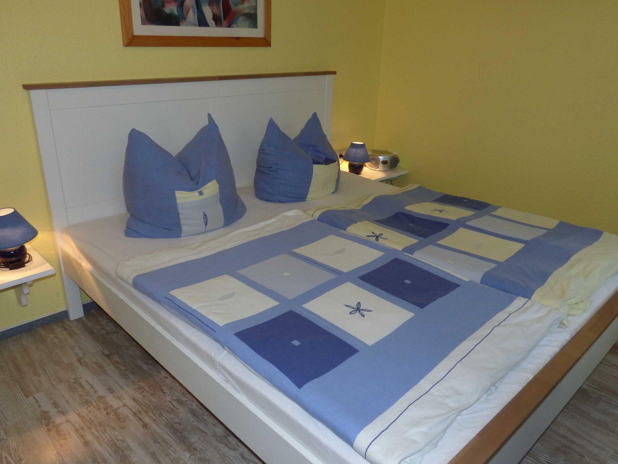 Über den Flur geht es ins Duschbad und zum Schlafzimmer mit Doppelbett (1,80 m x 1,90 m), großem Spiegel und geräumigen Kleiderschrank.