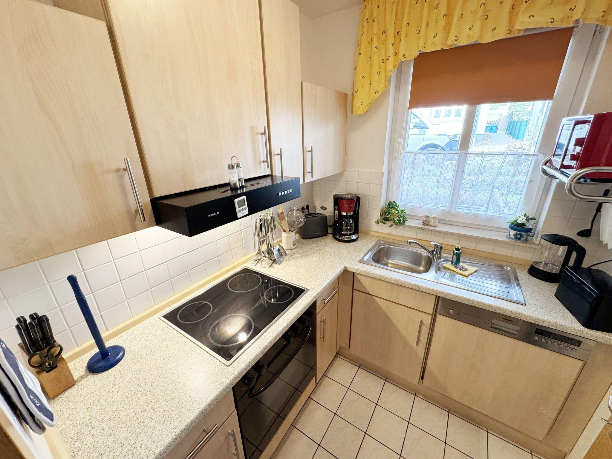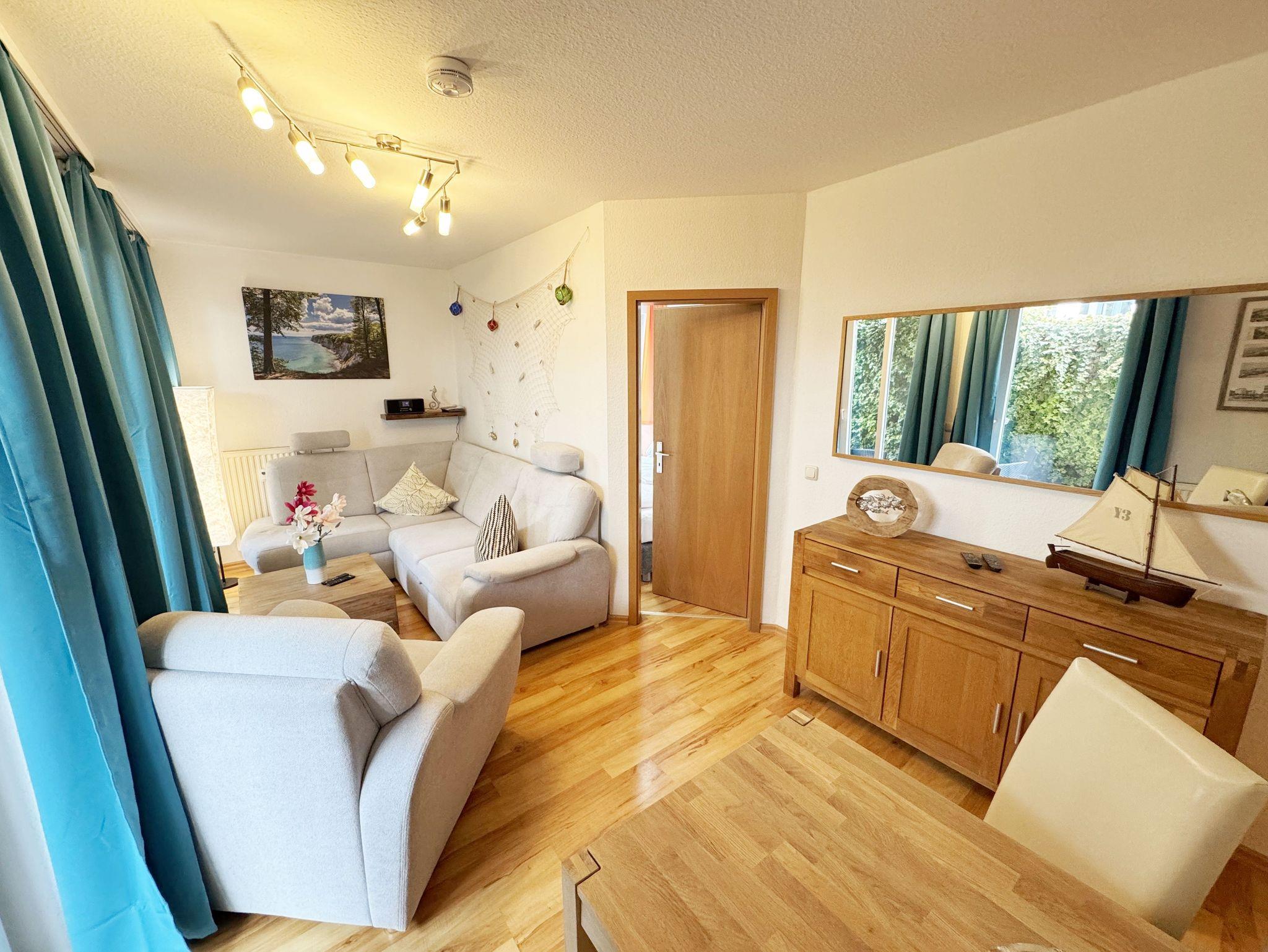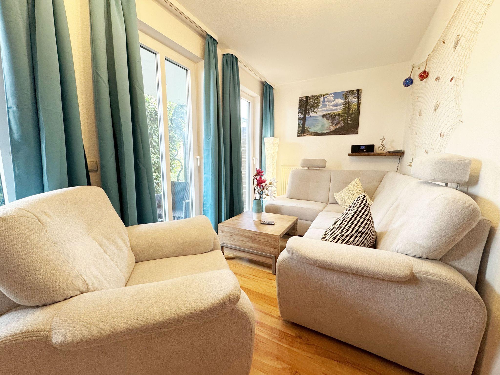 Die helle und komfortabel im Maritimen Stil eingerichtete Nichtraucherferienwohnung erreichen Sie im Erdgeschoss der Villa Linde. Mit ca. 50m² bietet sie Ihnen ausreichend Platz für max. 2 Personen. Sie betreten Ihre Wohnung über einen geräumigen Flur, in dem sich ein großer Kleiderschrank befindet. Wo sie zudem auch auf einen Wäscheständer, ein Bügelbrett und ein Bügeleisen zurückgreifen können. Der helle Wohn-/Essbereich öffnet sich mit bodentiefen Fenstertüren zu Ihrer bestuhlten Terrasse (S/W). Hier können sie ungestört Frühstücken oder laue Sommerabende ausklingen lassen. Eine bequeme Eck-Couch mit einem Couchtisch, einer Stehlampe, einem Sessel, einem Sideboard mit Flachbild-TV, einem DAB-Radio, einem WLAN-Zugang und ein Essplatz runden den Raum ab. Fast schon eine Besonderheit ist die separate Küche, welche mit einem Retro-Kühlschrank mit Eisfach, einem Backofen, einer Spülmaschine, einem Cerankochfeld, einer Mikrowelle, einer Kaffeemaschine, einem Toaster, einem Wasserkocher, einem Mixer, einem Pürierstab und weiteren Küchenutensilien ausgestattet ist. Im gemütlich eingerichteten Schlafzimmer erwartet Sie ein Boxspringbett (1,80m x 2,00m), Nachttischablagen, eine Verdunklungsmöglichkeit sowie ein Insektenschutz welche für einen ruhigen Schlaf dienen. Das innenliegende Badezimmer wurde mit einen Waschplatz, einem WC, einem Fön, einem Kosmetikspiegel, einer Dusche mit flachem Einstieg und als Highlight eine beleuchtete Massagedusche mit 6 Modi sowie mit Regen-, Wasserfallfunktion ausgestattet. 1 Hund ist mit seinem eigenen Schlafplatz ein gern gesehener Gast. Ihre mitgebrachten oder geliehenen Fahrräder können Sie im Gemeinschaftskeller unterstellen. Ein PKW-Stellplatz (Nr.23) steht Ihnen hinter dem Haus inklusive zur Verfügung. Die Erstausstattung eines Wäschepaketes (komplette Bettwäsche, 1 Duschhandtuch, 2 kleine Handtücher, 2 Geschirrhandtücher) können Sie bis 14 Tage vor Anreise gegen einen Aufpreis dazu buchen oder durch eigenes Ergänzen.