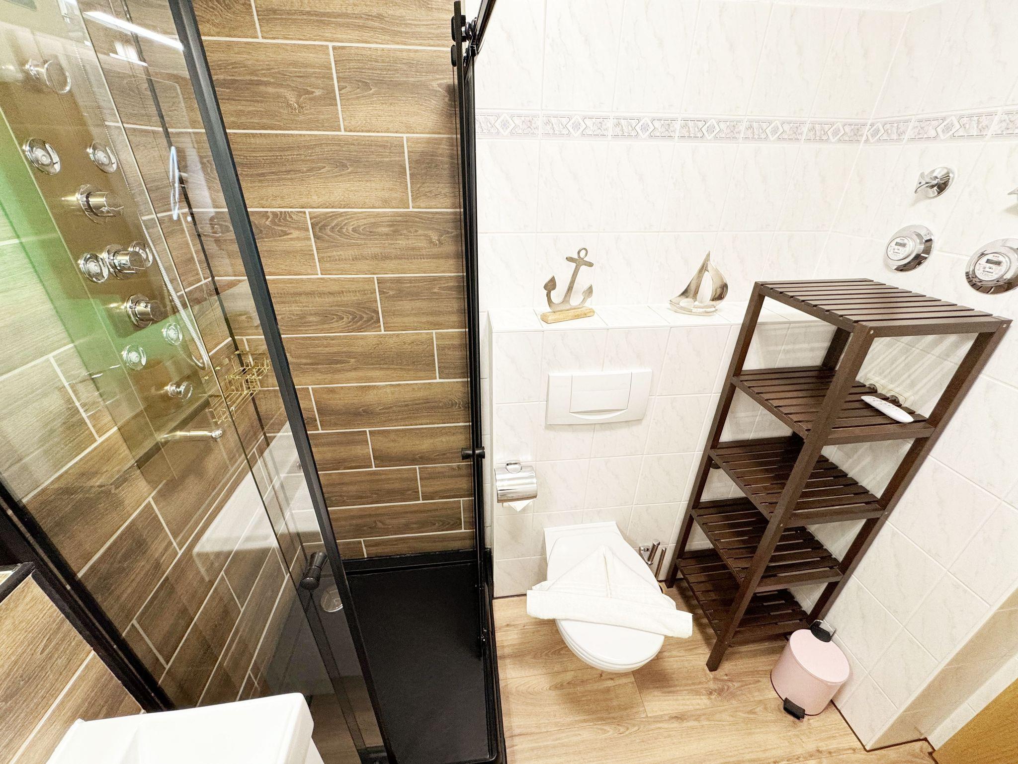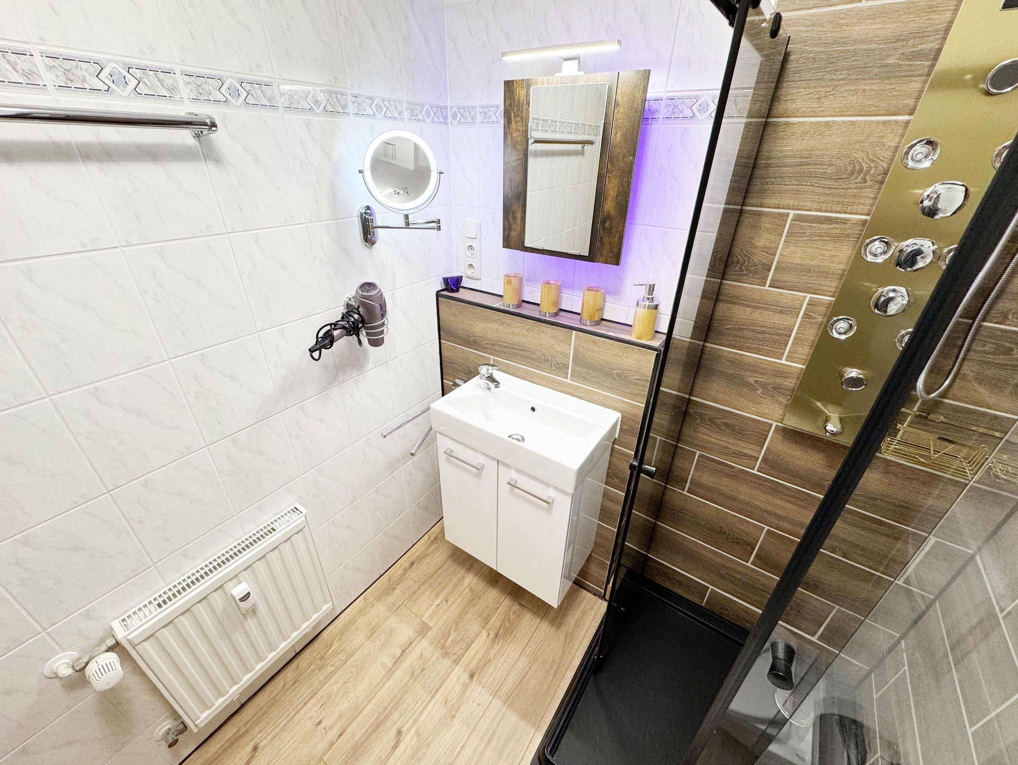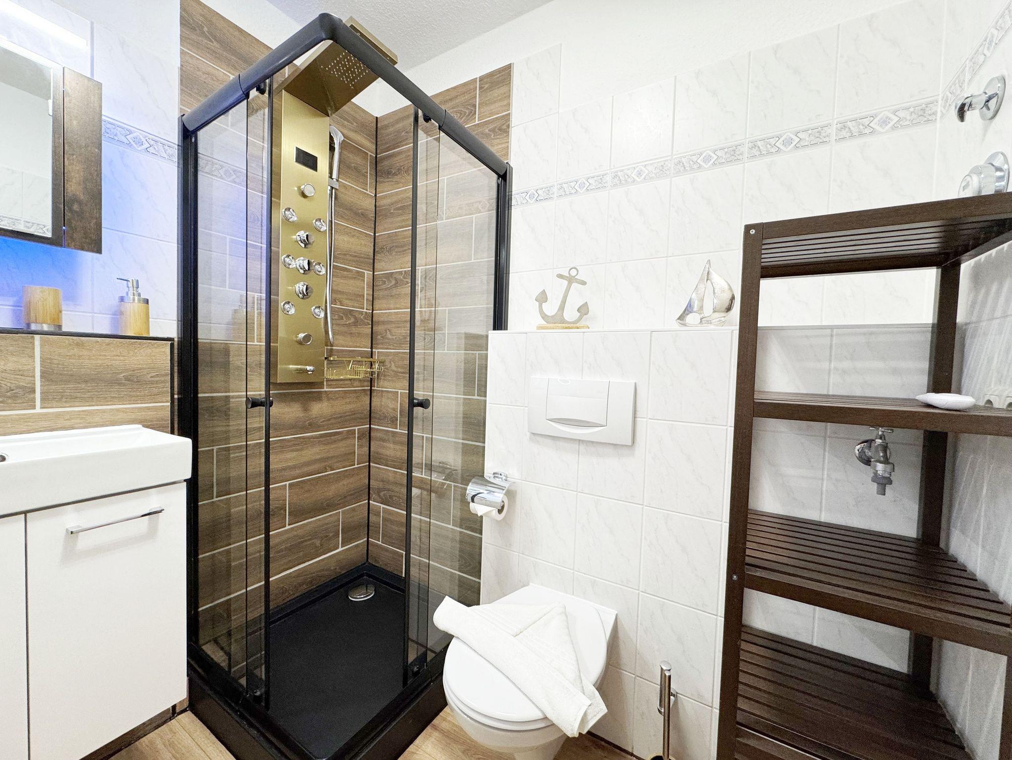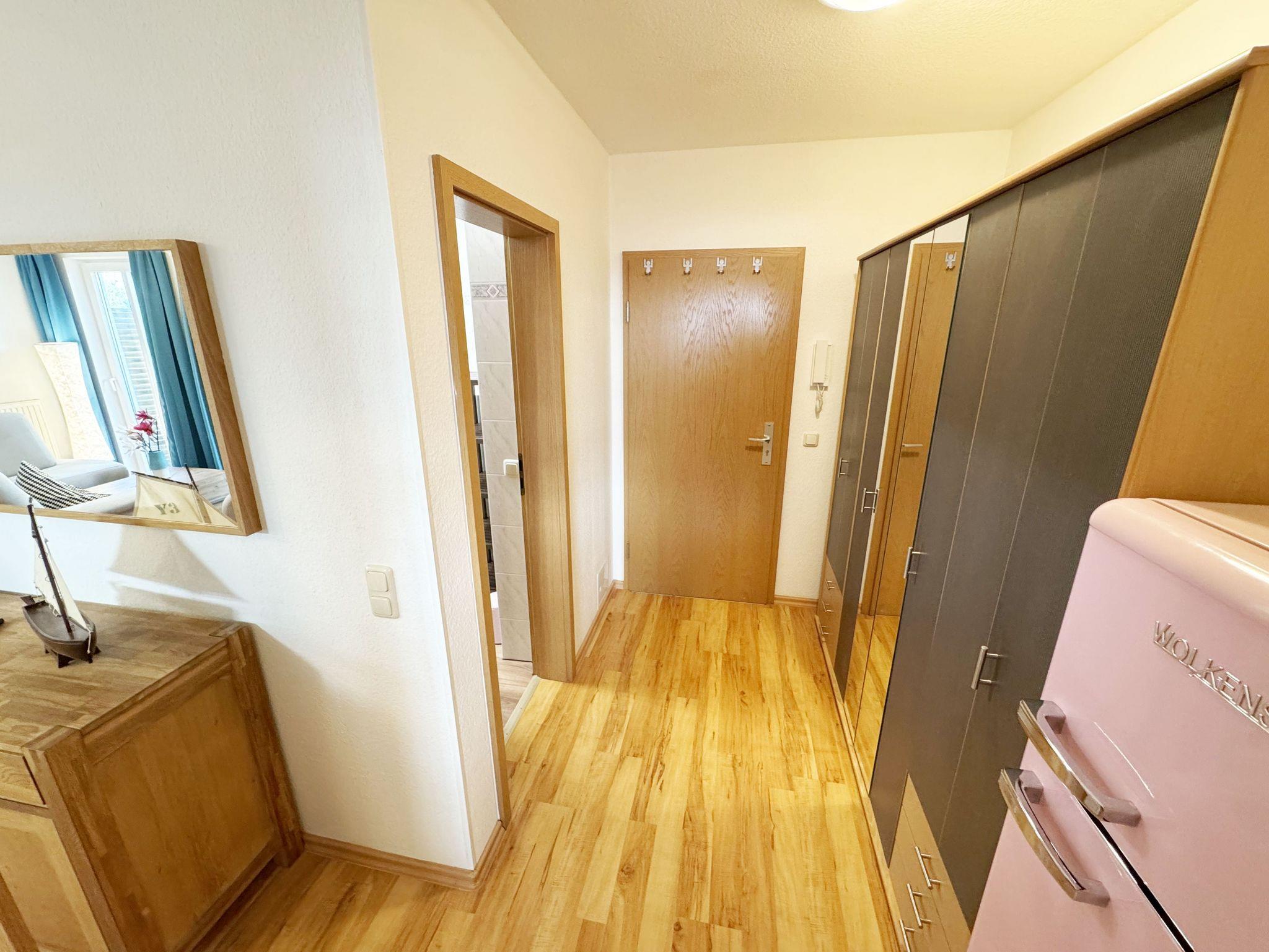 Die helle und komfortabel im Maritimen Stil eingerichtete Nichtraucherferienwohnung erreichen Sie im Erdgeschoss der Villa Linde. Mit ca. 50m² bietet sie Ihnen ausreichend Platz für max. 2 Personen. Sie betreten Ihre Wohnung über einen geräumigen Flur, in dem sich ein großer Kleiderschrank befindet. Wo sie zudem auch auf einen Wäscheständer, ein Bügelbrett und ein Bügeleisen zurückgreifen können. Der helle Wohn-/Essbereich öffnet sich mit bodentiefen Fenstertüren zu Ihrer bestuhlten Terrasse (S/W). Hier können sie ungestört Frühstücken oder laue Sommerabende ausklingen lassen. Eine bequeme Eck-Couch mit einem Couchtisch, einer Stehlampe, einem Sessel, einem Sideboard mit Flachbild-TV, einem DAB-Radio, einem WLAN-Zugang und ein Essplatz runden den Raum ab. Fast schon eine Besonderheit ist die separate Küche, welche mit einem Retro-Kühlschrank mit Eisfach, einem Backofen, einer Spülmaschine, einem Cerankochfeld, einer Mikrowelle, einer Kaffeemaschine, einem Toaster, einem Wasserkocher, einem Mixer, einem Pürierstab und weiteren Küchenutensilien ausgestattet ist. Im gemütlich eingerichteten Schlafzimmer erwartet Sie ein Boxspringbett (1,80m x 2,00m), Nachttischablagen, eine Verdunklungsmöglichkeit sowie ein Insektenschutz welche für einen ruhigen Schlaf dienen. Das innenliegende Badezimmer wurde mit einen Waschplatz, einem WC, einem Fön, einem Kosmetikspiegel, einer Dusche mit flachem Einstieg und als Highlight eine beleuchtete Massagedusche mit 6 Modi sowie mit Regen-, Wasserfallfunktion ausgestattet. 1 Hund ist mit seinem eigenen Schlafplatz ein gern gesehener Gast. Ihre mitgebrachten oder geliehenen Fahrräder können Sie im Gemeinschaftskeller unterstellen. Ein PKW-Stellplatz (Nr.23) steht Ihnen hinter dem Haus inklusive zur Verfügung. Die Erstausstattung eines Wäschepaketes (komplette Bettwäsche, 1 Duschhandtuch, 2 kleine Handtücher, 2 Geschirrhandtücher) können Sie bis 14 Tage vor Anreise gegen einen Aufpreis dazu buchen oder durch eigenes Ergänzen.