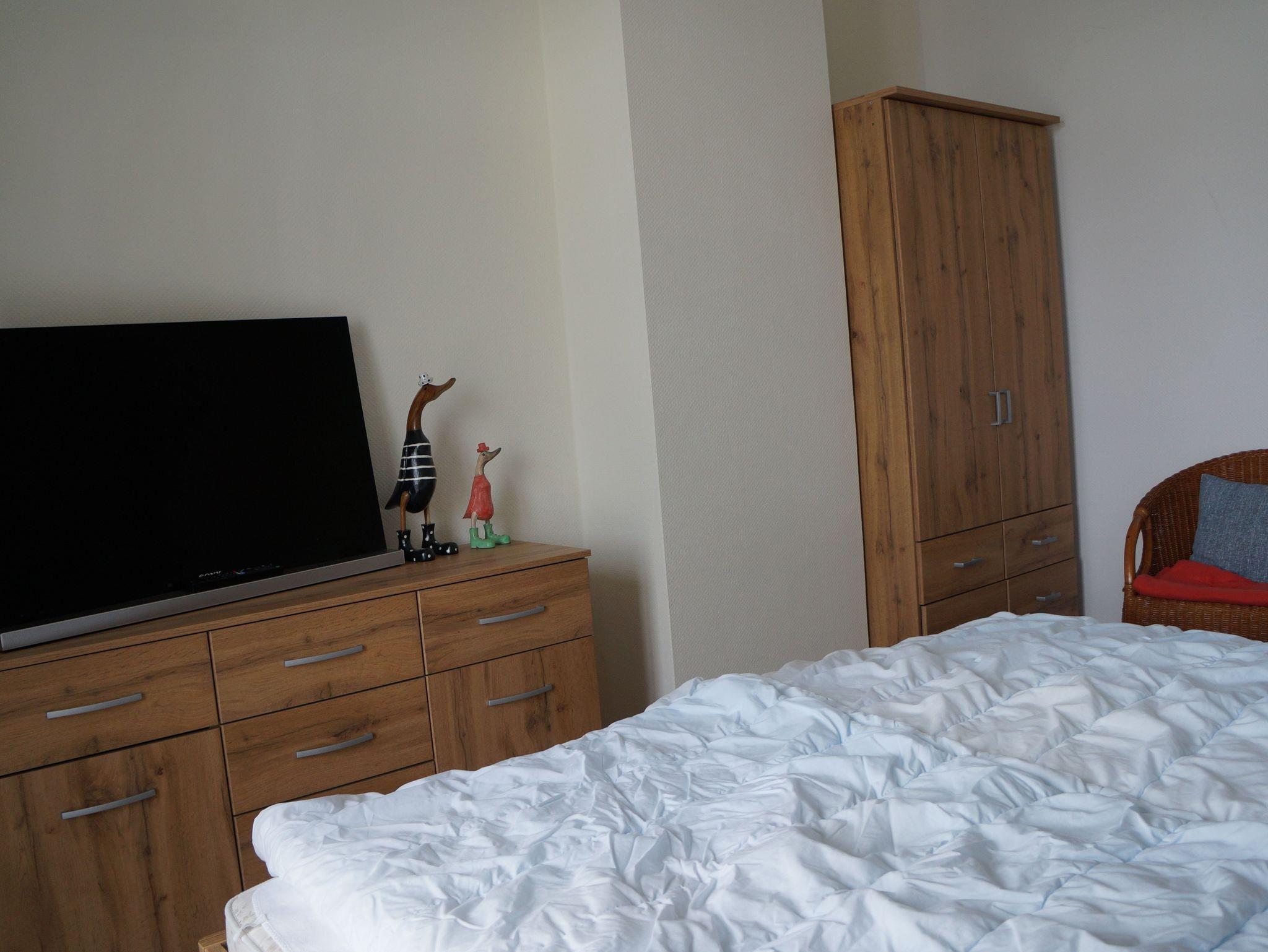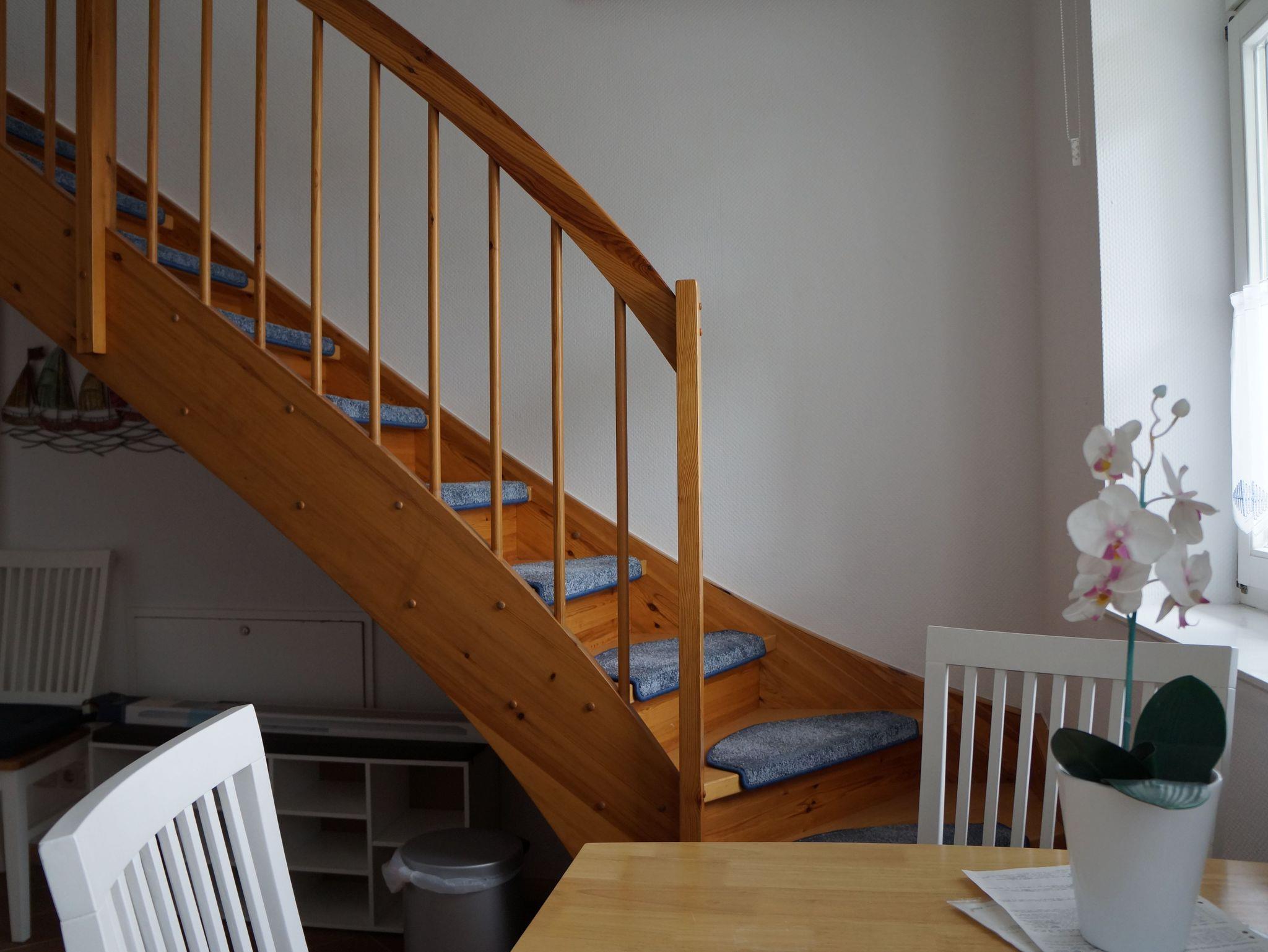 Der Schlafraum ist über eine Treppe innerhalb der Ferienwohnung zu erreichen. Zur Wohnung gehören weiterhin ein Wohnzimmer, eine offene Küche und ein Dusch-WC-Bad.