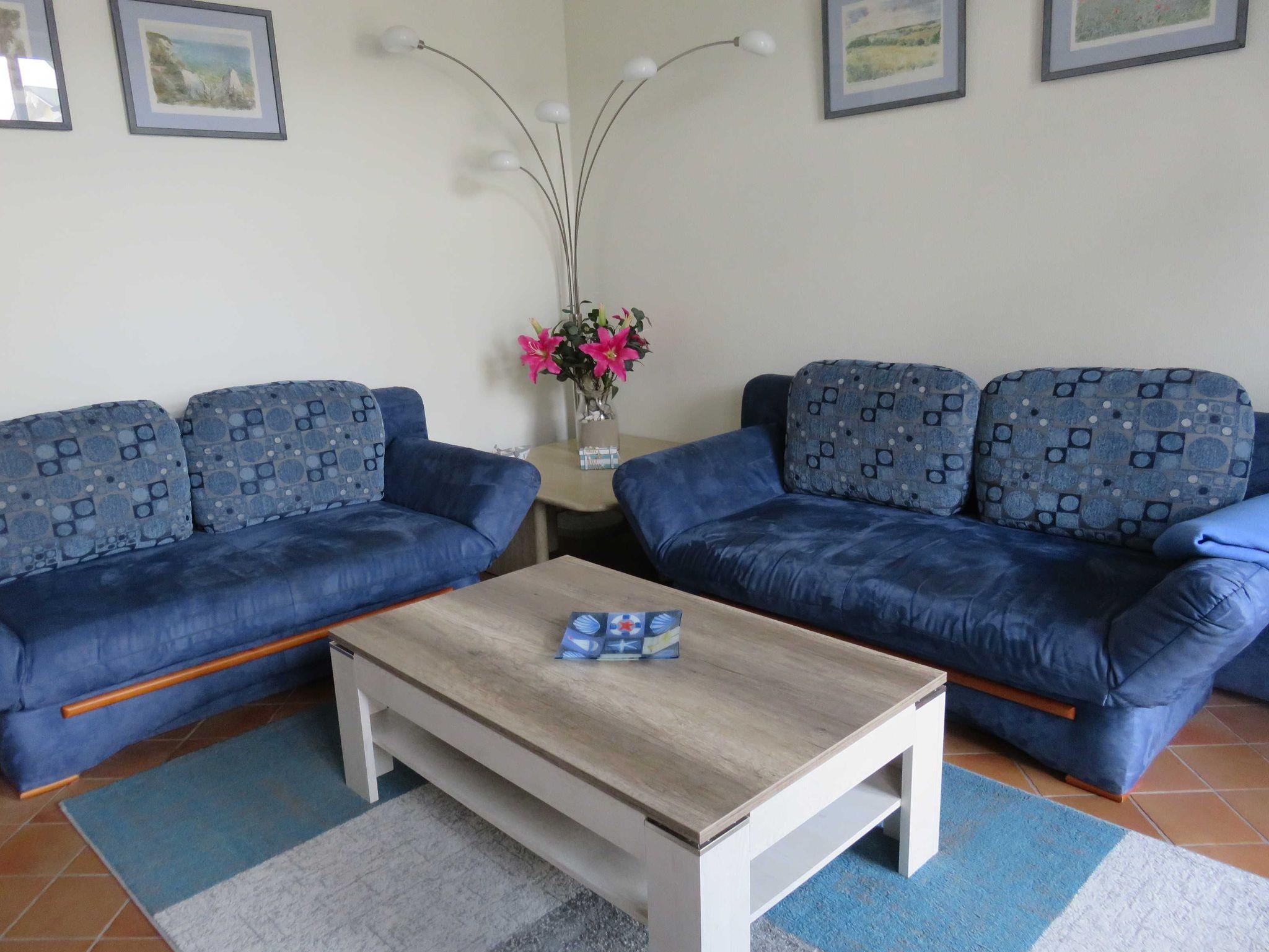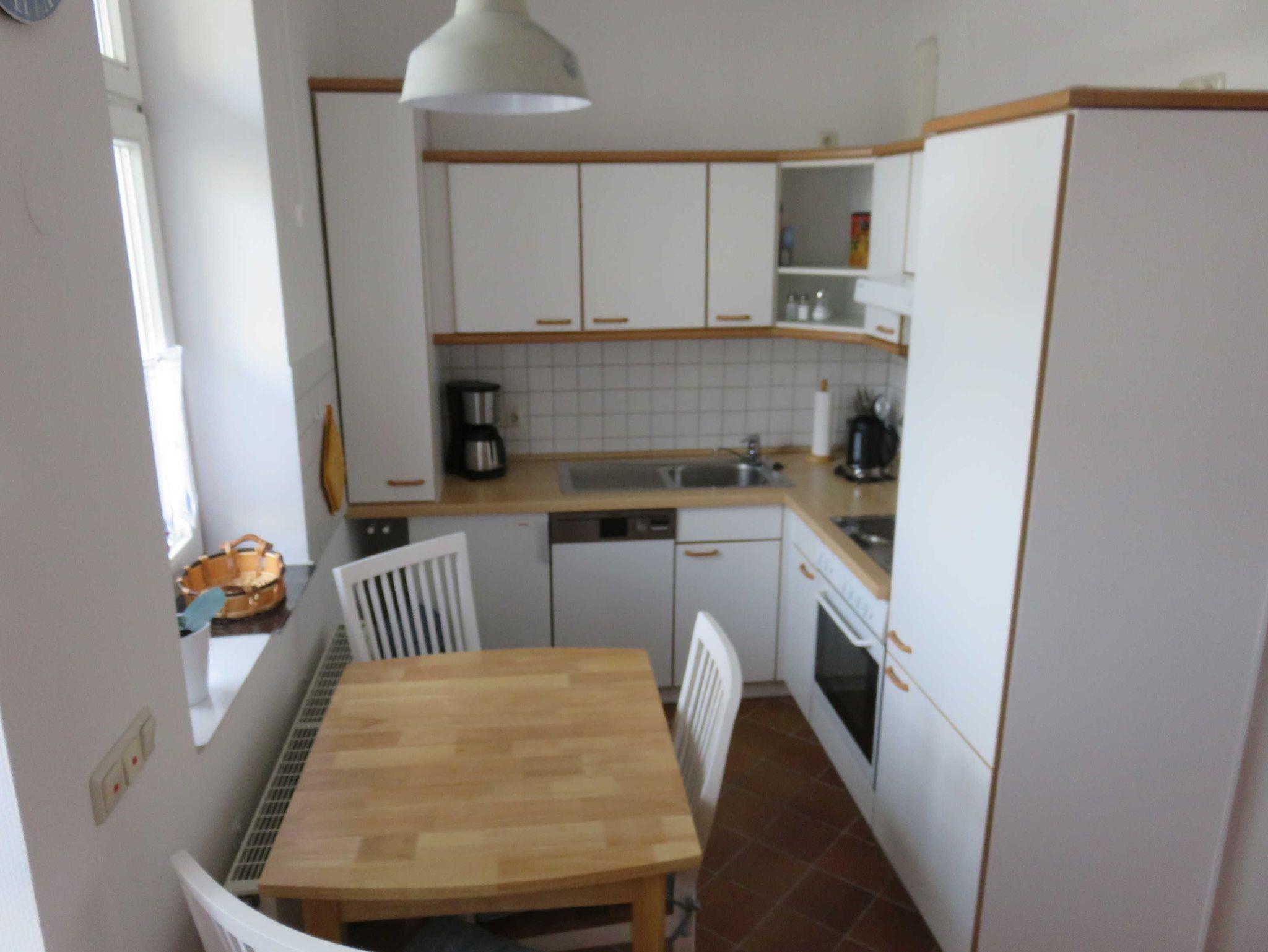 Die Nichtraucherwohnung bietet Ihnen ein geschmackvoll und gemütliches - mit zwei Schlafcouchen, einer kleinen Anbauwand, einem Flachbild-TV, DVD-Player und Stereoradio - eingerichtetes Wohnzimmer. Der Fußboden ist komplett gefliesst. Der Schlafraum in der oberen Etage ist mit einem Doppelbett, einem geräumigen Kleiderschrank und TV ausgestattet und verfügt über Auslegware. Abgerundet wird das Wohnambiete durch sich an beiden Räume anschließende, jeweils getrennt zu betretende Balkone, welche zur Ostsee ausgerichtet sind und einen kleinen Blick auf das Meer gewähren. In der zweckmäßig über Eck eingerichteten Wohnküche finden Sie neben dem üblichen Standard einen Herd mit 4 Kochplatten und Backofen, sowie einen Geschirrspüler.