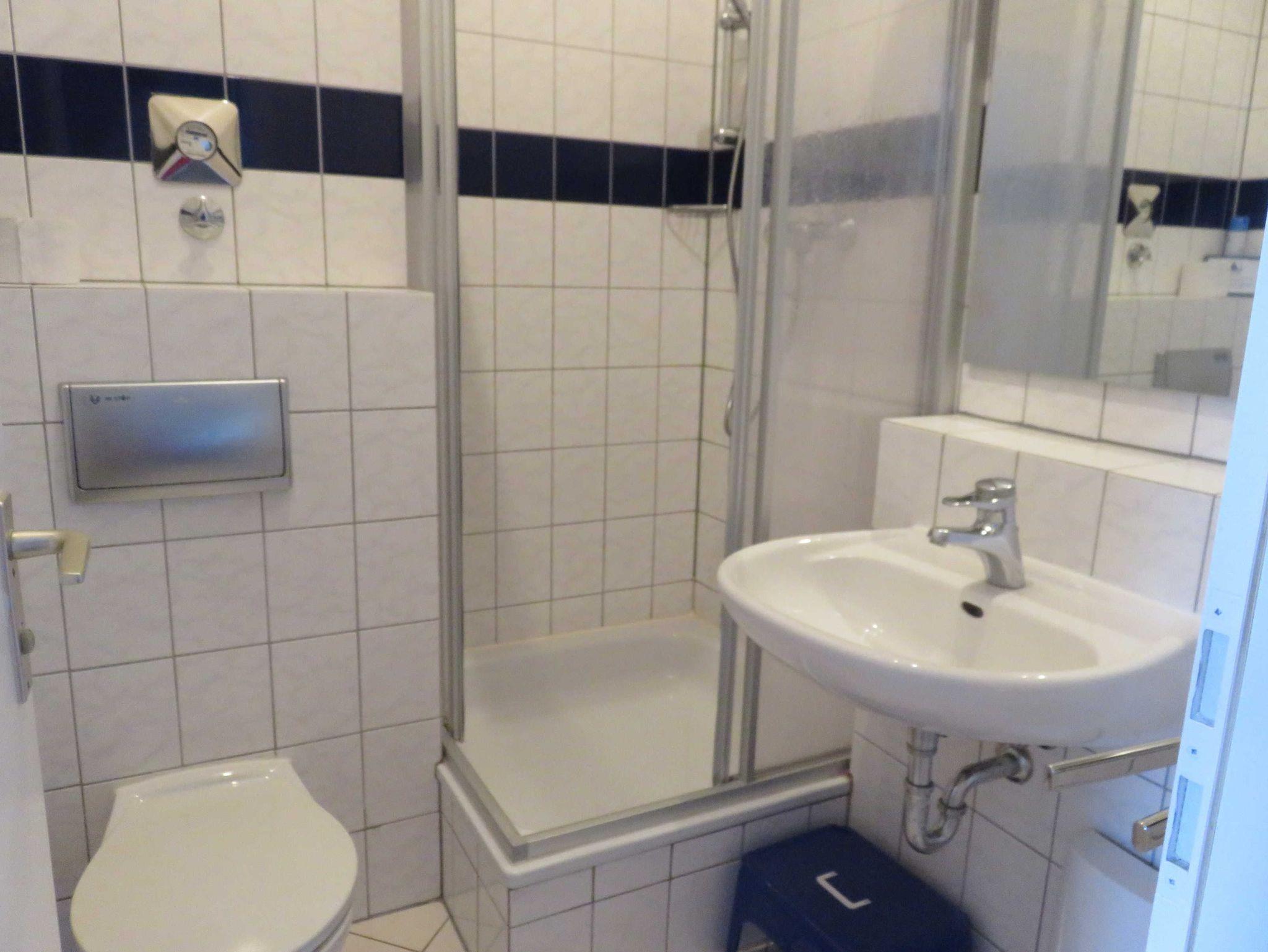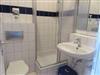 Das Bad ist vollkommen gefliest und mit einer Dusche ausgestattet.