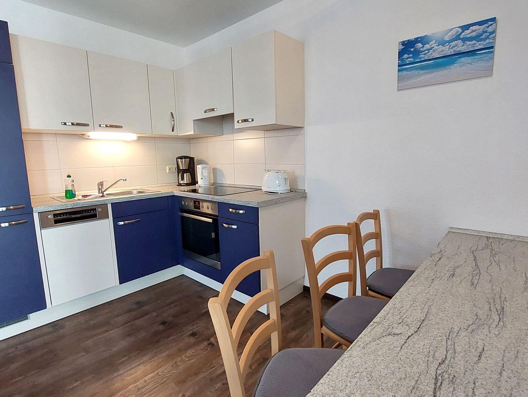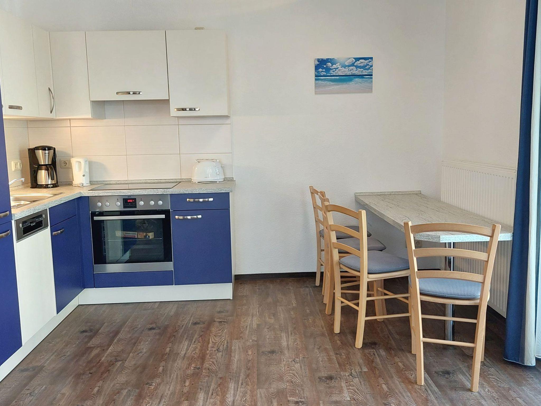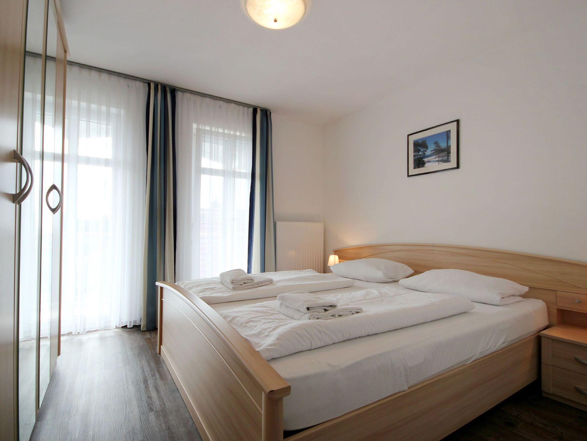 Diese freundliche Wohnung ist aufgeteilt in einen Wohnraum mit Balkon und integrierter Küchenzeile, zwei Schlafzimmer und ein Bad mit Dusche, Waschtisch und WC. Das Wohnzimmer begrüßt Sie mit einem Schlafsofa und Sessel sowie Flachbild-TV. Das Hauptschlafzimmer verfügt über ein Doppelbett (1,80m x 2m) sowie einen Kleiderschrank. Der zweite Schlafraum ebenso mit Balkon begrüßt Sie mit einem Etagenbett, Kleiderschrank und TV. Die Küchenzeile ist mit Backofen, Geschirrspüler, Cerankochfeld, Kühlschrank mit kleinem Gefrierfach, Cerankochfeld, Mikrowelle, Kaffeemaschine, Wasserkocher und Toaster ausgestattet. Highlights: Kostenfreies WLAN sowie ein frei wählbarer PKW-Stellplatz direkt am Haus. Haustiere sind in dieser Wohnung herzlich willkommen.