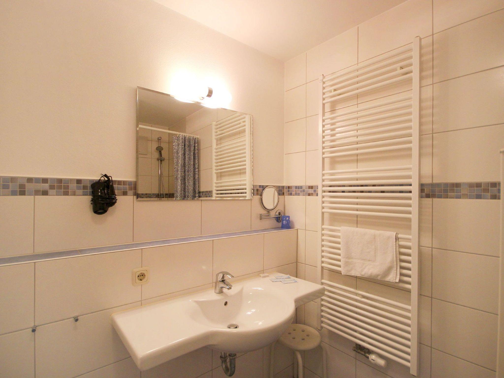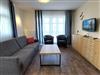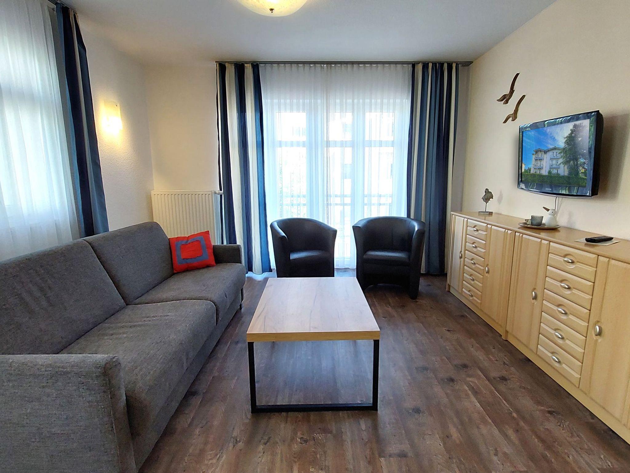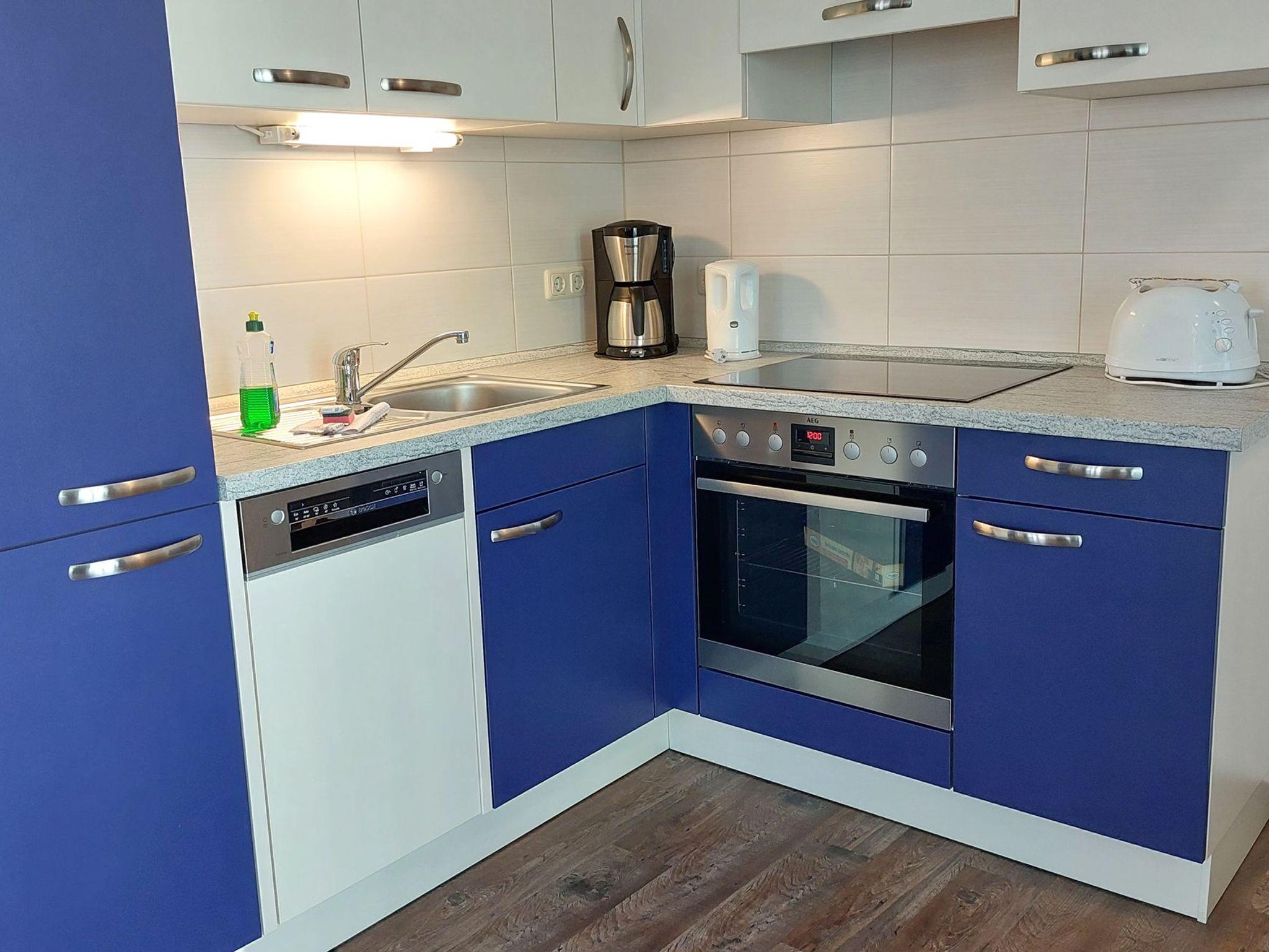 Diese freundliche Wohnung ist aufgeteilt in einen Wohnraum mit Balkon und integrierter Küchenzeile, zwei Schlafzimmer und ein Bad mit Dusche, Waschtisch und WC. Das Wohnzimmer begrüßt Sie mit einem Schlafsofa und Sessel sowie Flachbild-TV. Das Hauptschlafzimmer verfügt über ein Doppelbett (1,80m x 2m) sowie einen Kleiderschrank. Der zweite Schlafraum ebenso mit Balkon begrüßt Sie mit einem Etagenbett, Kleiderschrank und TV. Die Küchenzeile ist mit Backofen, Geschirrspüler, Cerankochfeld, Kühlschrank mit kleinem Gefrierfach, Cerankochfeld, Mikrowelle, Kaffeemaschine, Wasserkocher und Toaster ausgestattet. Highlights: Kostenfreies WLAN sowie ein frei wählbarer PKW-Stellplatz direkt am Haus. Haustiere sind in dieser Wohnung herzlich willkommen.