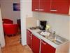 Eingangsbereich mit gut ausgestatteter Pentriküche mit: 2-Zonen-Kochfeld, kleinem Kühlschrank mit Frostfach und Spüle, Toaster, Kaffeemaschine, Wasserkocher und Küchenutensilien.