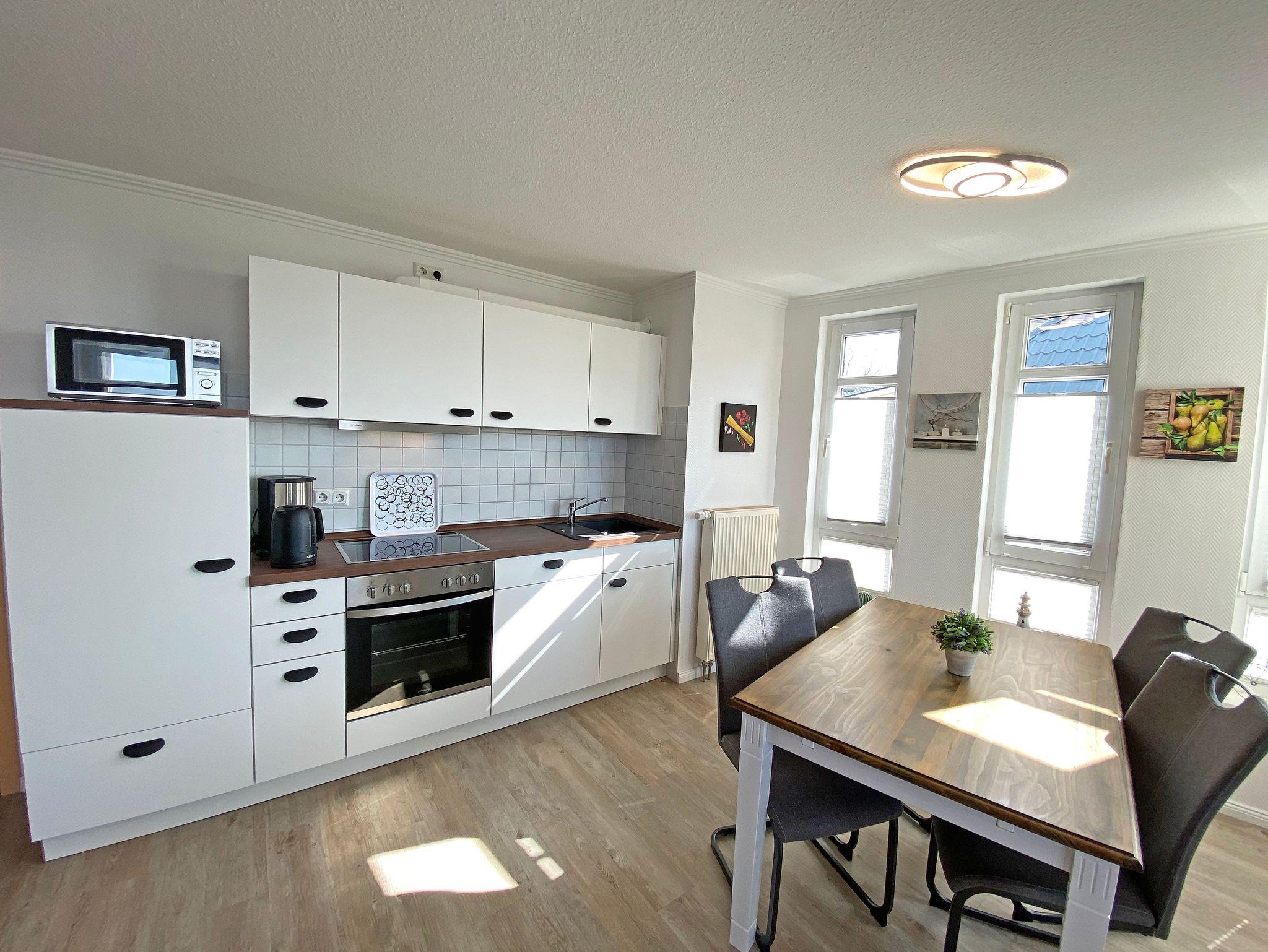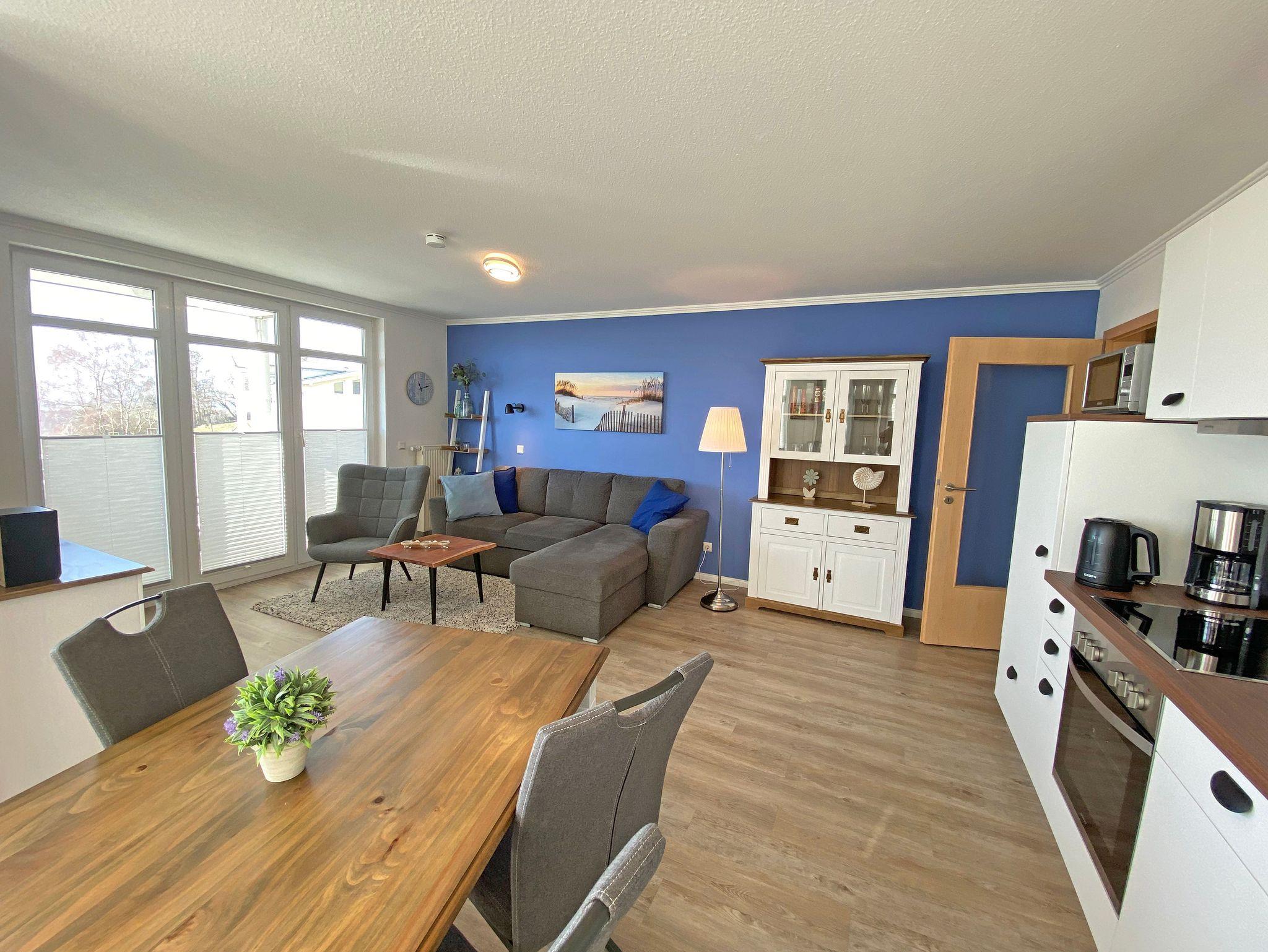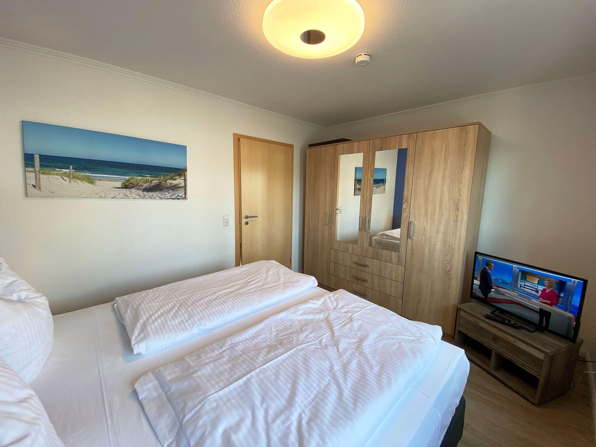 Unsere komfortable Nichtraucherwohnung von ca. 60 qm für 2 bis max. 4 Erwachsene und 1 Kleinkind im Kinderreisebett bis 3 Jahre verfügt über ein Schlafzimmer mit einem Boxspringbett (1,80m x 2,00m), einen Kleiderschrank, Nachttische, ein Sideboard sowie ein zweiter Smart-TV. Im zweiten kleineren Schlafzimmer befindet sich ein Boxspringbett (1,40m x 2,00m), ein weiterer Kleiderschrank sowie ein Nachttisch. Vom hellen Wohnbereich mit einem 2-Sitzer, Sessel, Vitrine, TV-Board, mit Smart TV und Ministereoanlage gelangen Sie auf den bestuhlten Balkon mit Sonnenschirm und können von hier aus den einmaligen Blick auf die Ostsee genießen. WLAN ist für Sie inklusive nutzbar! Die moderne Küchenzeile bietet Ihnen einen Esstisch mit 4 Stühlen, einen Geschirrspüler, ein 4 Zonen-Ceranfeld mit Backofen, eine Mikrowelle, ein Toaster, eine Kaffeemaschine, ein Wasserkocher, ein Kühlschrank mit Eisfach, eine Dunstabzugshaube sowie diverse Küchenutensilien. Das Badezimmer mit Fenster ist mit einer Dusche, einem WC, ein Kosmetikspiegel und einen Fön ausgestattet. Die Fenster verfügen teilweise über einen Insektenschutz. Ein Kinderreisebett (ohne Matratze und Bett Inlett) und ein Hochstuhl können für unsere kleinen Gäste gegen eine Gebühr gestellt werden. Ein PKW-Stellplatz (Nr. 04) sowie eine Unterstellmöglichkeit für Ihre Fahrräder ist direkt am Haus vorhanden. Ein Haustier ist gegen eine Gebühr ein gern gesehener Gast. Die Erstausstattung eines Wäschepaketes (komplette Bettwäsche, 1 Duschhandtuch, 1 kleines Handtuch) können Sie bis 14 Tage vor der Anreise gegen einen Aufpreis dazu buchen oder durch eigene ergänzen. Ab 2 gebuchten Paketen erhalten Sie einmalig 1 Geschirrtuch und einen Duschvorleger dazu.