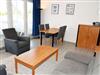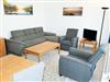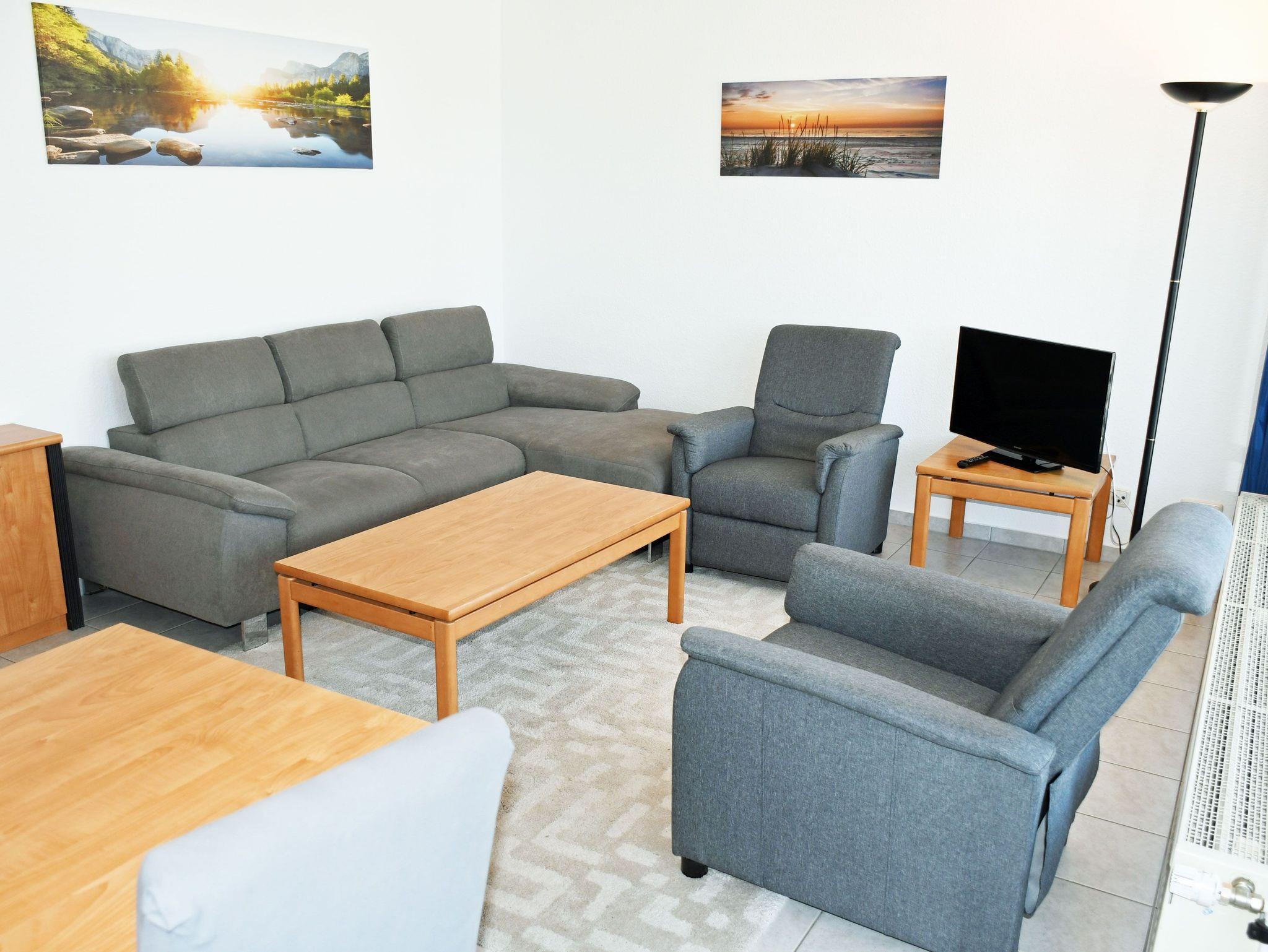 · Wohnbereich mit ausziehbarer, moderner Doppelbettschlafcouch (150 x 200 cm), 2 Sesseln, Couchtisch, Anrichte, Flat-TV, Radio und Esstisch mit 6 Stühlen