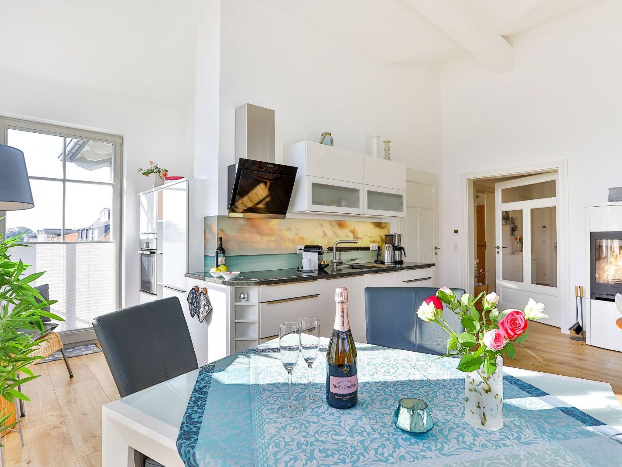 Die Wohnung besticht durch ihren hochwertigen, modernen und gemütlichen hellen Wohnraum, der durch einen Kamin für eine wohlige Atmosphäre sorgt. Die voll ausgestattete Markenküche mit Geschirrspüler, Mikrowelle, Backofen, Cerankochfeld, Kühl-und Gefrierkombination, Wasserkocher und Kaffeevollautomat lässt keine Wünsche offen. Auch hier befindet sich ein großer LED-Smart TV mit einem Blu Ray-Player und für vollendeten Musikgenuss eine Bose Sound Touch. Anlage