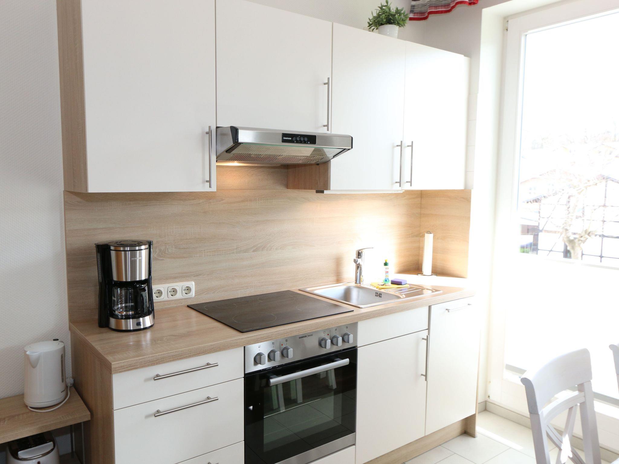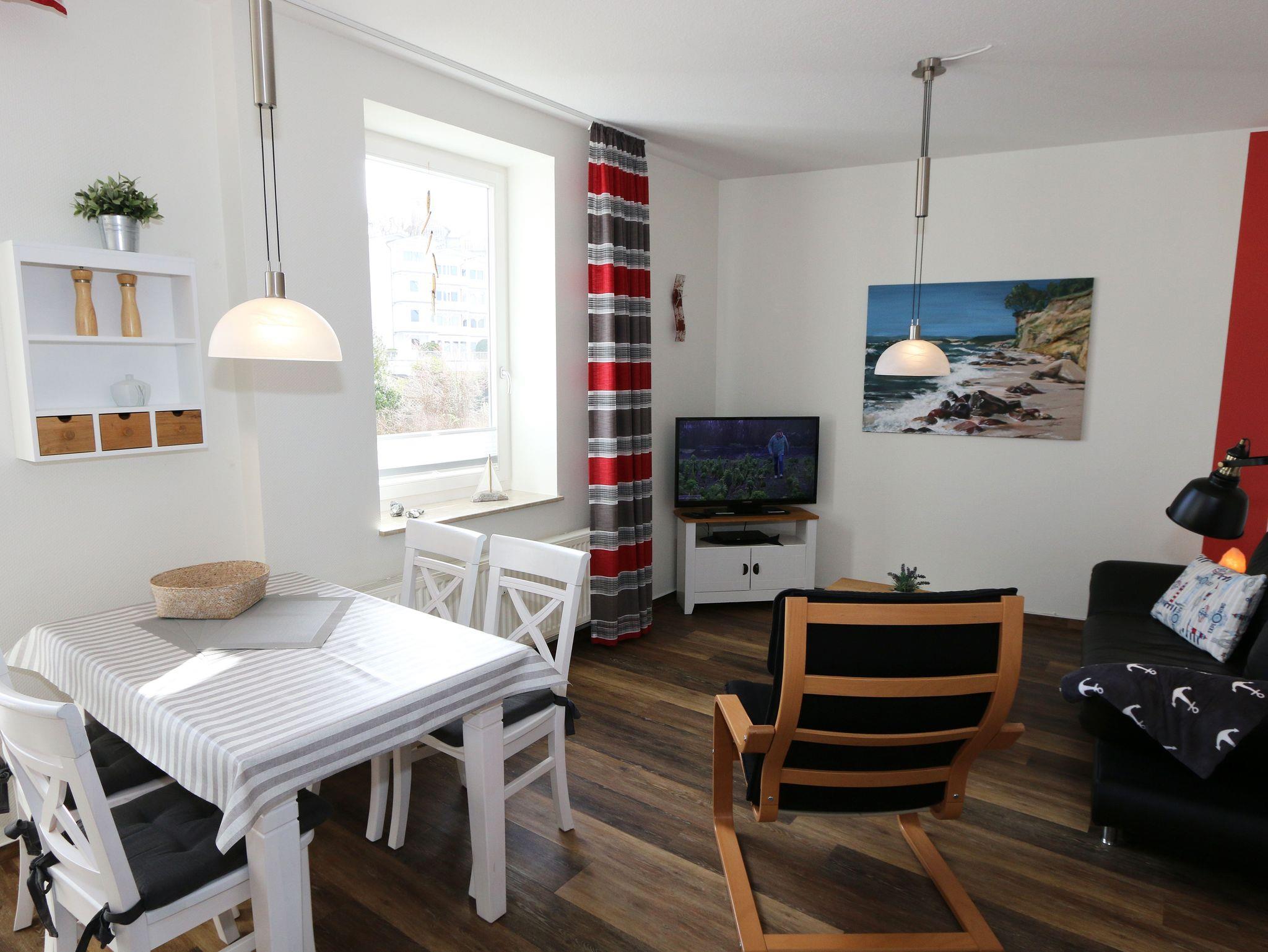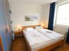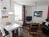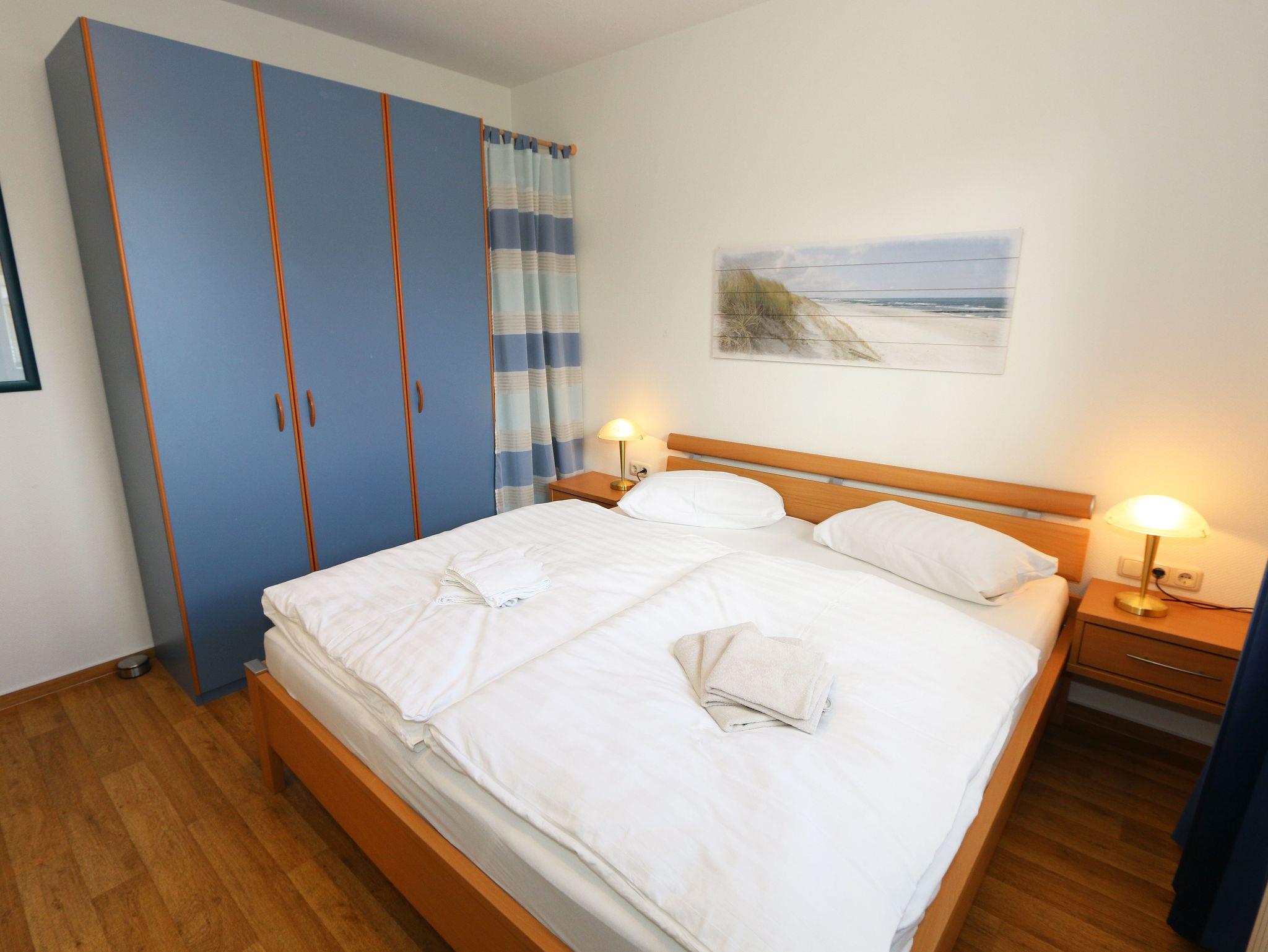 Die helle und freundliche 2-Raumferienwohnung im 2. Obergeschoss umfasst ca. 45 qm und ist eine Nichtraucherwohnung. Die Wohnung ist für max. 2 Erwachsene + 1 Kind bis 17 Jahre bis ausgestattet und bequem über das Treppenhaus oder den Aufzug zu erreichen. Sie verfügt über ein Wohn-/Esszimmer mit ausziehbarer Schlafcouch (ca.1,47 m x 2,00 m), Sessel, Couchtisch, Stehlampe, Esstisch mit Stühlen sowie über eine neue und gut ausgestattete Einbauküche mit Backofen, Ceran-Kochfeld, Spülmaschine, Kühlschrank mit Gefrierfach, Kaffeemaschine, Senseo Pad-Maschine, Wasserkocher, Toaster, Eierkocher, Mixer sowie diverse Küchenutensilien. Das Schlafzimmer ist mit einem Doppelbett (Härtegrad 2/ 1,80m x 2,00m), Nachttischablagen, einem Kleiderschrank, Insektenschutzgitter und Verdunklungsgardinen und Plissee ausgestattet. Das tagesbelichtete und geflieste Duschbad mit WC, Waschtisch, Badmöbeln und Fön bietet ausreichend Komfort für Ihren Urlaubsaufenthalt. Zu den weiteren Einrichtungsgegenständen zählen ein Flachbild-TV, Blu-Ray-Player, Stereoanlage mit CD-Player und USB-Anschluss, eine Spielesammlung, Bücher sowie ein kostenloser W-LAN Internetanschluss. Der großzügige und überdachte Balkon (Süd/Ost) mit Bestuhlung und Sonnenschirm lädt zum Entspannen ein und ist über das Wohn-/Esszimmer zu erreichen. Reinigungsutensilien sowie ein Bügelbrett und ein Bügeleisen sind zusätzlich vorhanden. Der PKW-Stellplatz befindet sich direkt am Haus. Ein abschließbarer Gemeinschaftsabstellraum und Fahrradständer hinter dem hauseigenen Parkplatz sind ebenso nutzbar. Die Mitnahme eines Haustieres ist gegen eine Gebühr möglich. Die Erstausstattung eines Wäschepaketes (komplette Bettwäsche, 1 Duschhandtuch, 2 kleine Handtücher, 2 Geschirrhandtücher) können Sie bis 14 Tage vor Anreise gegen einen Aufpreis dazu buchen oder durch eigene ergänzen.