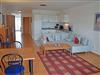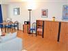 Wohnbereich mit ausziehbarer, moderner Doppelbettschlafcouch (168 x 200 cm), 2 Sesseln, Couchtisch, Anrichte mit Flat-TV (integr. Radiofunktion) und Esstisch mit 4 Stühlen