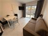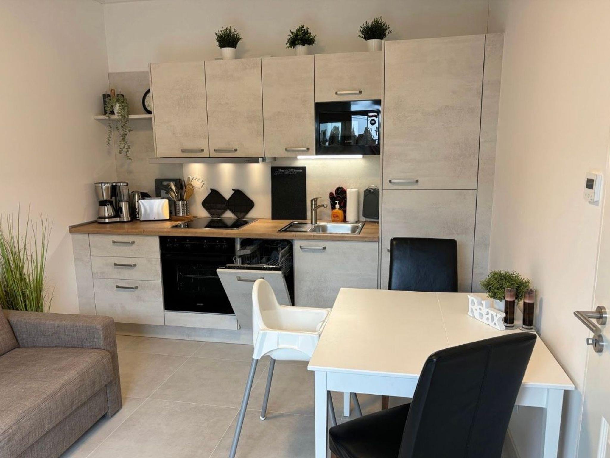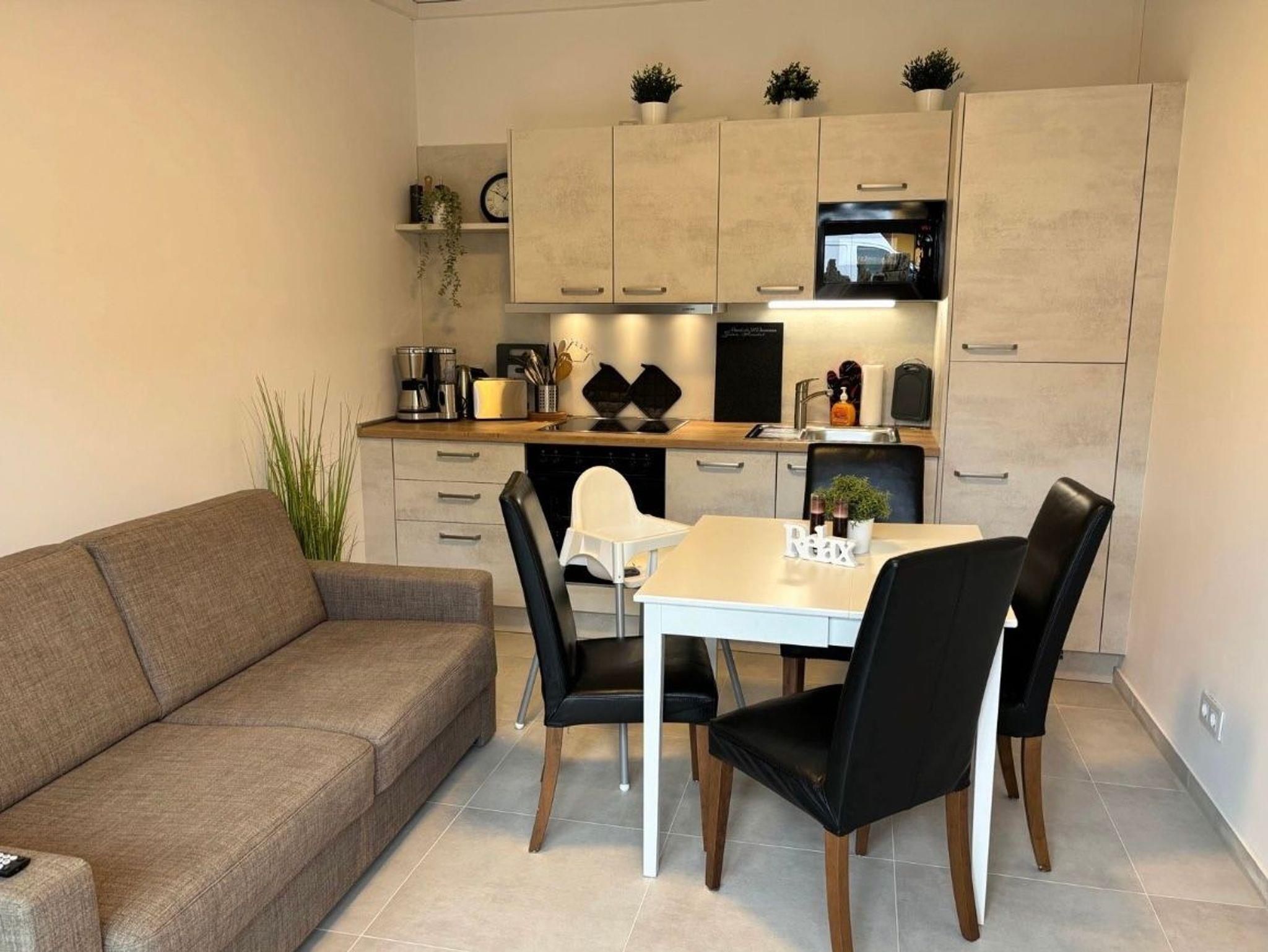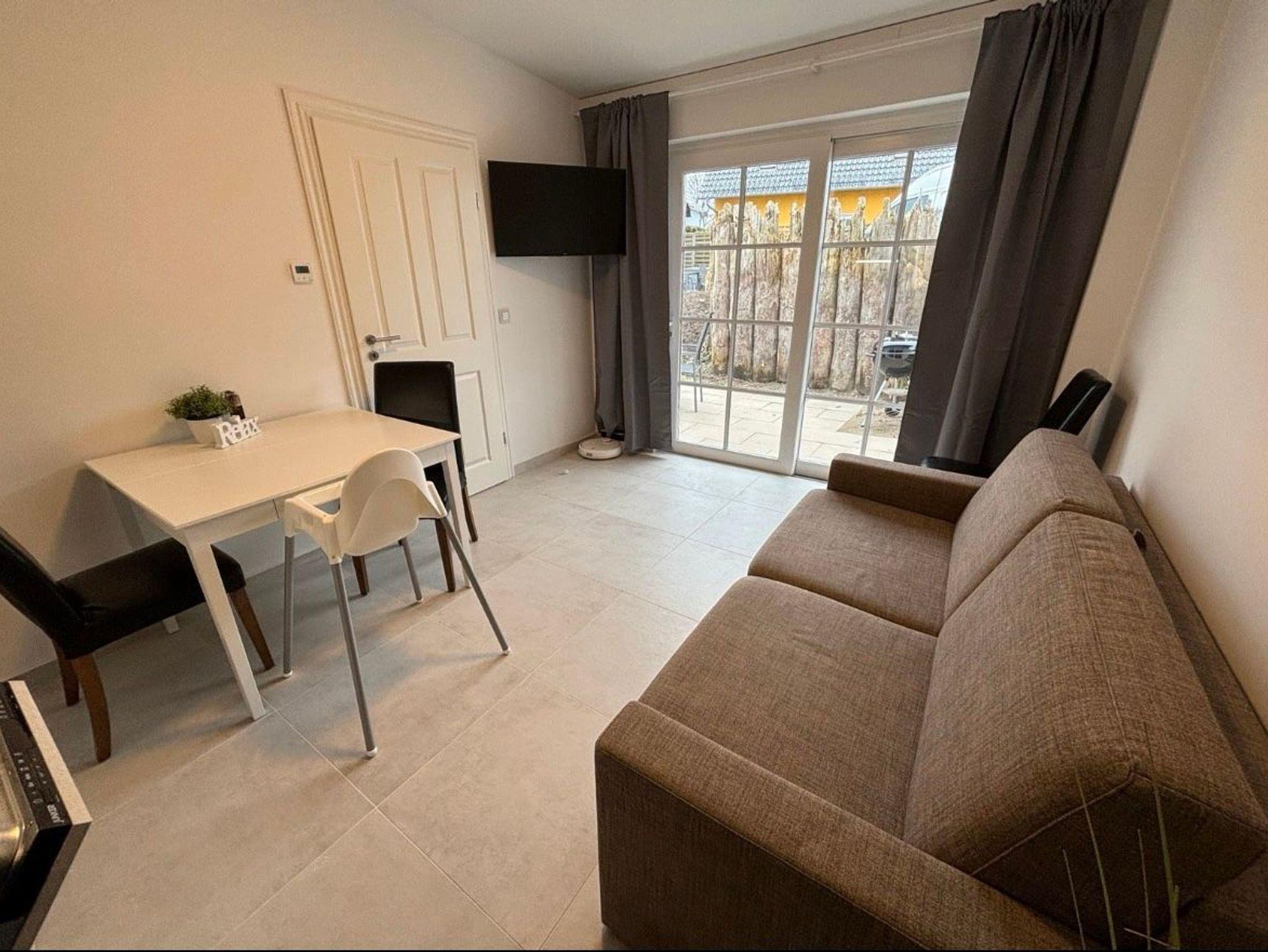 Wohnzimmer mit Schlafsofa (160 x 200), TV und voll ausgestatteter Küchenzeile