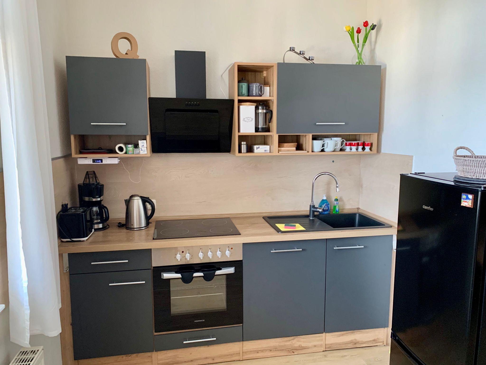 Die Nichtraucher-Ferienwohnung (separater Eingang, 70 qm, 1 Wohnzimmer, 1 Schlafzimmer, Küchenzeile, Bad mit Dusche und WC, WLAN-Internet, max. 4 erwachsene Gäste und ein Kind im Kinderreisebett) ist modern und komfortabel eingerichtet.