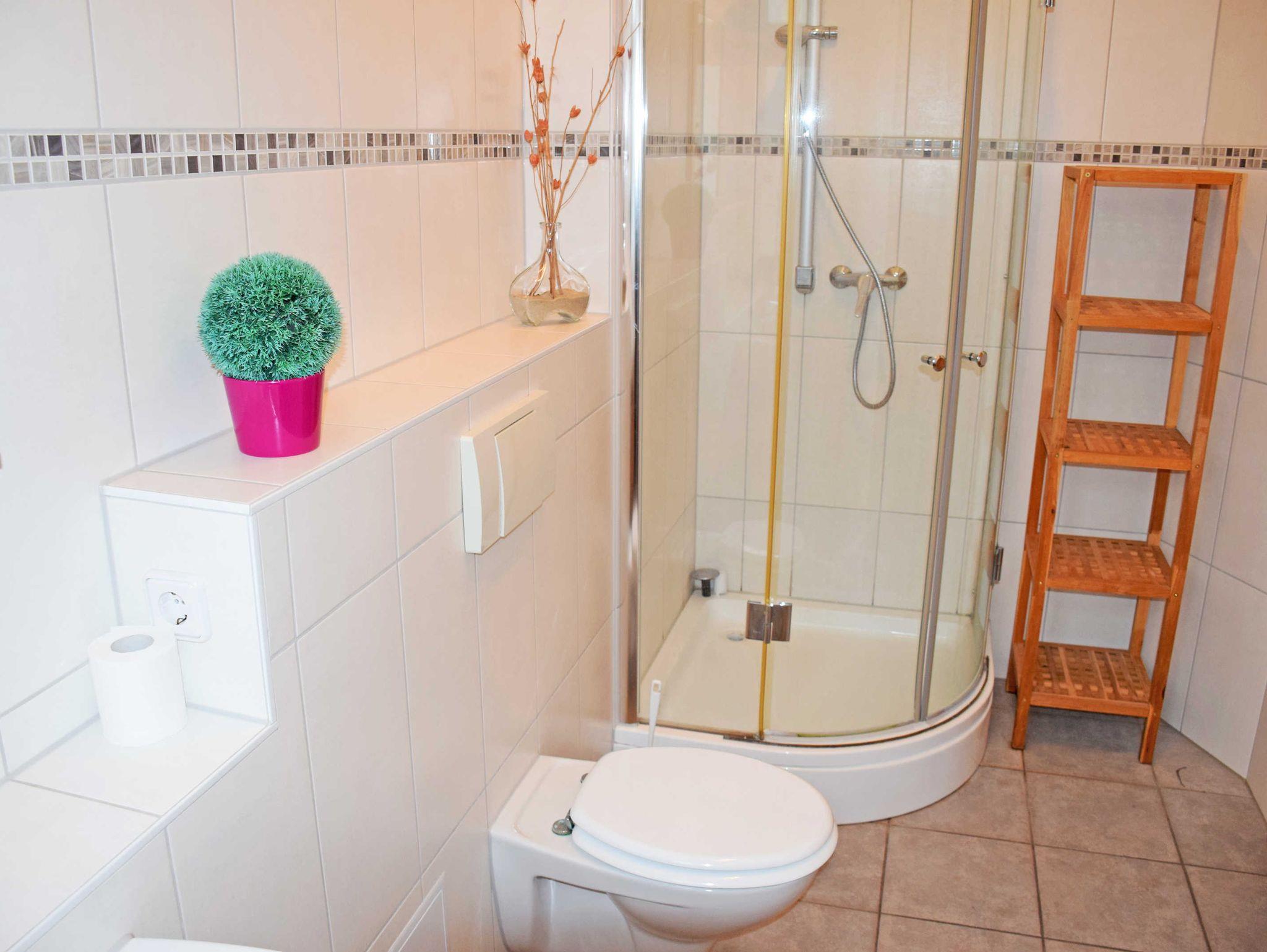1 Bad mit Eckdusche, WC und Fön sowie Fußbodenheizung.