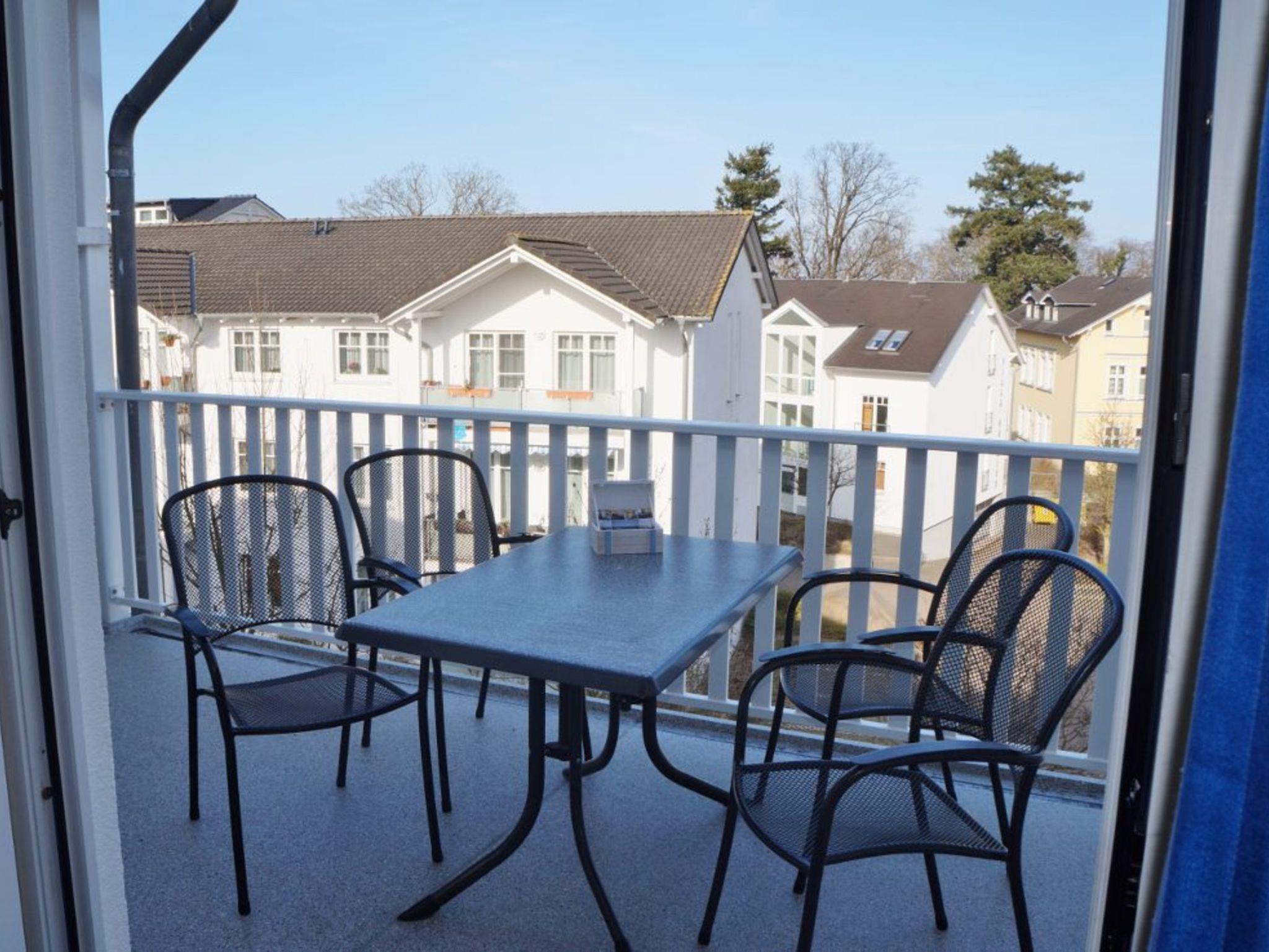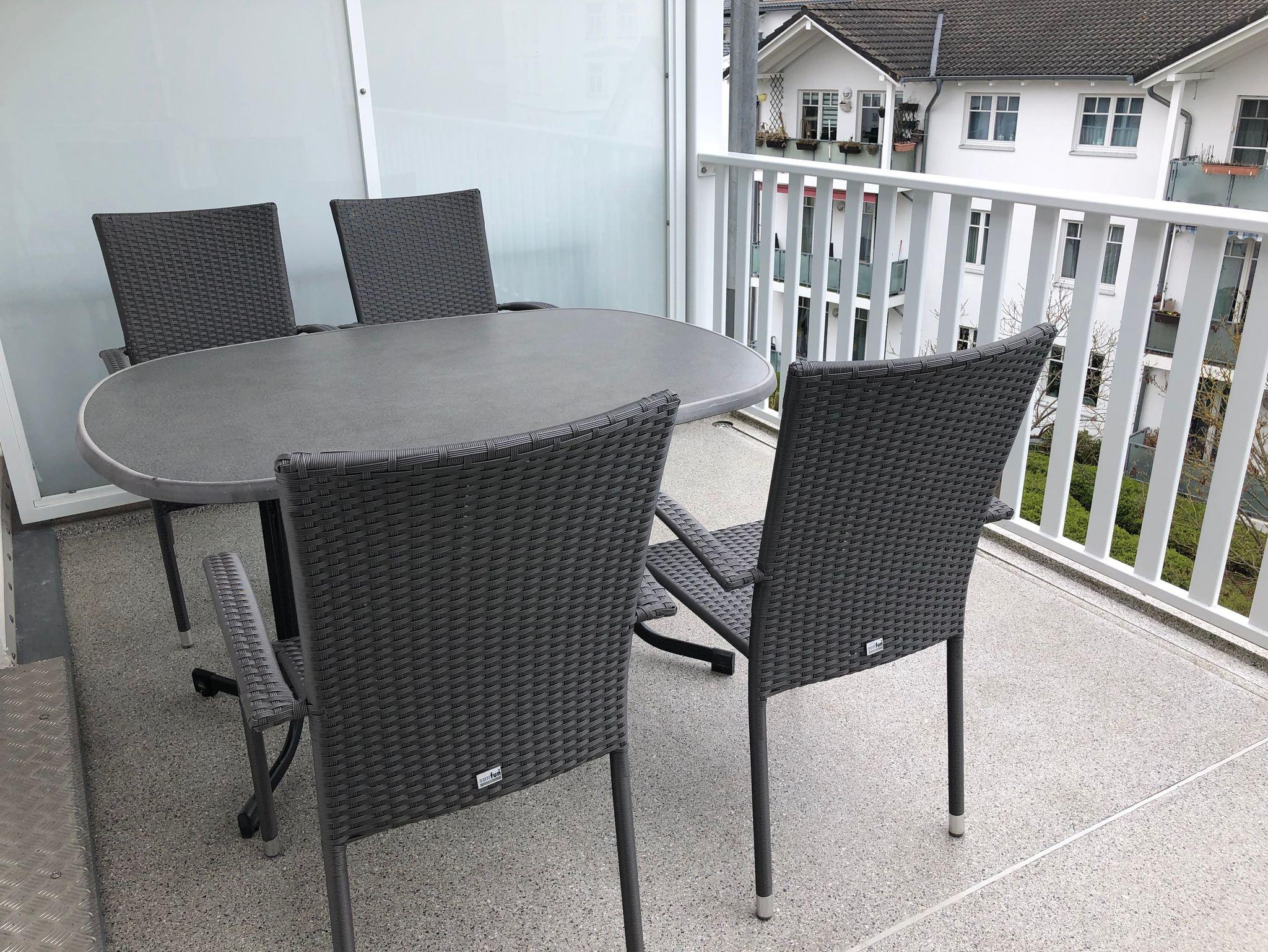 Ein Nordbalkon mit Gartenmöbeln lädt zum Relaxen ein.