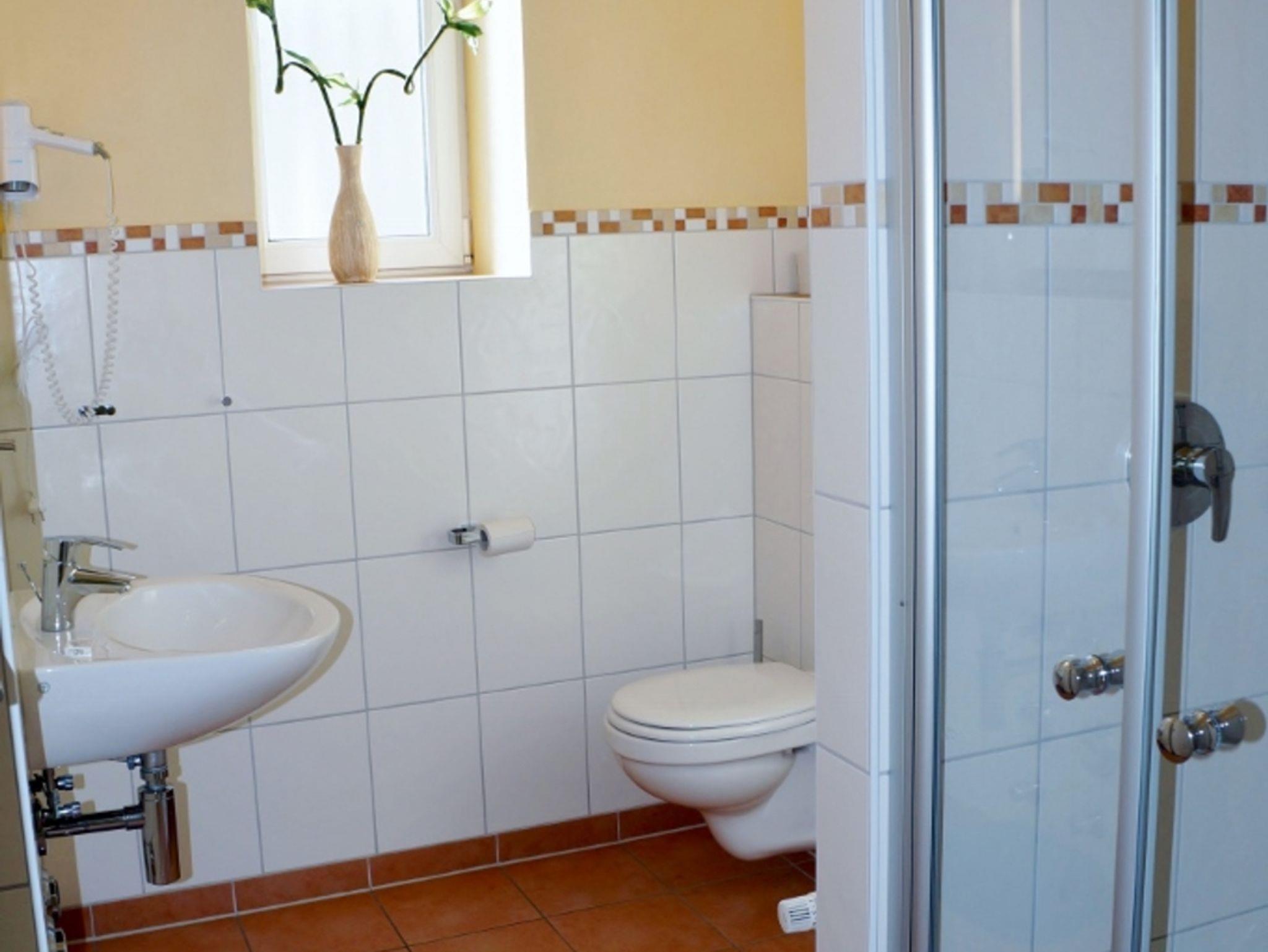 Bad mit Fenster, Dusche mit Echtglasduschtür, Hotelfön und Handtuchwärmekörper