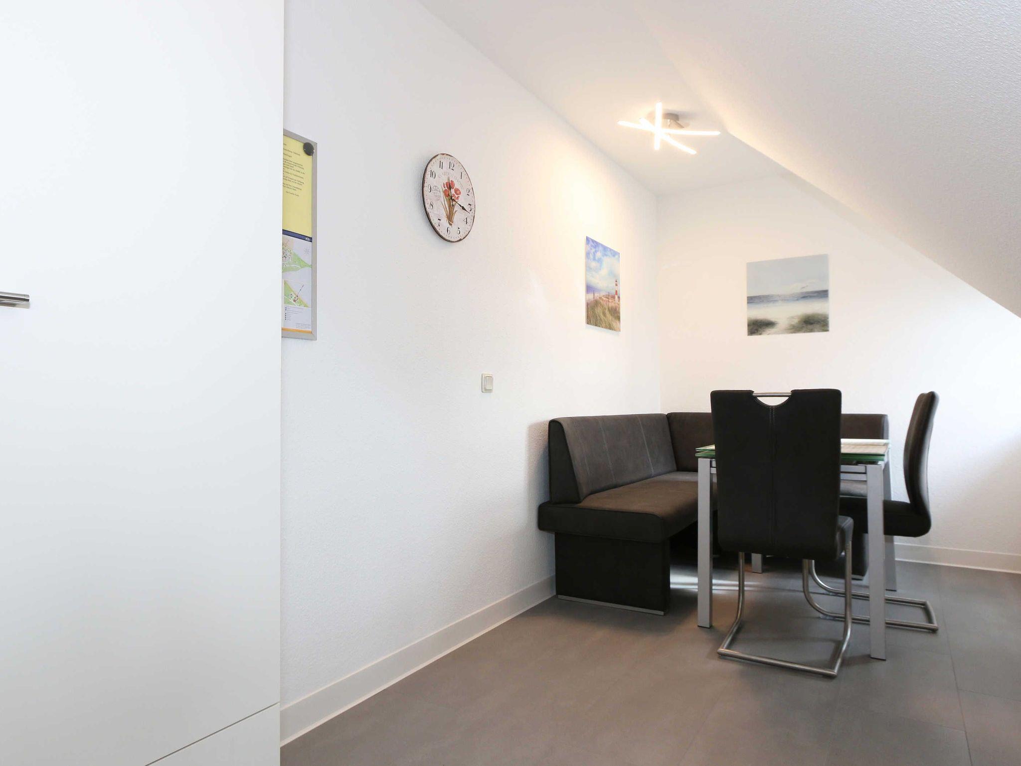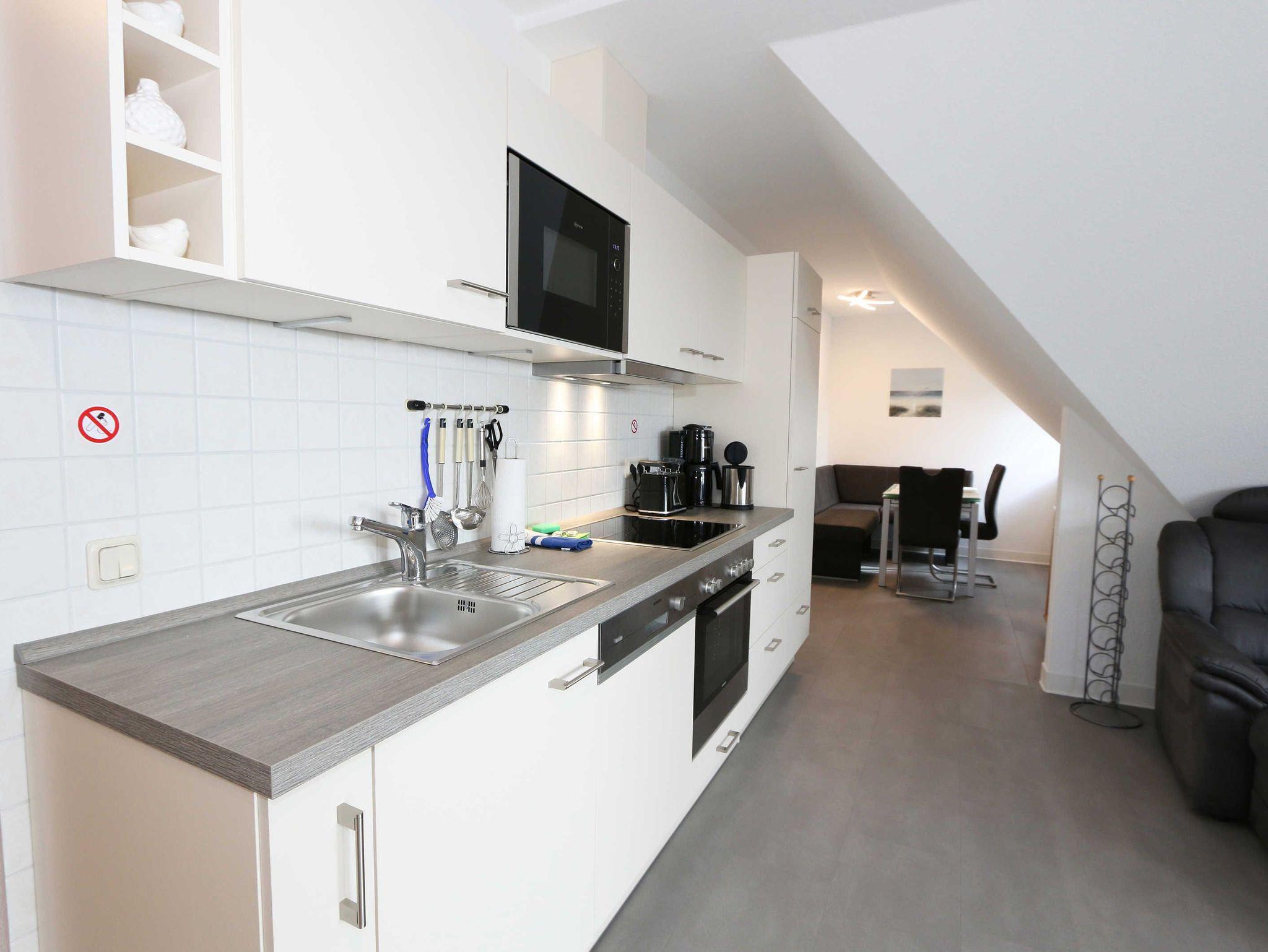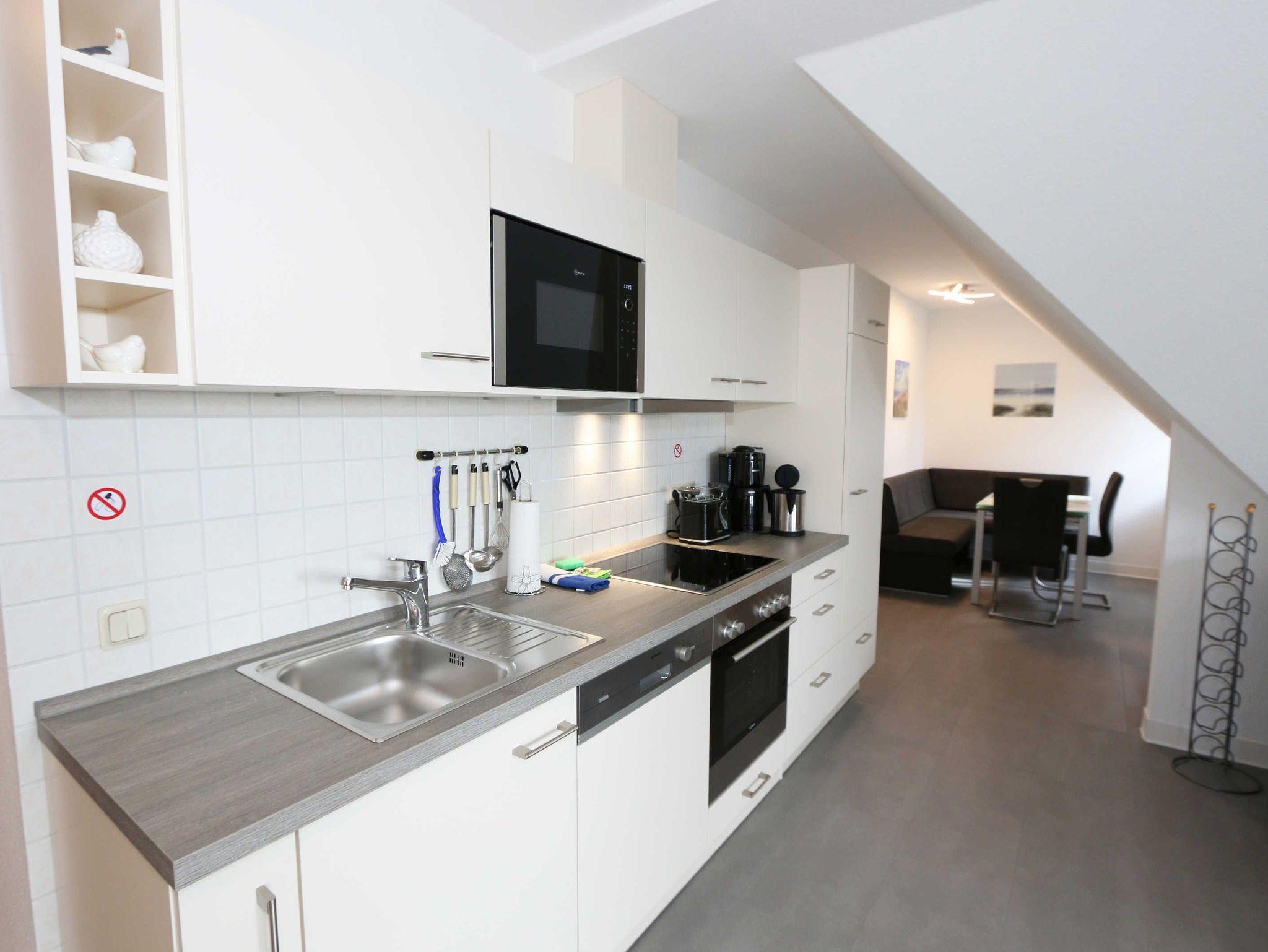 Die lichtdurchflutete, komfortable Nichtraucherwohnung verläuft auf über 70 qm und ist ideal für 2 bis 4 Personen geeignet. Ein Kleinkind (bis 3 Jahre) kann im Kinderreisebett als Aufbettung (5. Person) untergebracht werden. Der vom Wohn- und Schlafbereich zu erreichende Balkon in Richtung Süden lädt zum Verweilen ein und erlaubt es Ihnen die Sonne sowie den Blick auf das Meer zu genießen. Im Rahmen der Renovierung im Februar 2020 wurde in der ganzen Wohnung ein neuer Vinylboden verlegt und eine neue, moderne Küche wurde eingebaut. Die Küchenzeile beinhaltet ein 4-Zonen-Ceranfeld, Backofen, Mikrowelle, Geschirrspüler, Kühlschrank mit Gefrierfach, Kaffeemaschine, Toaster, Wasserkocher sowie diverse Küchenutensilien. Der dazugehörige Essbereich wurde ebenfalls mit neuen Möbeln ausgestattet, hierzu gehören zwei Stühle, ein Glastisch sowie eine Sitzecke. Der Wohnbereich mit einer Couchecke (in wenigen Handgriffen zur 2. Schlafstätte für 2 Personen hergerichtet, 1,20m x 2,00m), ein Couchtisch, eine Leselampe, ein Flachbild-TV mit DVD-Player und CD-Stereoanlage runden das Ganze ab. Das großzügige Schlafzimmer ist mit einem Doppelbett (1,80 m x 2,00 m/HG 2), 2 Nachtschränken, 1 Einzelbett und einem großen Kleiderschrank mit Ganzkörperspiegel ausgestattet. 1 Kinderreisebett (ohne Matratze und Bett Inlett) und 1 Kinderhochstuhl sind für einen kleinen Gast inklusive. Das neu renovierte Bad ist mit einer komfortablen Dusche (1,20m x 0,80m) mit Glasschiebetür, WC sowie Waschtisch mit Unter- und Spiegelschrank ausgestattet. Ein Kosmetikspiegel sowie ein Fön befinden sich ebenso hier. Auch im Urlaub brauchen Sie auf einen Internetzugang (WLAN) in Ihrer Wohnung nicht zu verzichten. Dieser ist inklusive. Ein Parkplatz (Nr.06) gehört zu jeder Wohnung. Ihre Fahrräder können Sie auf dem Areal unter einem überdachten Fahrradständer abstellen. Im Untergeschoss des Hauses befindet sich zum Entspannen eine Sauna (gegen Gebühr) sowie für die sportliche Betätigung ein Tischtennisraum. Waschmaschine und Trockner können Sie gegen Gebühr nutzen. Die Erstausstattung eines Wäschepaketes (komplette Bettwäsche, 1 Duschhandtuch, 2 kleine Handtücher) können Sie bis 14 Tage vor Anreise gegen einen Aufpreis dazu buchen oder jedoch Ihre eigenen mitbringen. Ab 2 gebuchten Paketen erhalten Sie einmalig 1 Geschirrhandtuch und 1 Duschvorleger hinzu. Für Ihre Sicherheit in der Wohnung sorgen regelmäßig gewarteten Rauchmelder. Für einen angenehmen Schlaf im Dunkeln sorgen die vorhandenen Rollläden.