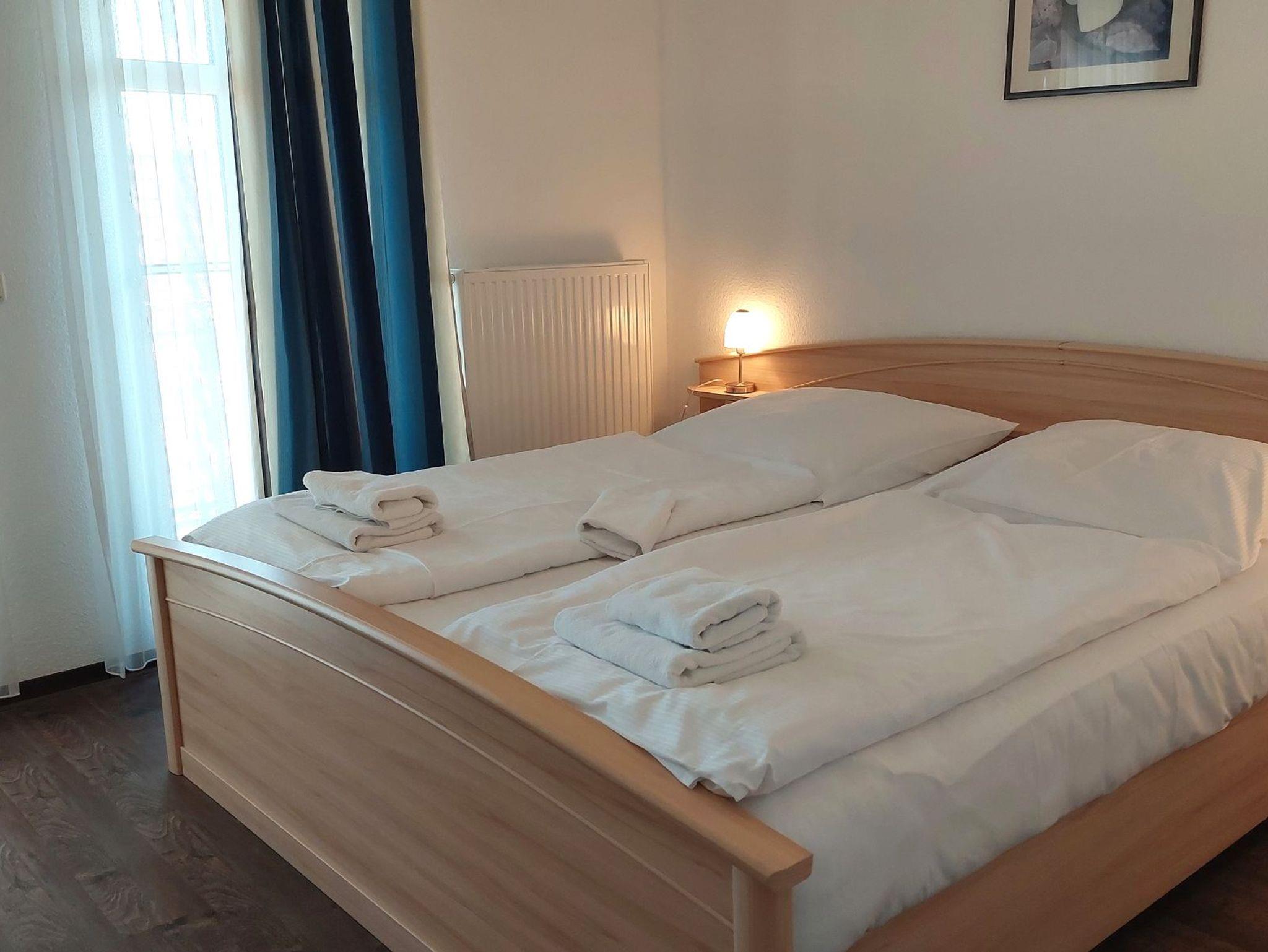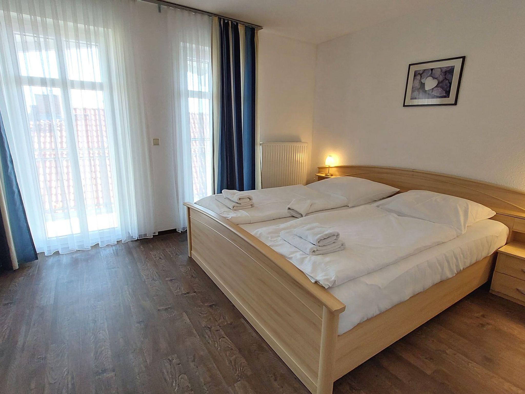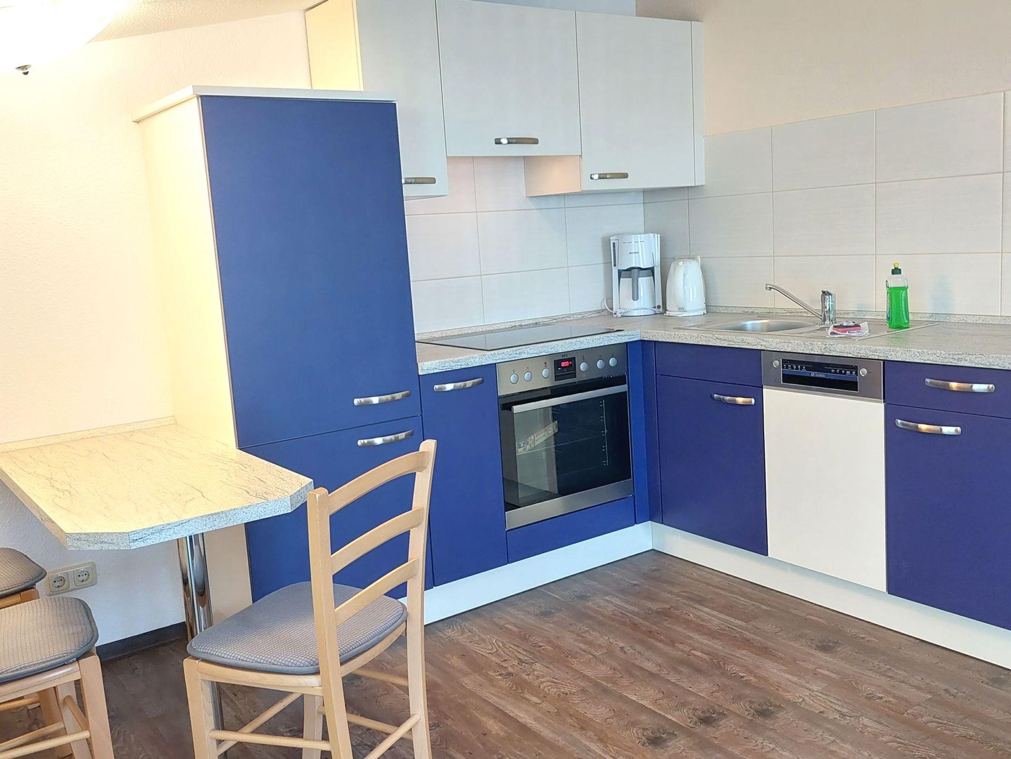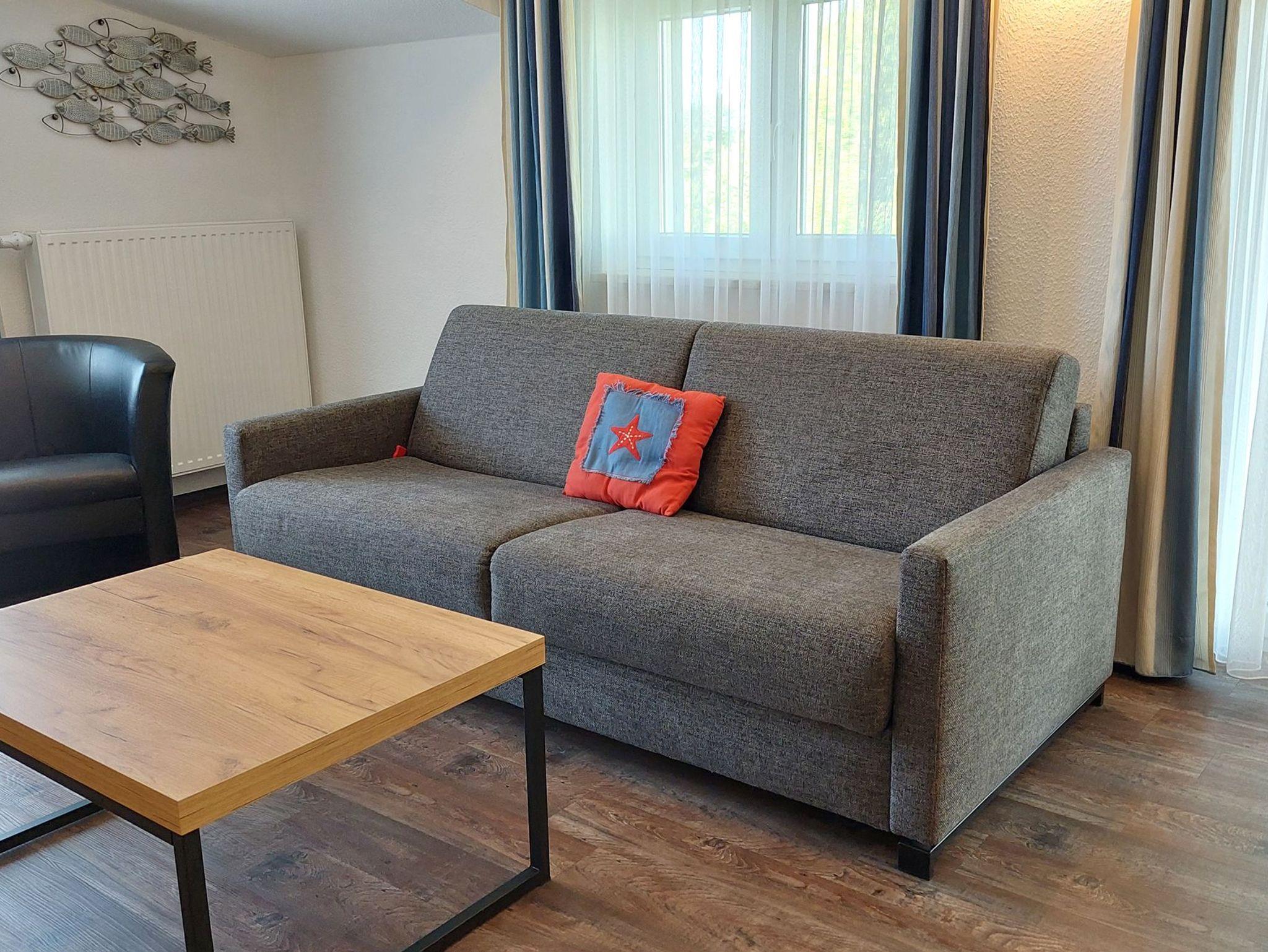 Diese freundliche Wohnung ist aufgeteilt in einen Wohnraum mit Balkon und integrierter Küchenzeile, ein Schlafzimmer ebenso mit Balkon und ein Duschbad mit Waschtisch und WC. Das Wohnzimmer begrüßt Sie mit einem Schlafsofa und Sessel sowie Flachbild-TV. Das Schlafzimmer verfügt über ein Doppelbett (1,80m x 2m) sowie einen Kleiderschrank. Die Küchenzeile ist mit Backofen, Geschirrspüler, Cerankochfeld, Kühlschrank mit kleinem Gefrierfach, Cerankochfeld, Mikrowelle, Kaffeemaschine, Wasserkocher und Toaster ausgestattet. Highlights: Kostenfreies WLAN sowie ein frei wählbarer PKW-Stellplatz direkt am Haus.