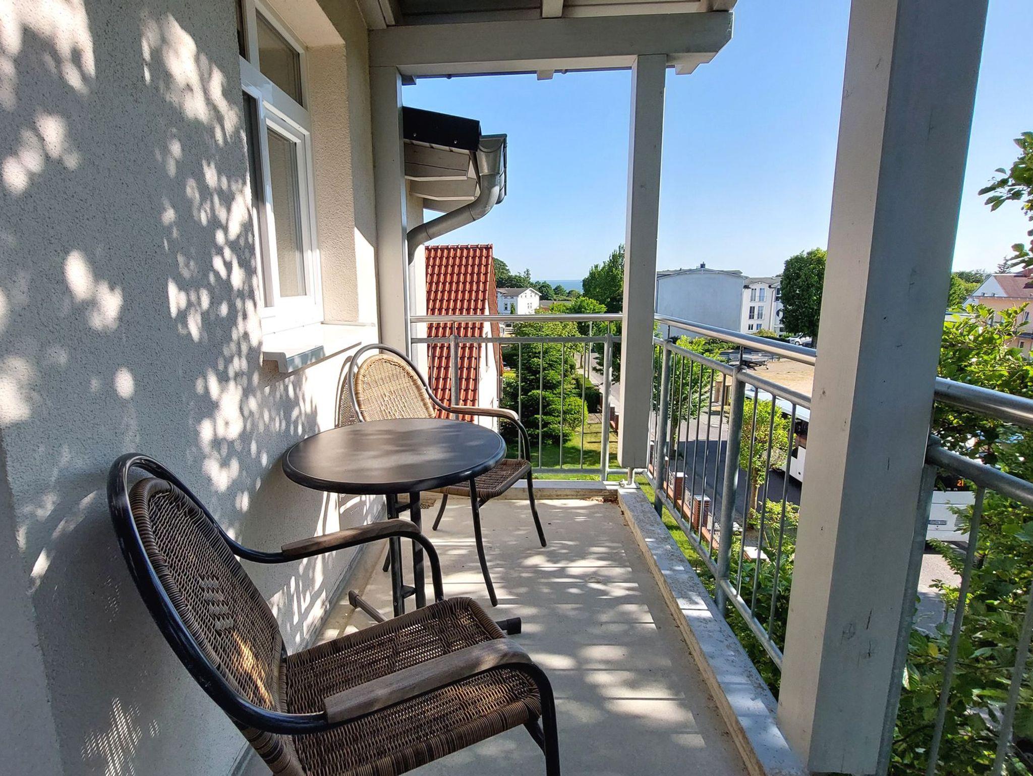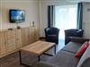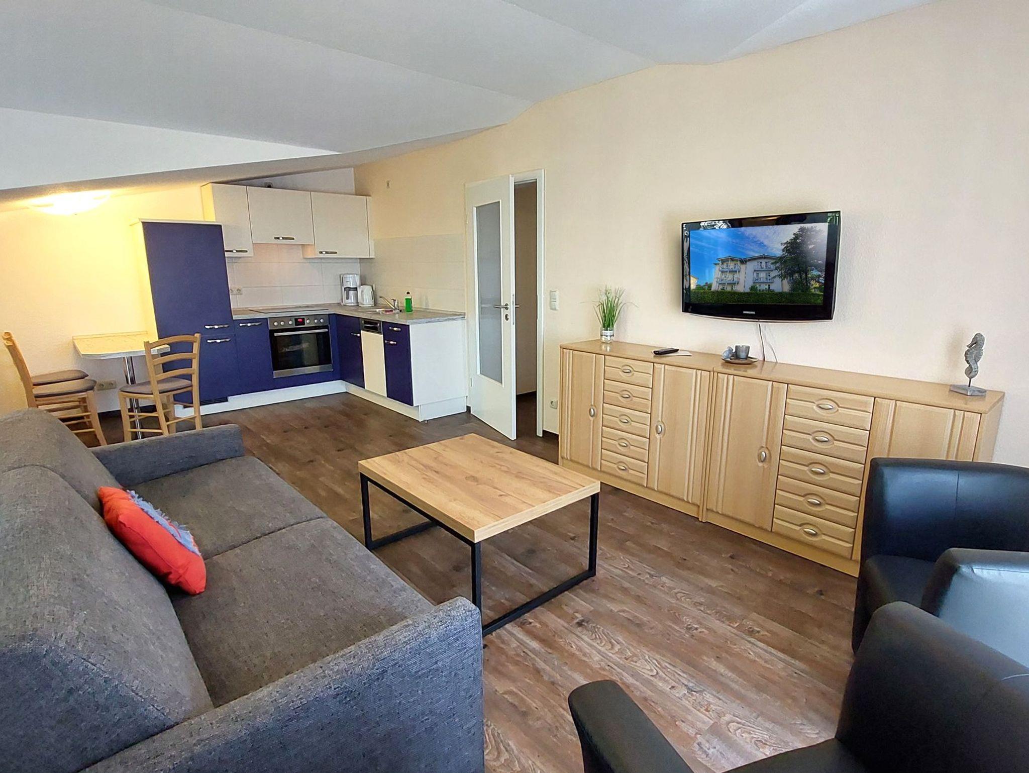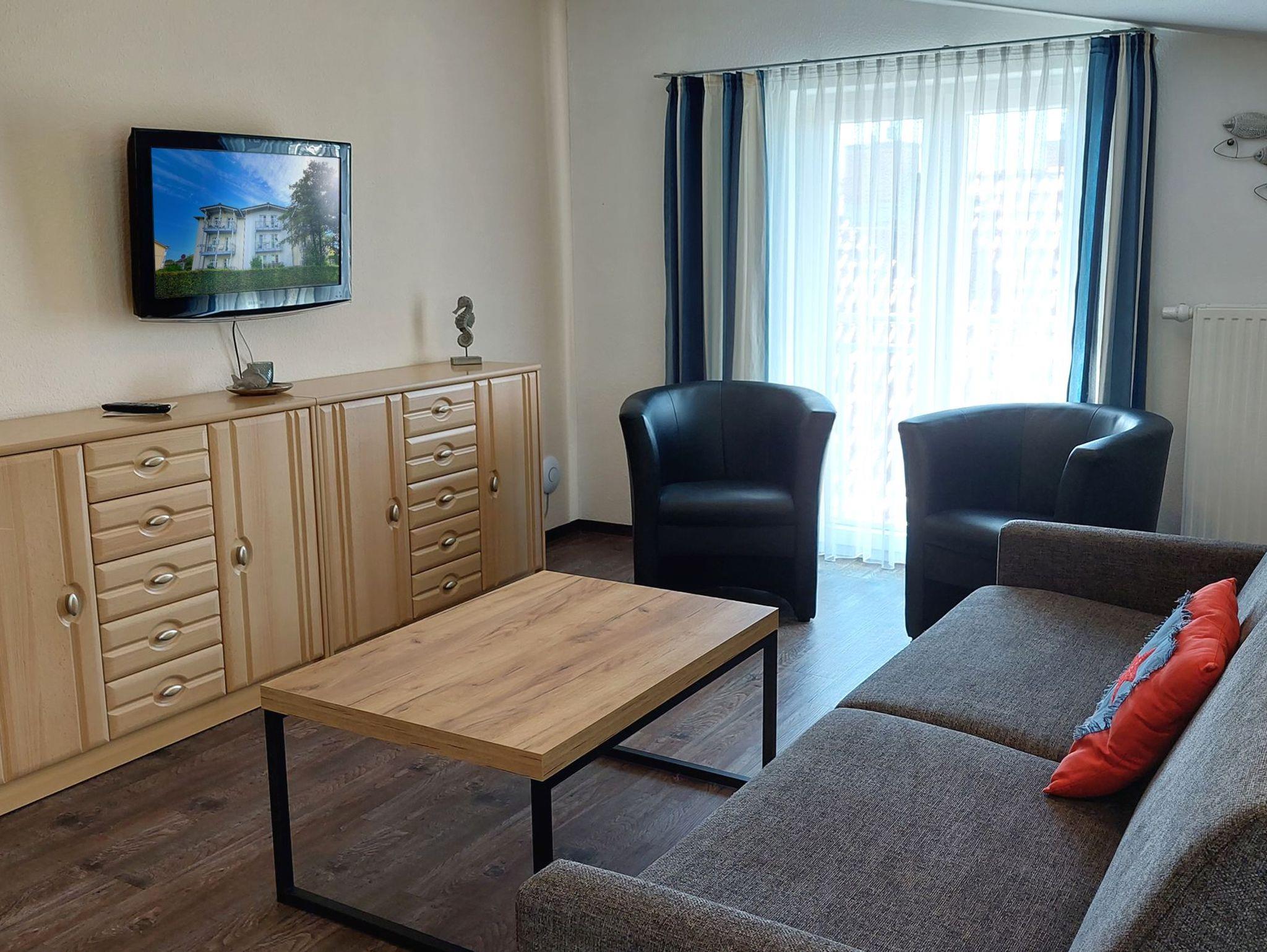 Diese freundliche Wohnung ist aufgeteilt in einen Wohnraum mit Balkon und integrierter Küchenzeile, ein Schlafzimmer ebenso mit Balkon und ein Duschbad mit Waschtisch und WC. Das Wohnzimmer begrüßt Sie mit einem Schlafsofa und Sessel sowie Flachbild-TV. Das Schlafzimmer verfügt über ein Doppelbett (1,80m x 2m) sowie einen Kleiderschrank. Die Küchenzeile ist mit Backofen, Geschirrspüler, Cerankochfeld, Kühlschrank mit kleinem Gefrierfach, Cerankochfeld, Mikrowelle, Kaffeemaschine, Wasserkocher und Toaster ausgestattet. Highlights: Kostenfreies WLAN sowie ein frei wählbarer PKW-Stellplatz direkt am Haus.