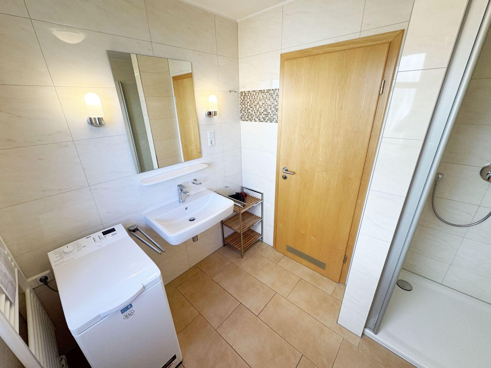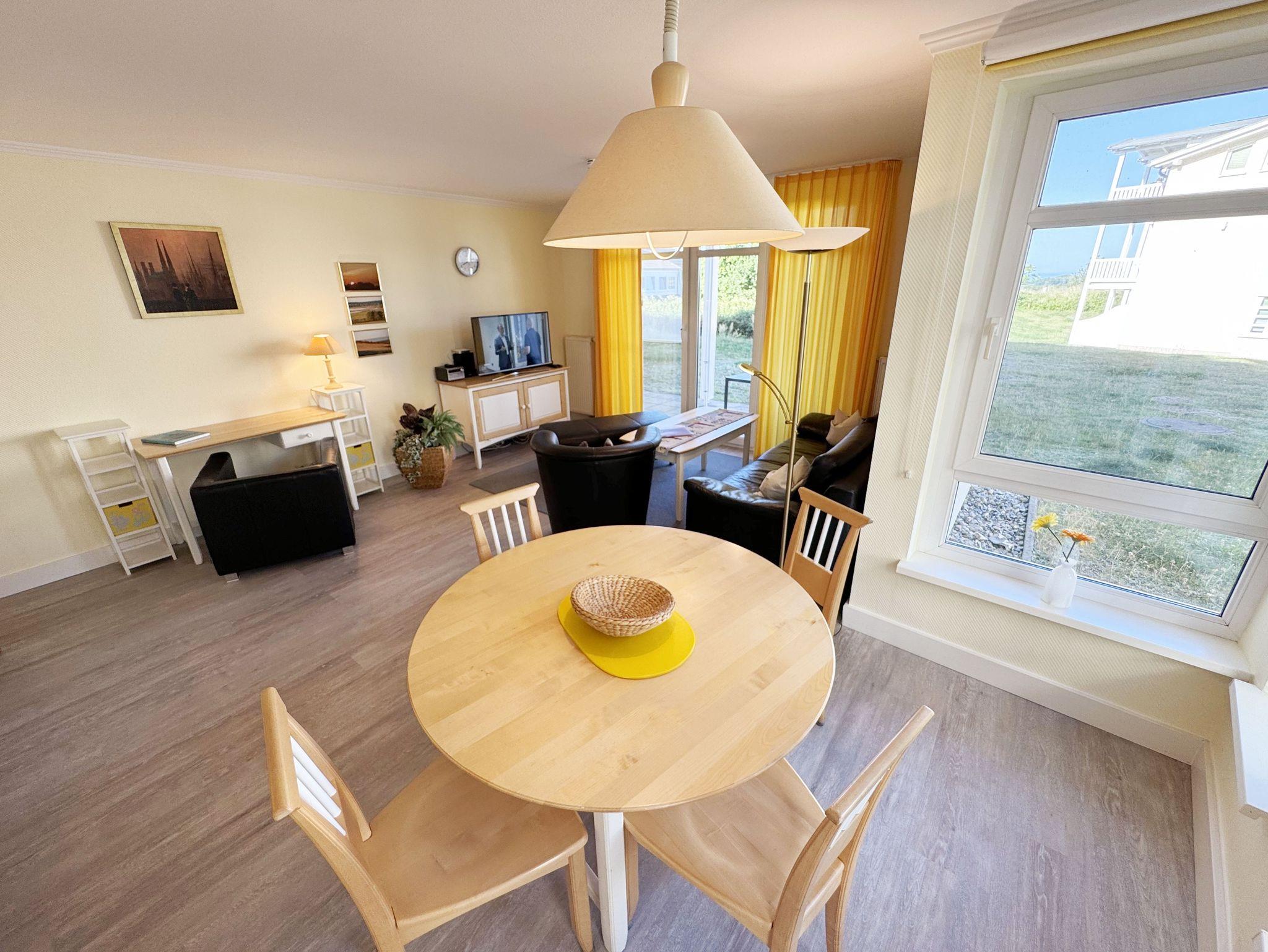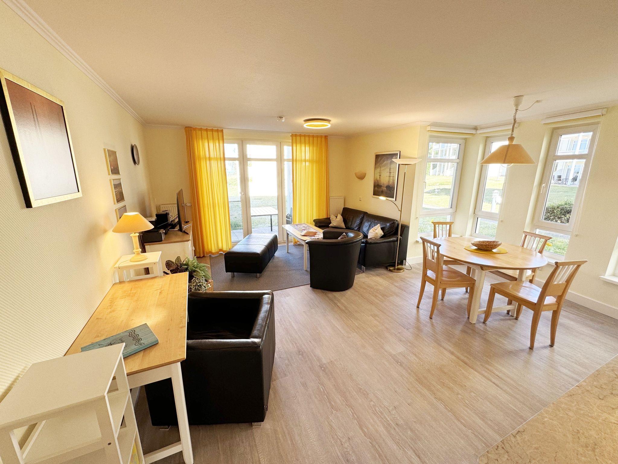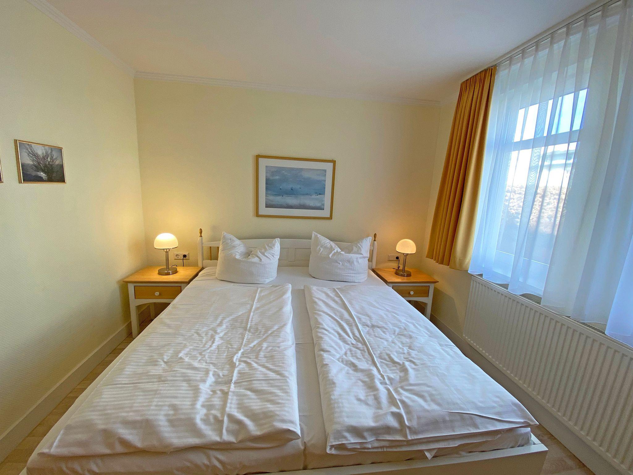 Unsere komfortable Nichtraucherwohnung von ca. 60 qm für 2 bis max. 4 Erwachsene und 1 Kleinkind bis 3 Jahre im Kinderreisebett verfügt über ein Schlafzimmer mit Doppelbett (1,80m x 2,00m), Nachttischkonsolen und Kleiderschrank sowie ein zweites Schlafzimmer mit 2 Einzelbetten (2 x 0,90 m x 2,00 m) und einen weiteren Kleiderschrank. Der Wohnbereich ist mit einem 2-Sitzer, Sessel, Leselampe, TV-Board, Smart-TV, Blu-Ray-Player und Ministereoanlage mit DAB-Radio eingerichtet. Von hier aus gelangen Sie auf die bestuhlte Terrasse und genießen den einmaligen Blick auf die Ostsee. Das Bad ist mit einer Dusche, WC, Waschmaschine mit Trocknerfunktion und Fön ausgestattet. Die Küchenzeile bietet einen Esstisch und 4 Stühlen, Geschirrspüler, Kühlschrank mit Eisfach, 4-Zonen-Ceranfeld mit Backofen, Toaster, Kaffeemaschine, Wasserkocher und diverse Küchenutensilien. Insektenschutzgitter sind vorhanden. WLAN ist für Sie inklusive nutzbar!! Ein PKW-Stellplatz (Nr. 03) sowie eine Unterstellmöglichkeit für Ihre Fahrräder ist am Haus vorhanden. Kinderreisebett (ohne Matratze und Bett Inlett) und Hochstuhl können für unsere kleinen Gäste gegen eine Gebühr gestellt werden. In der Wohnung sind keine Haustiere erlaubt! Die Erstausstattung eines Wäschepaketes (komplette Bettwäsche, 1 Duschhandtuch, 1 kleines Handtuch) können Sie bis 14 Tage vor der Anreise gegen einen Aufpreis dazu buchen oder durch eigene ergänzen. Ab 2 gebuchten Paketen erhalten Sie einmalig 1 Geschirrtuch und einen Duschvorleger dazu.