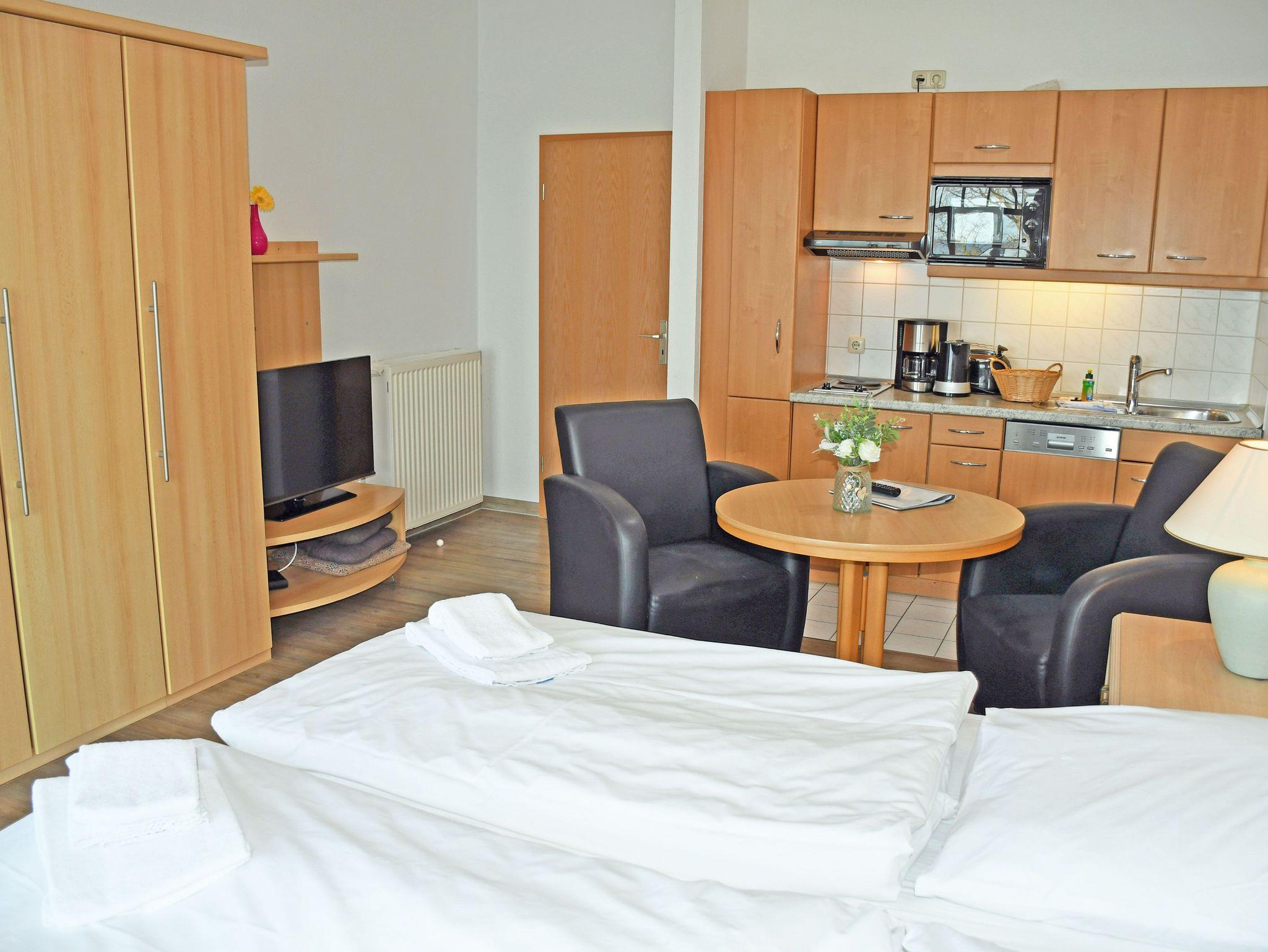 Unsere ruhig gelegenen, hellen und lichtdurchfluteten 1-Raum-Ferienwohnungen mit Balkon sind wie folgt ausgestattet:
