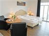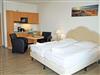 kombinierter Wohn-/Schlafraum mit Doppelbett (180 x 200 cm), Nachttischen, großem Kleiderschrank, Tisch mit 2 Ledersesseln, Anrichte mit TV, Kofferablage