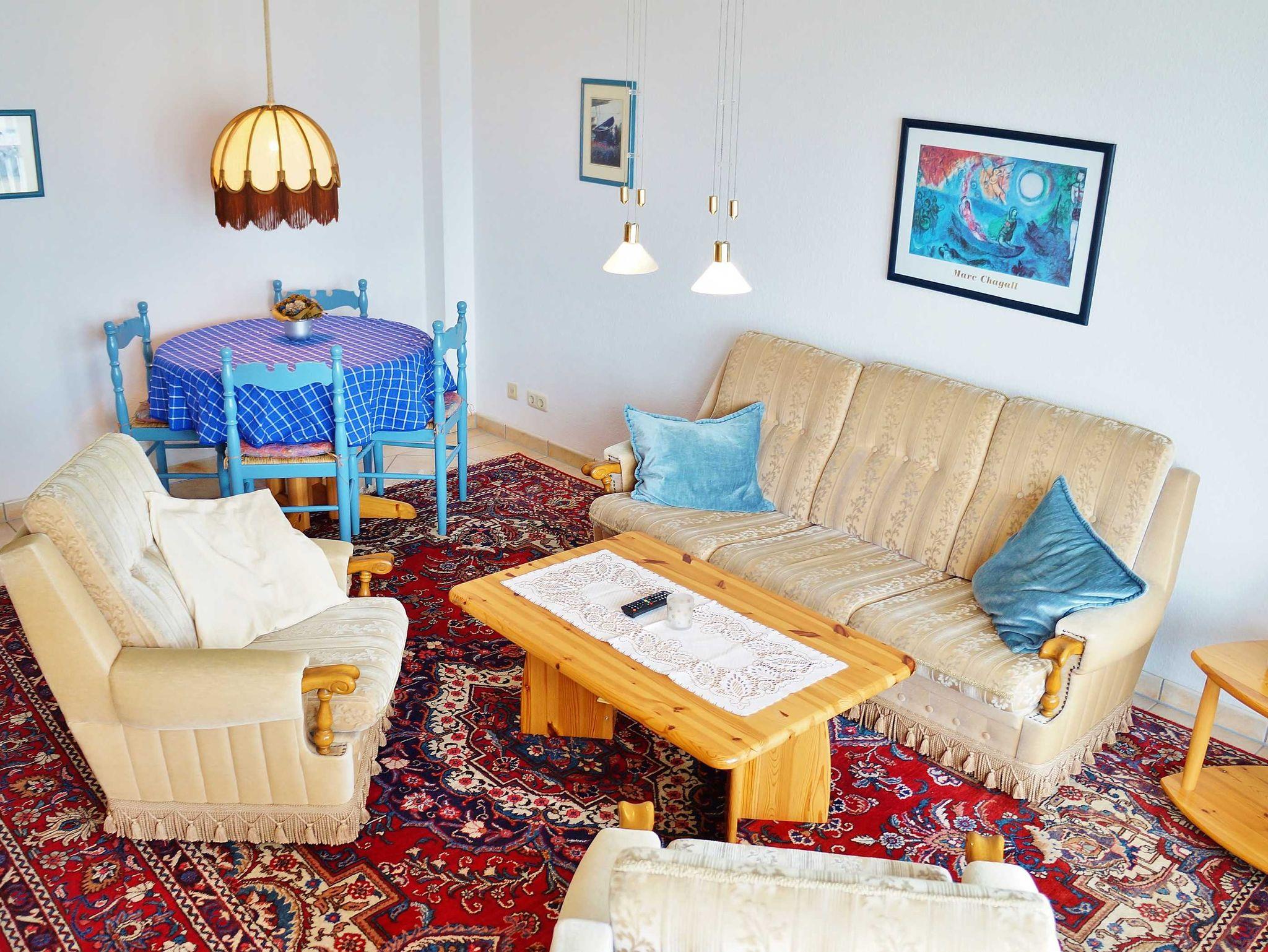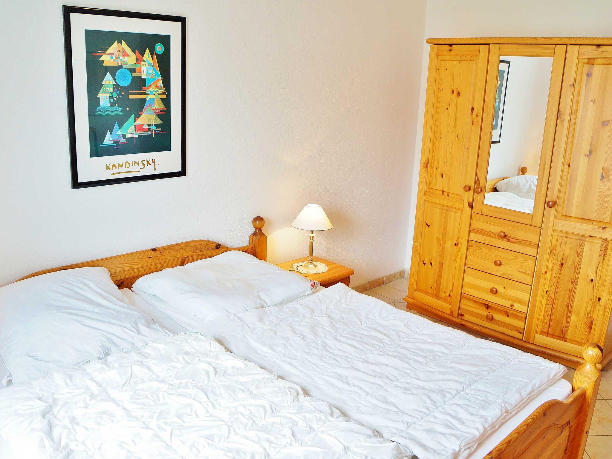 Die Wohnung unterteilt sich wie folgt: 1 Wohnraum mit Sitzecke (Sofa und Sessel), zusätzlich steht noch ein Tisch mit Stühlen als Essplatz zur Verfügung, TV, 2 Schlafzimmer (einmal mit Doppelbett und einmal mit 2 Einzelbetten),abgeschlossene Küche mit Backofen und Ceranfeld - Badezimmer mit Dusche und WC und ein Balkon mit Gartenmöbeln.